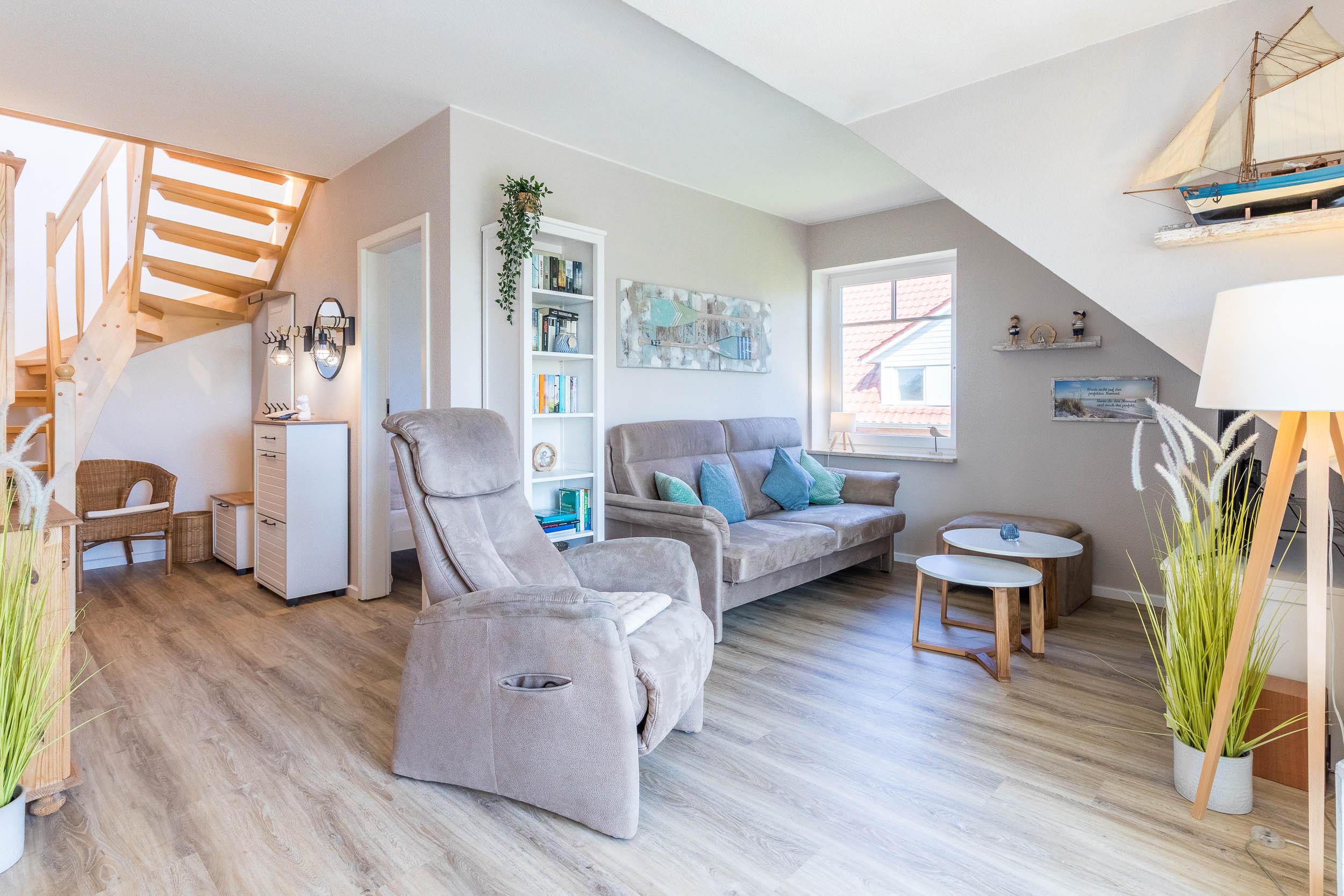 Diese geschmackvoll eingerichtete Wohnung begrüßt Sie in der unteren Wohnebene mit einem Wohnbereich mit maritimen Flair. So finden Sie Sie hier eine farblich abgestimmte Couchgarnitur mit SAT-TV auf der einen Seite des Raumes, während auf der anderen Seite eine sehr gut ausgestattete Wohnküche mit gemütlicher Essecke auf Sie wartet.