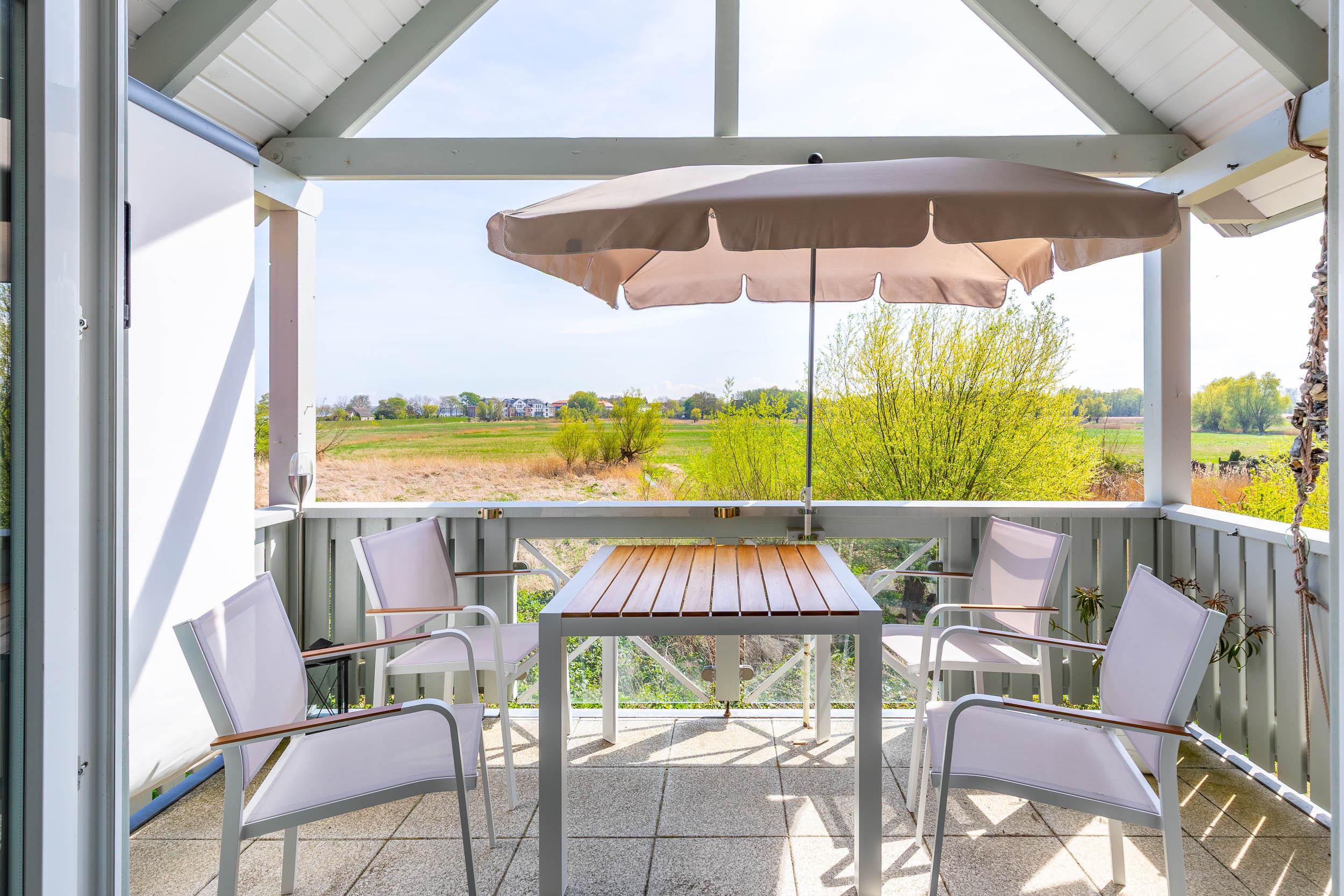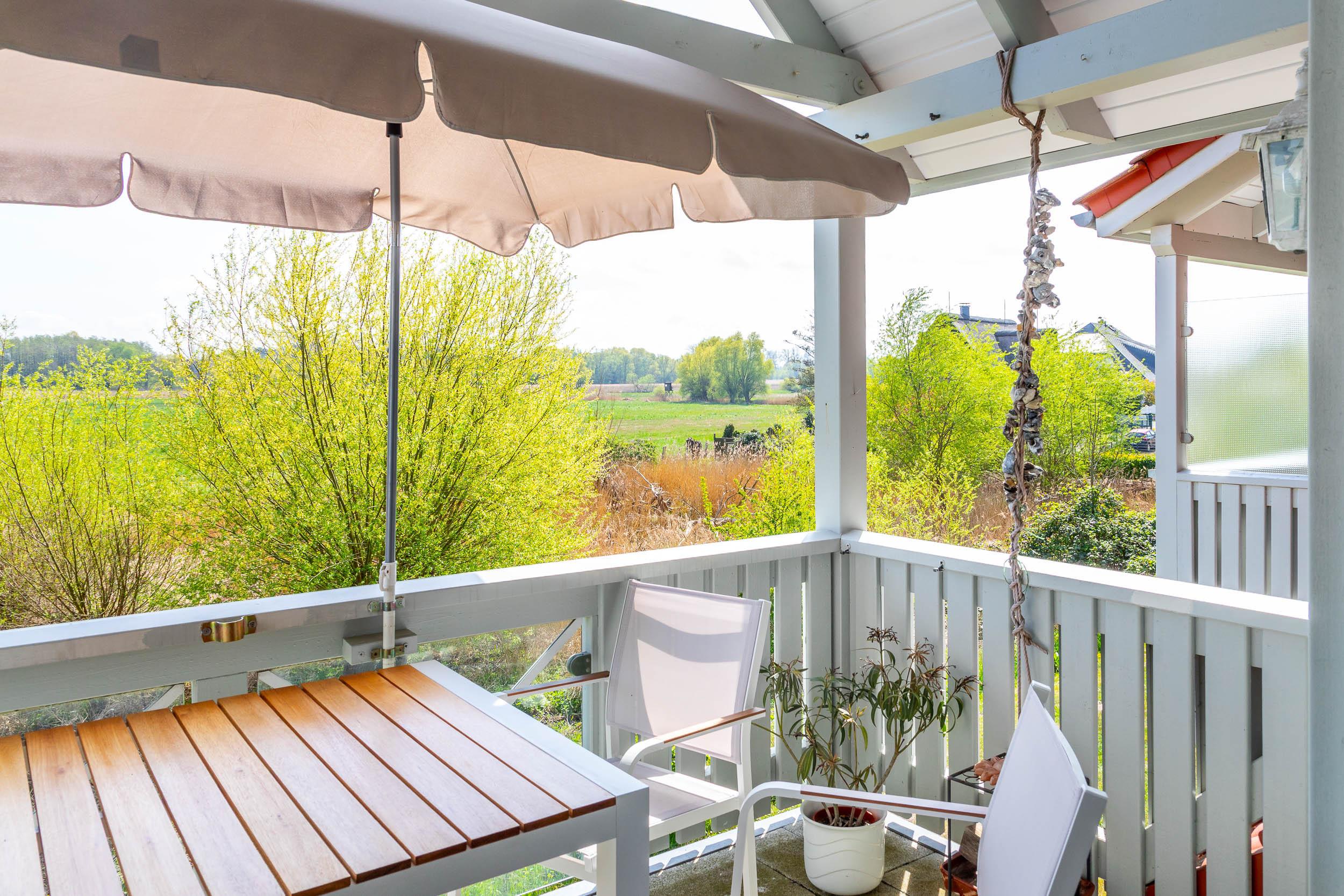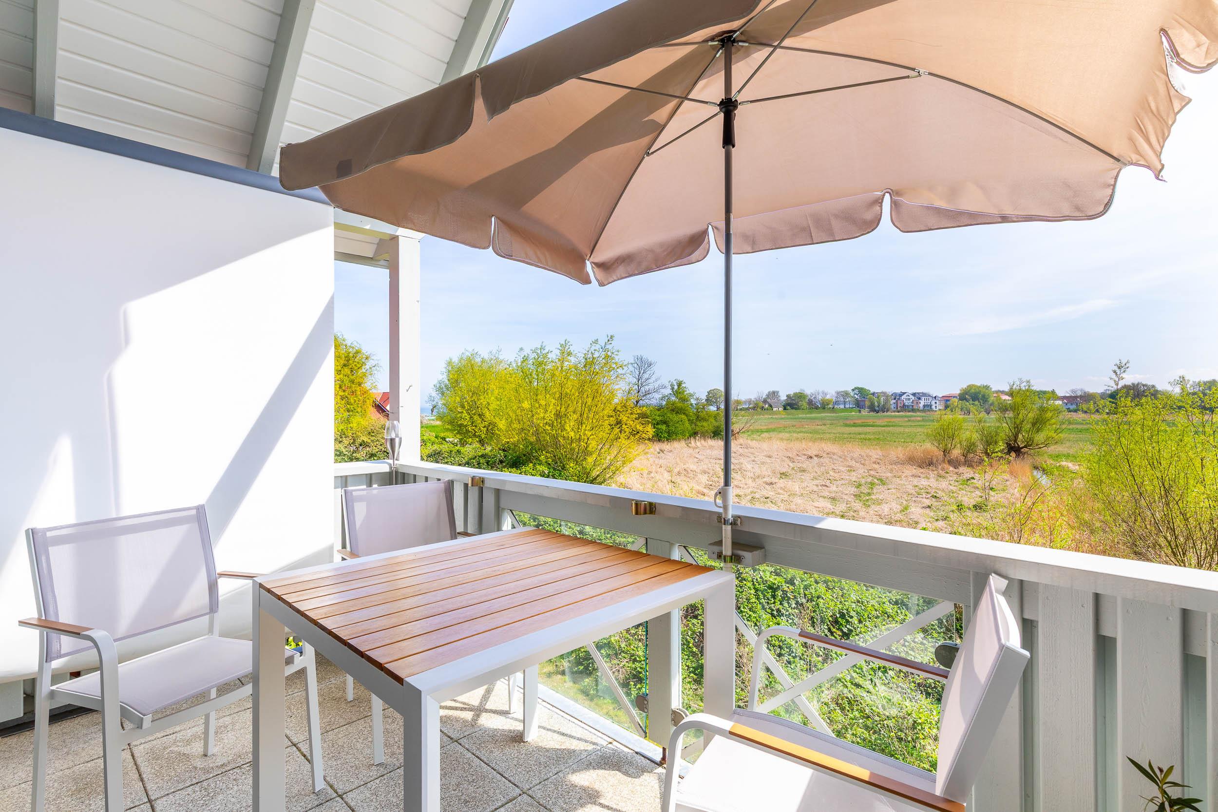 Der nach Süd-Ost ausgerichtete Balkon, welchen Sie vom Wohnbereich aus erreichen, ermöglicht einen herrlichen Blick auf das Haff. Seitlich können Sie vom Balkon aus sogar auf die Ostsee schauen.