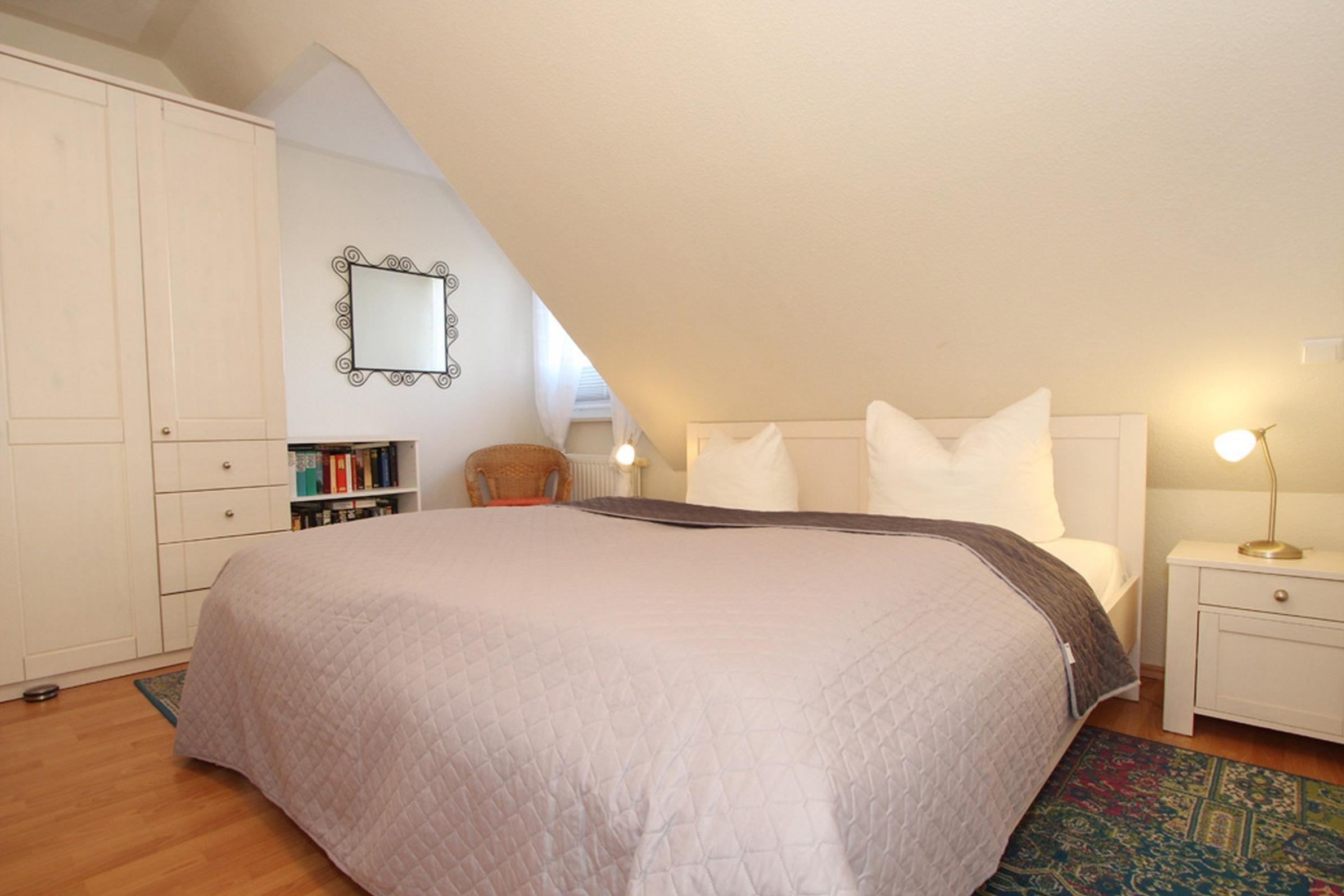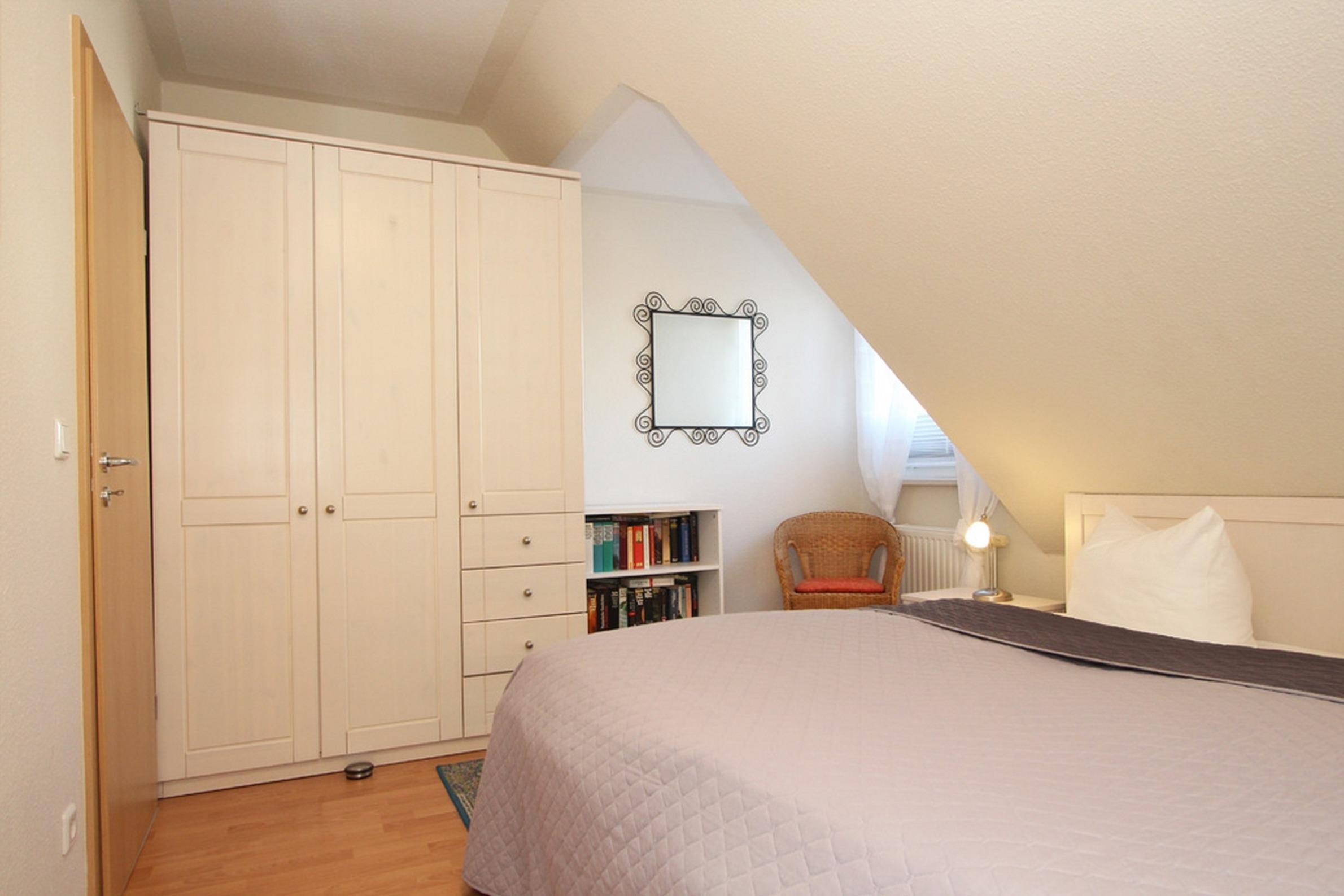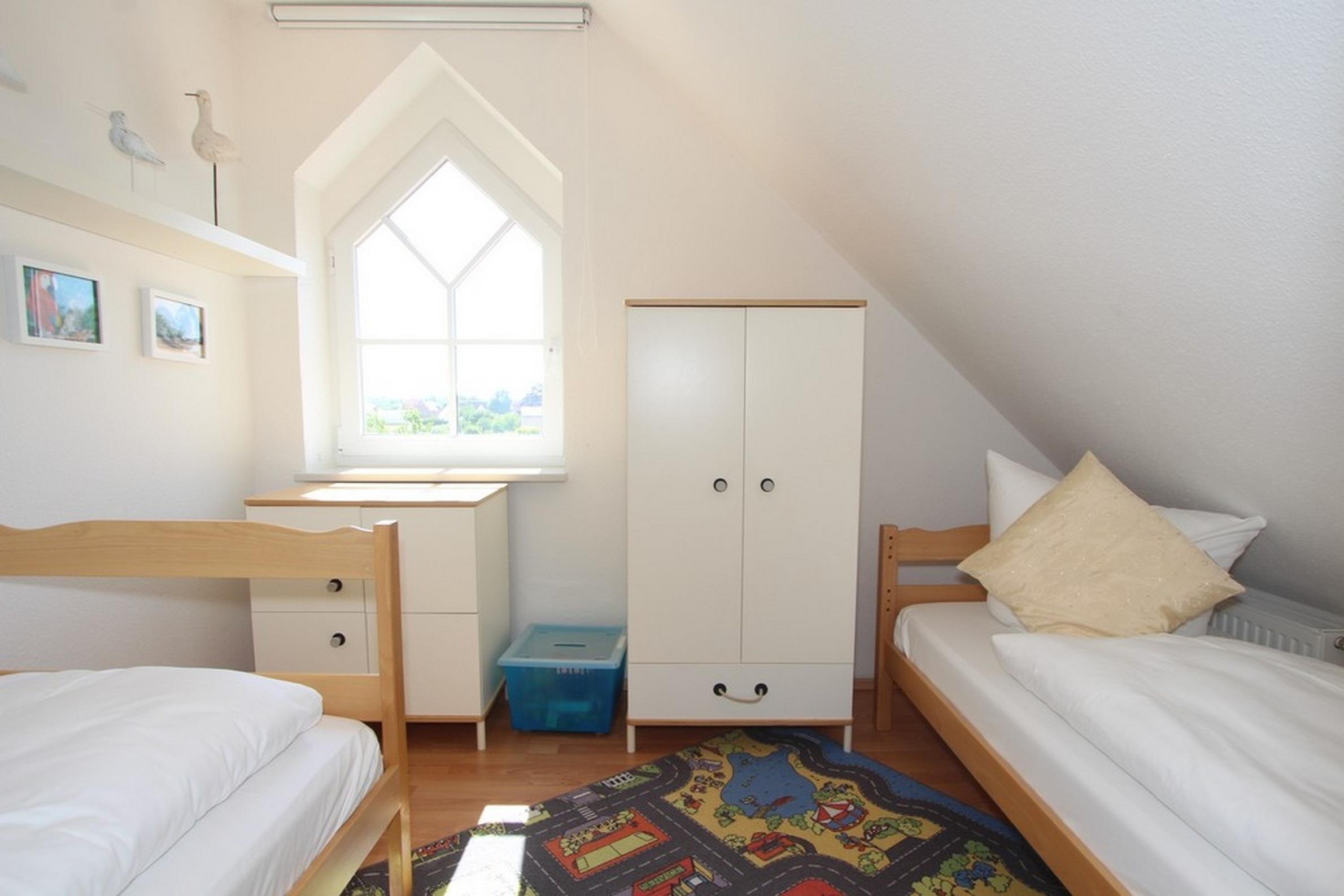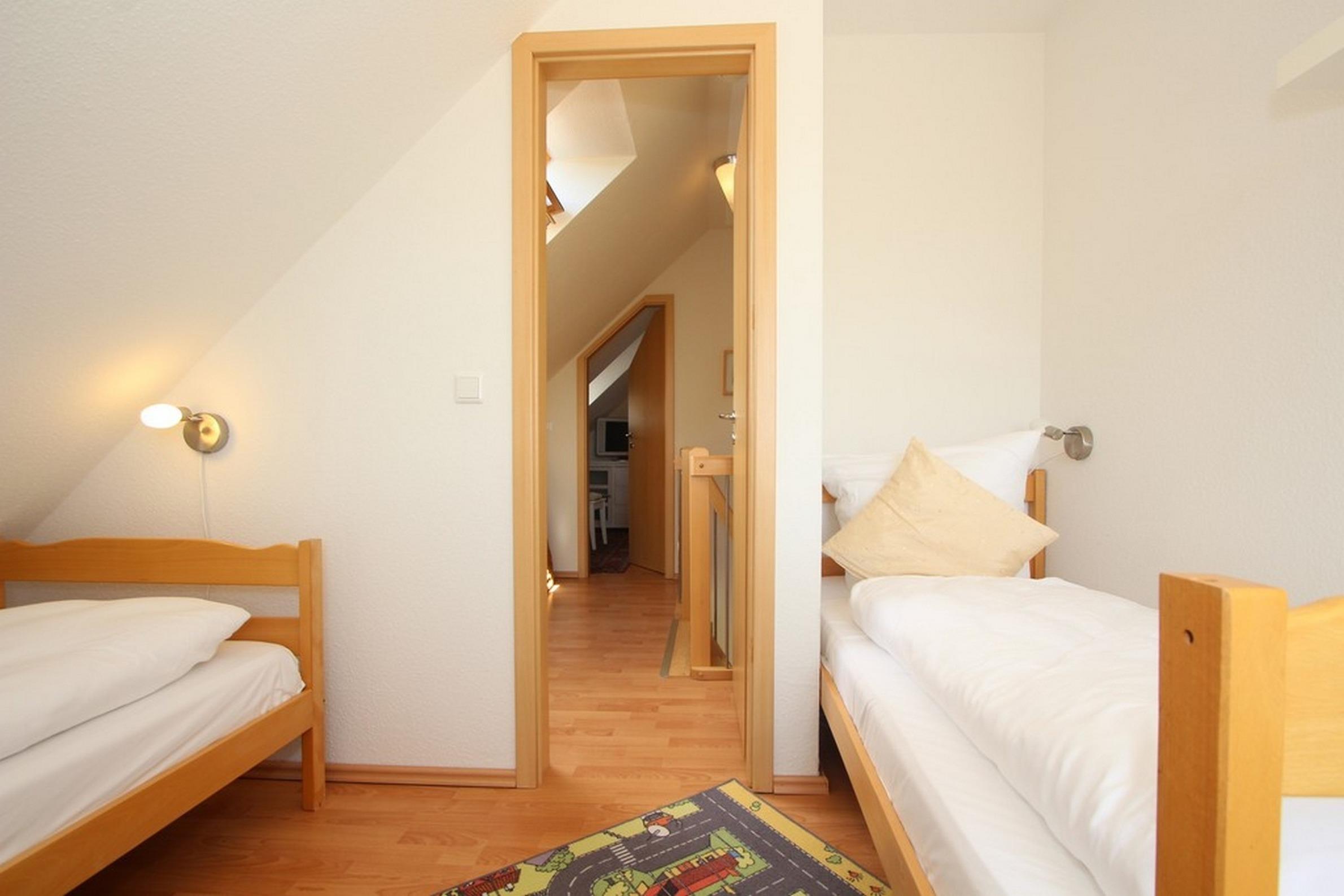 Auf der zweiten Wohnebene, im DG befinden sich das zweite Schlafzimmer und das Gäste-/ Kinderzimmer. Das Gäste-/ Kinderzimmer ist mit zwei Einzelbetten und einem kleinen Kleiderschrank ausgestattet. Im Schlafzimmer befindet sich wieder ein Doppelbett, eine Kleiderstange für Ihre Garderobe und sogar ein zweiter Fernseher.