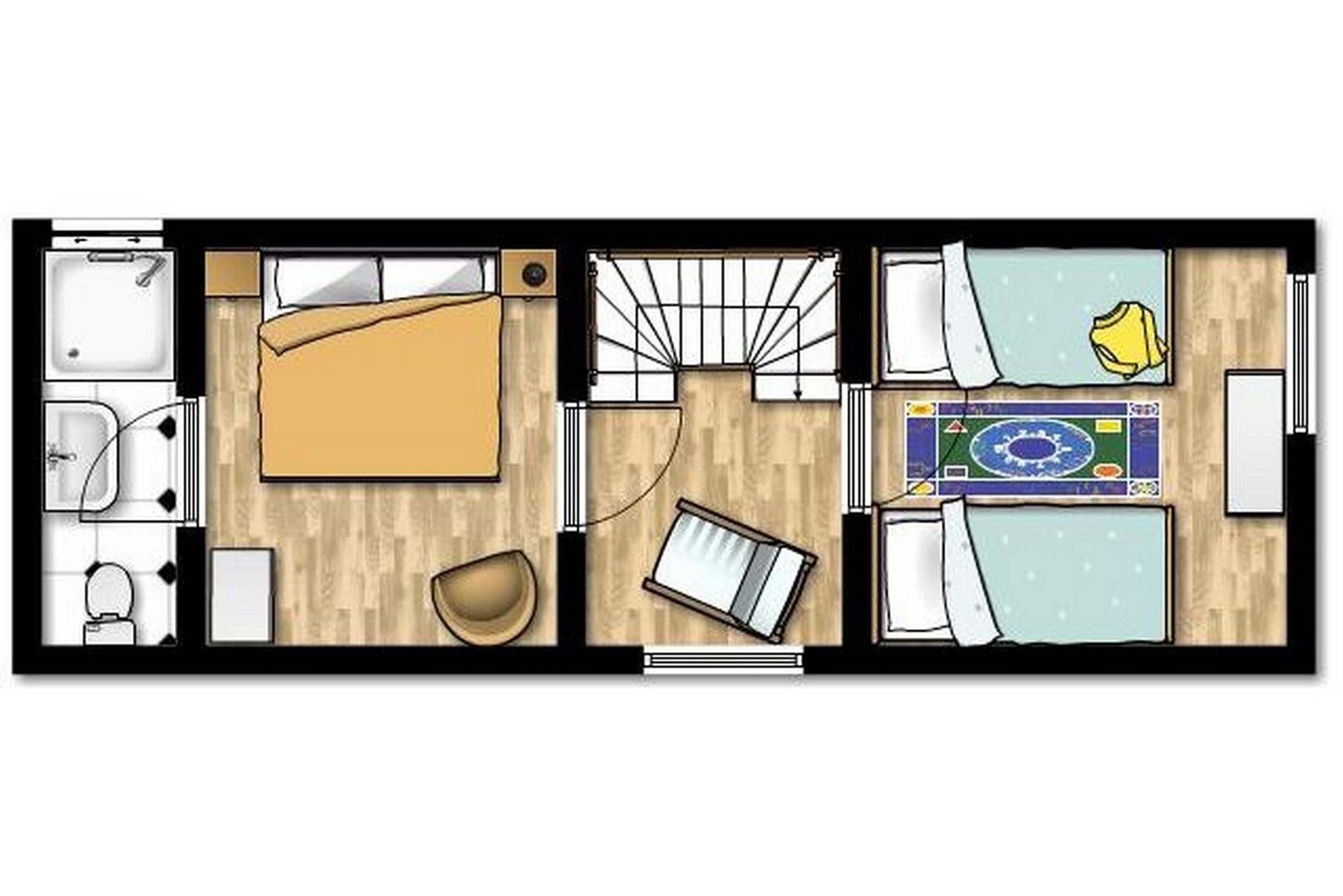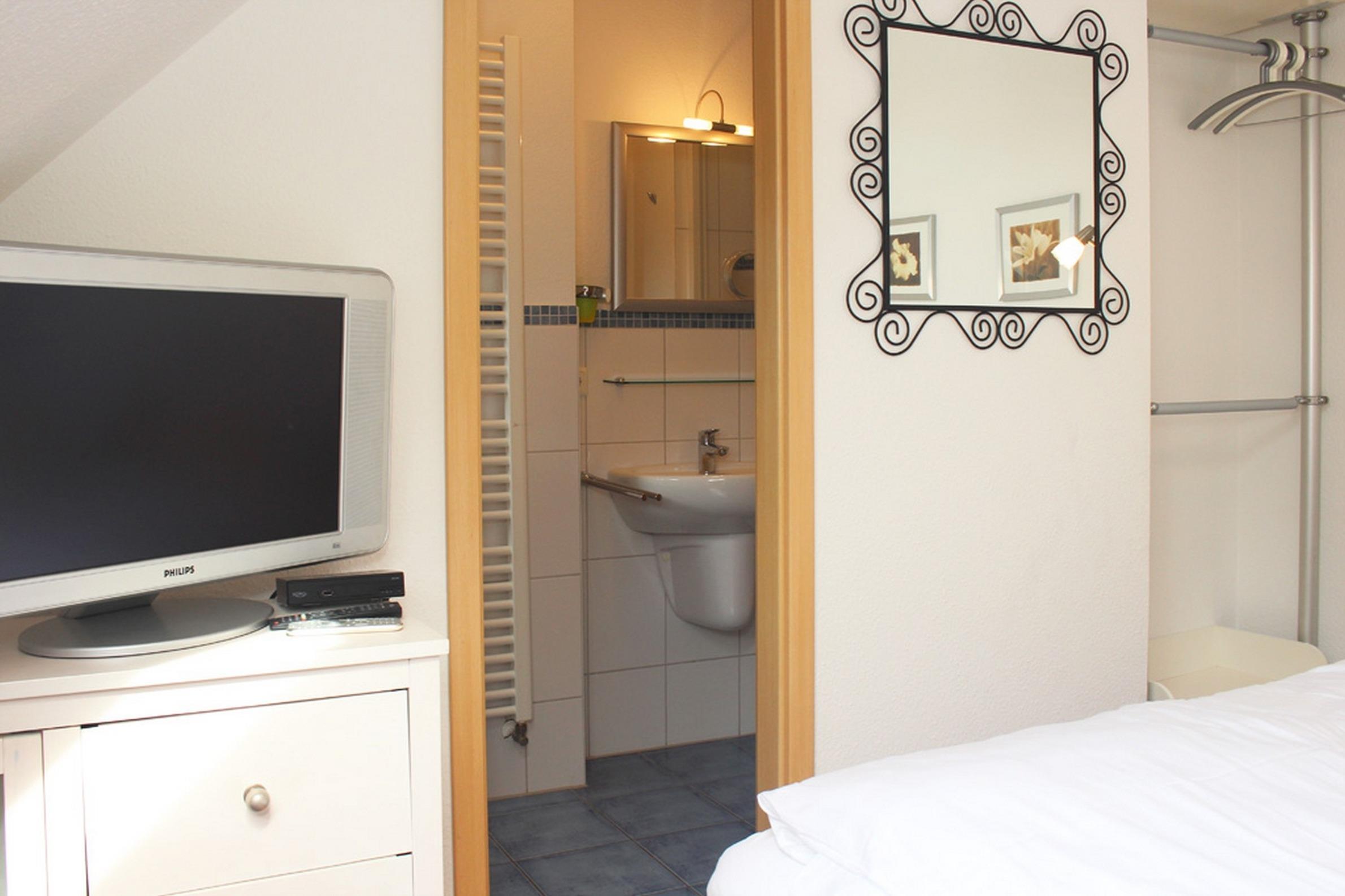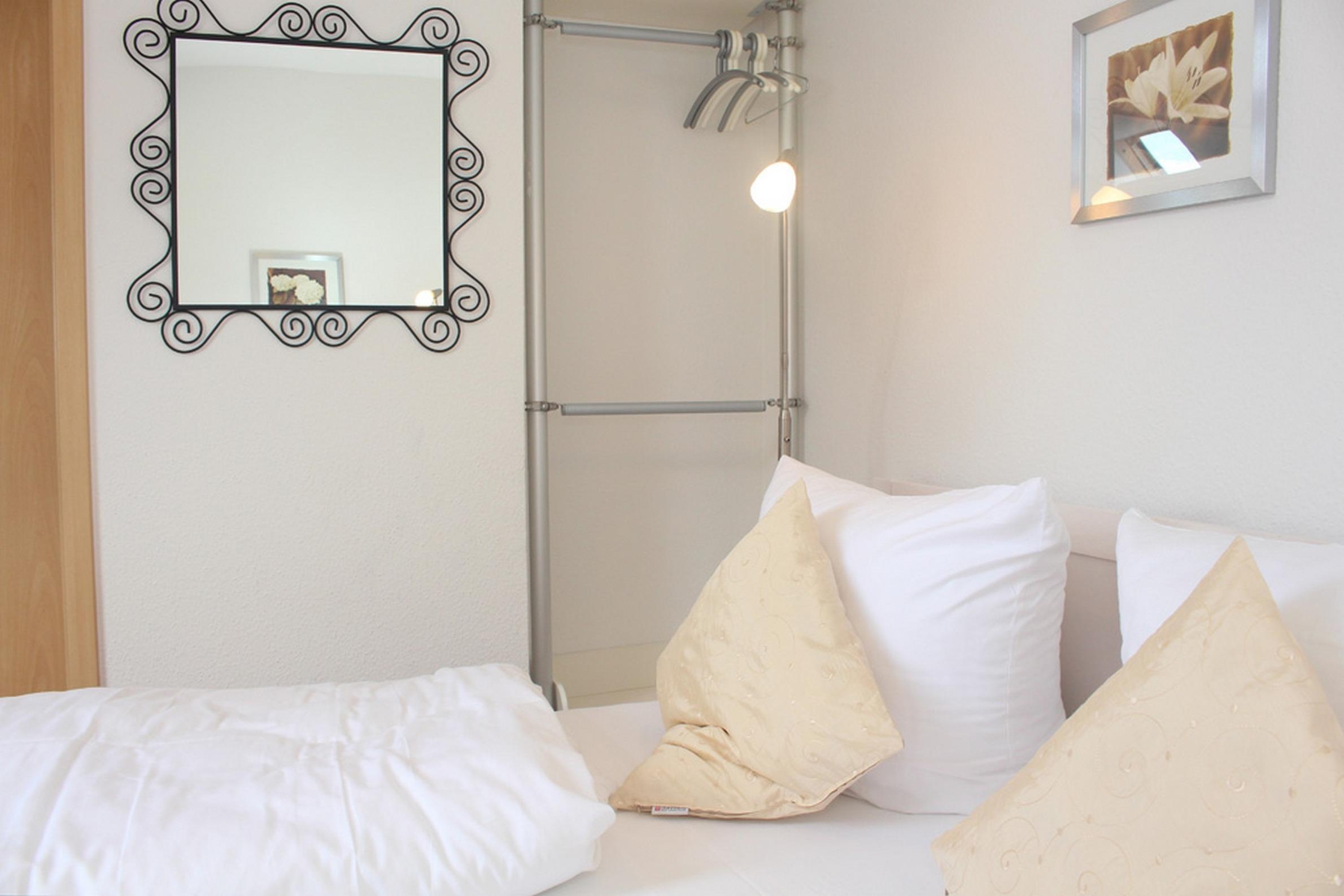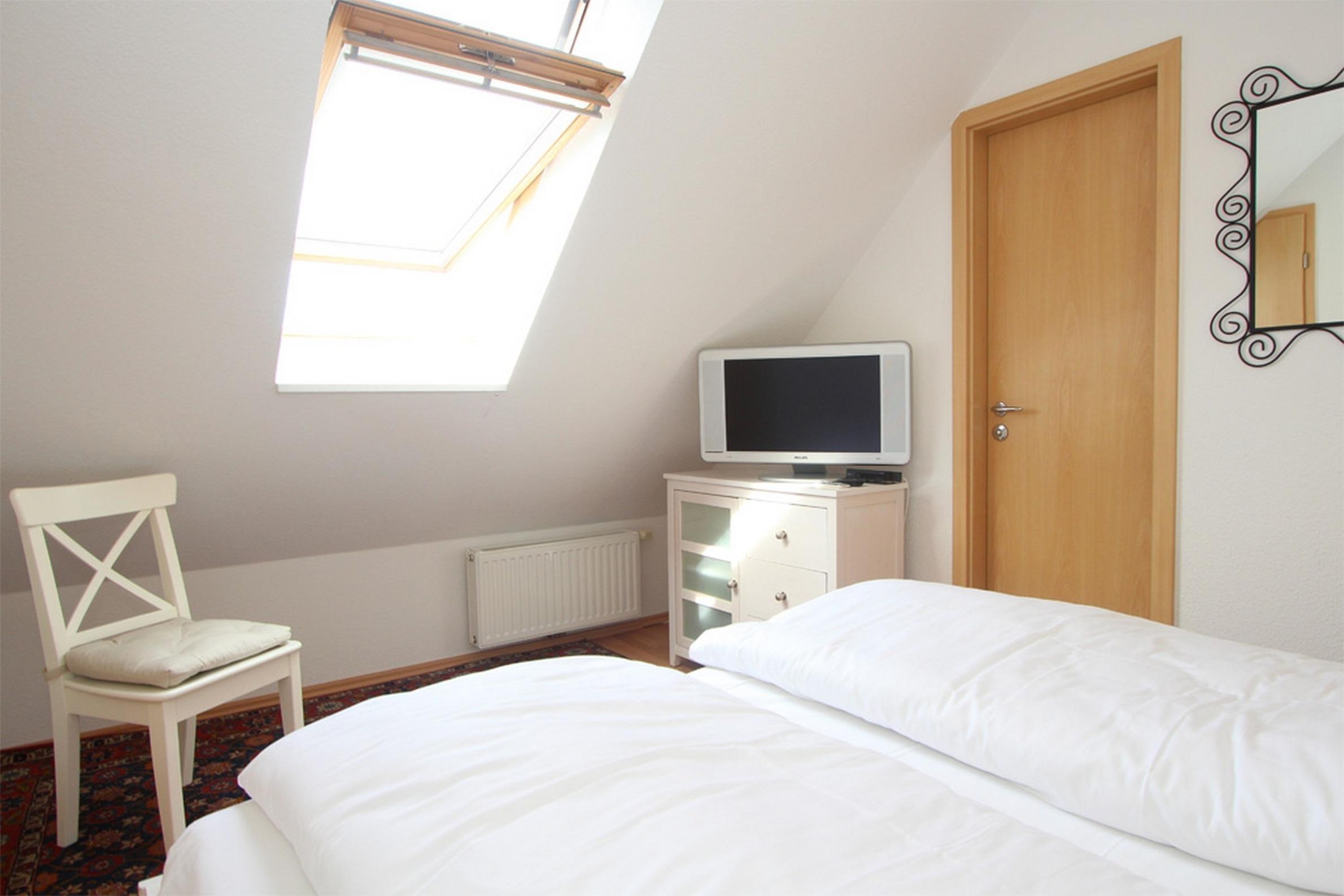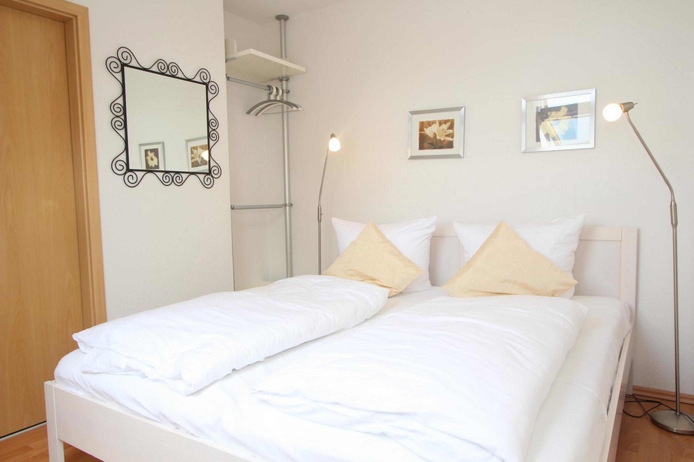 Auf der zweiten Wohnebene, im DG befinden sich das zweite Schlafzimmer und das Gäste-/ Kinderzimmer. Das Gäste-/ Kinderzimmer ist mit zwei Einzelbetten und einem kleinen Kleiderschrank ausgestattet. Im Schlafzimmer befindet sich wieder ein Doppelbett, eine Kleiderstange für Ihre Garderobe und sogar ein zweiter Fernseher.