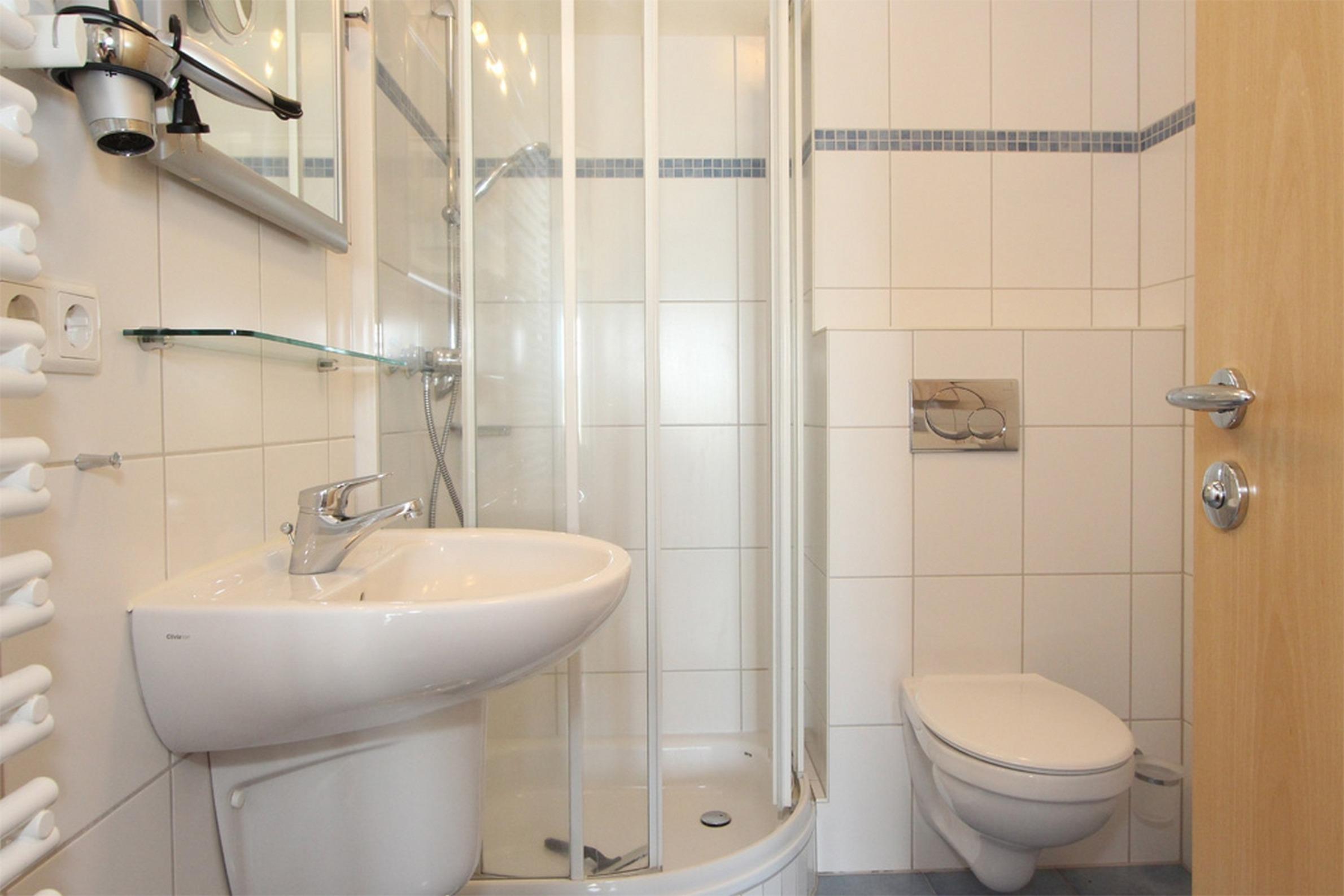 Zum zweiten Badezimmer mit Dusche und WC gelangt man durch das Schlafzimmer mit dem Doppelbett auf dieser Etage.