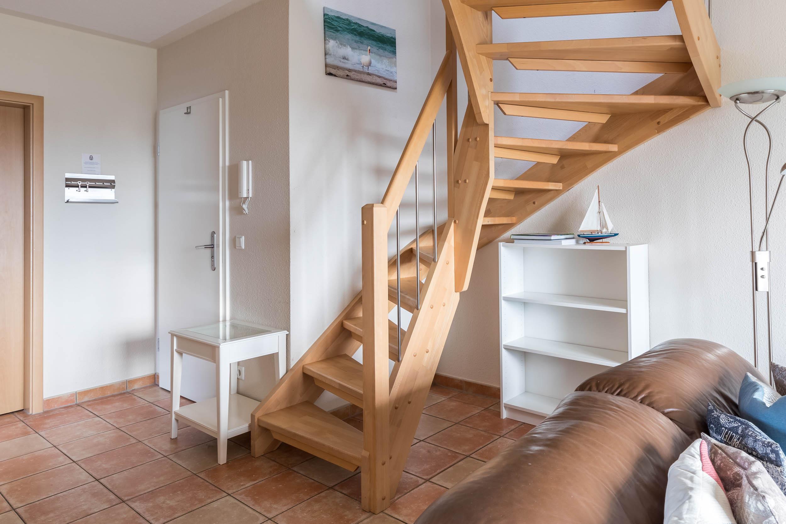 Vom Wohnzimmer aus führt eine offene Holztreppe ins Dachgeschoss.