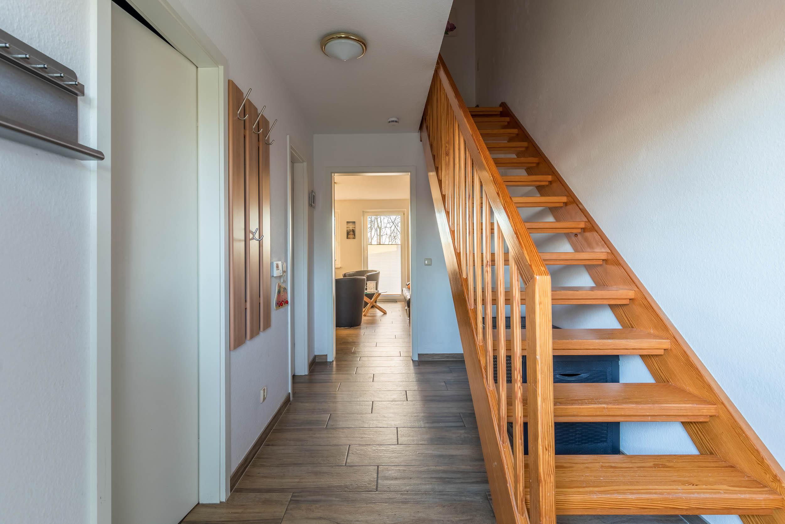 Vom Flur aus führt eine Holztreppe in die nächste Etage.