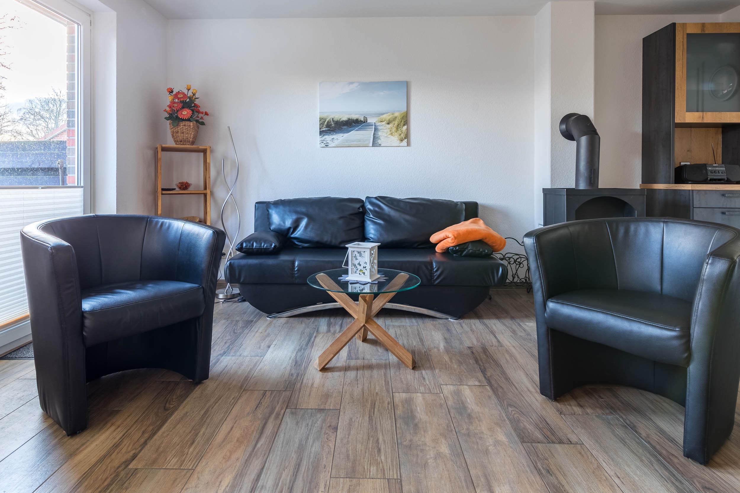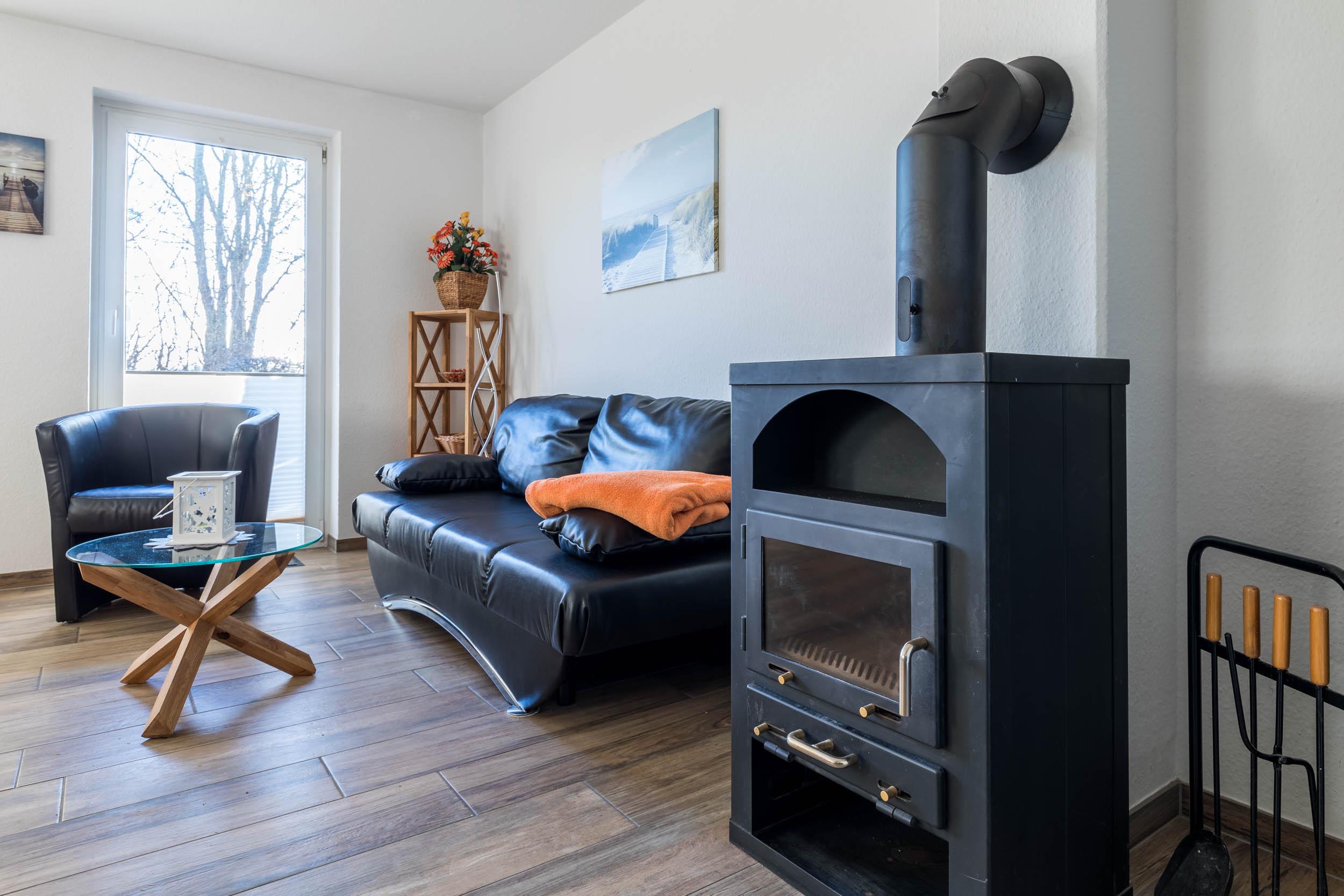 Vom gut ausgestatteten Wohnzimmer mit Kamin im Erdgeschoss gelangen Sie direkt auf die möblierte Süd-Terrasse. Das Sofa im Wohnbereich kann bei Bedarf ausgezogen werden und so entsteht ein zusätzlicher Schlafplatz. Für die Unterhaltung sorgt der große 43 Zoll große Smart TV.