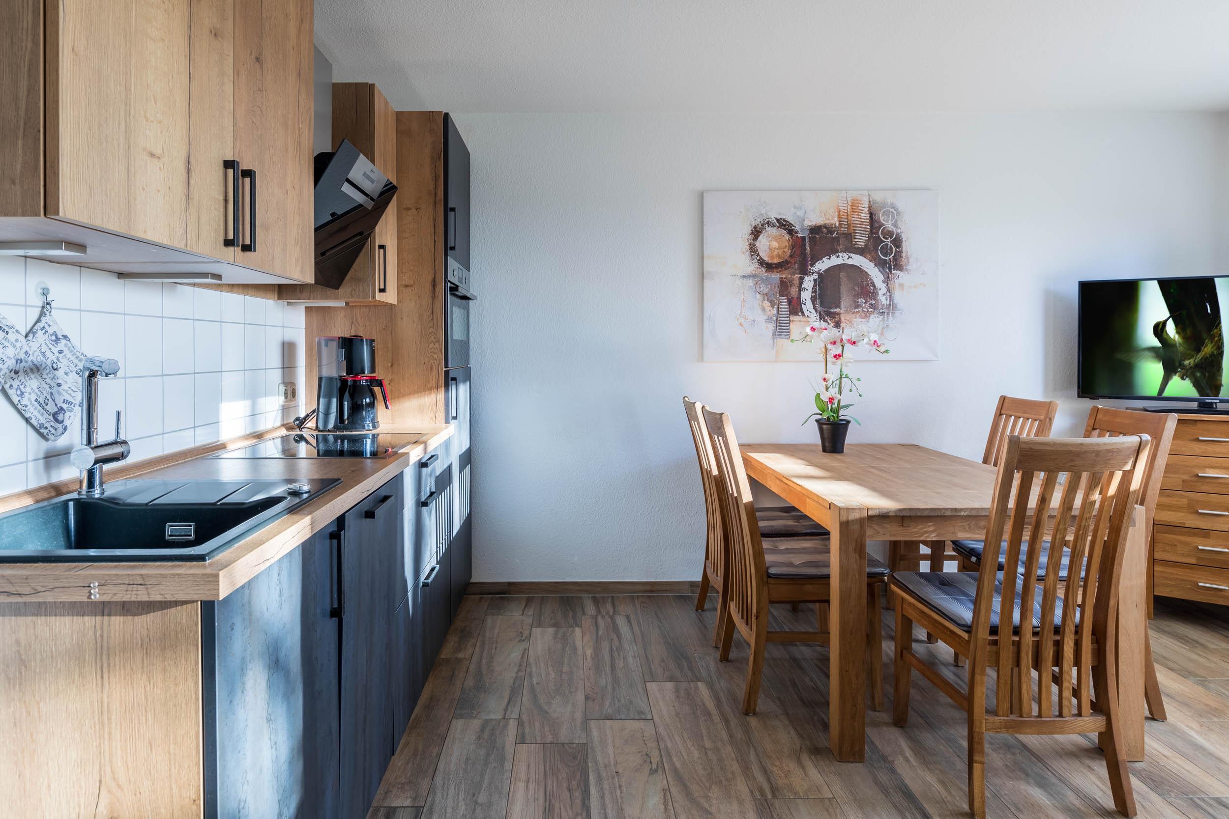 Die moderne offene Küche verfügt über einen Geschirrspüler, Kaffeemaschine, Toaster und vielem mehr. Eine schöne Essecke lädt zum gemeinsamen Speisen ein.