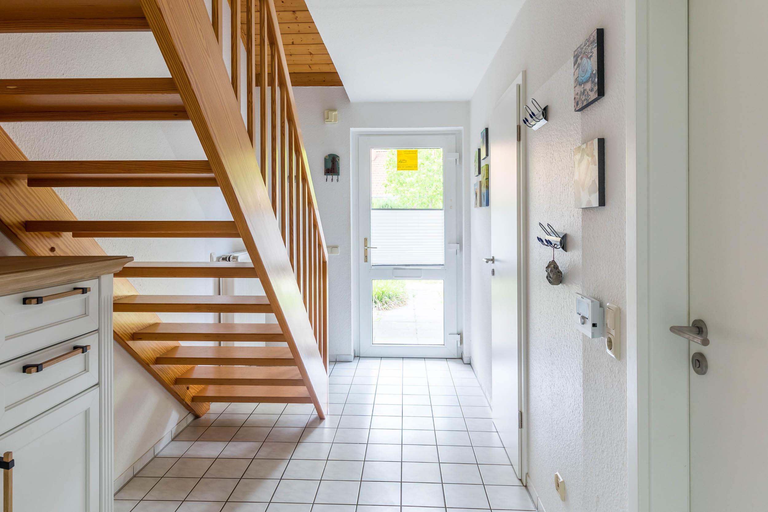 Vom Flur aus führt eine Holztreppe in die nächste Etage.