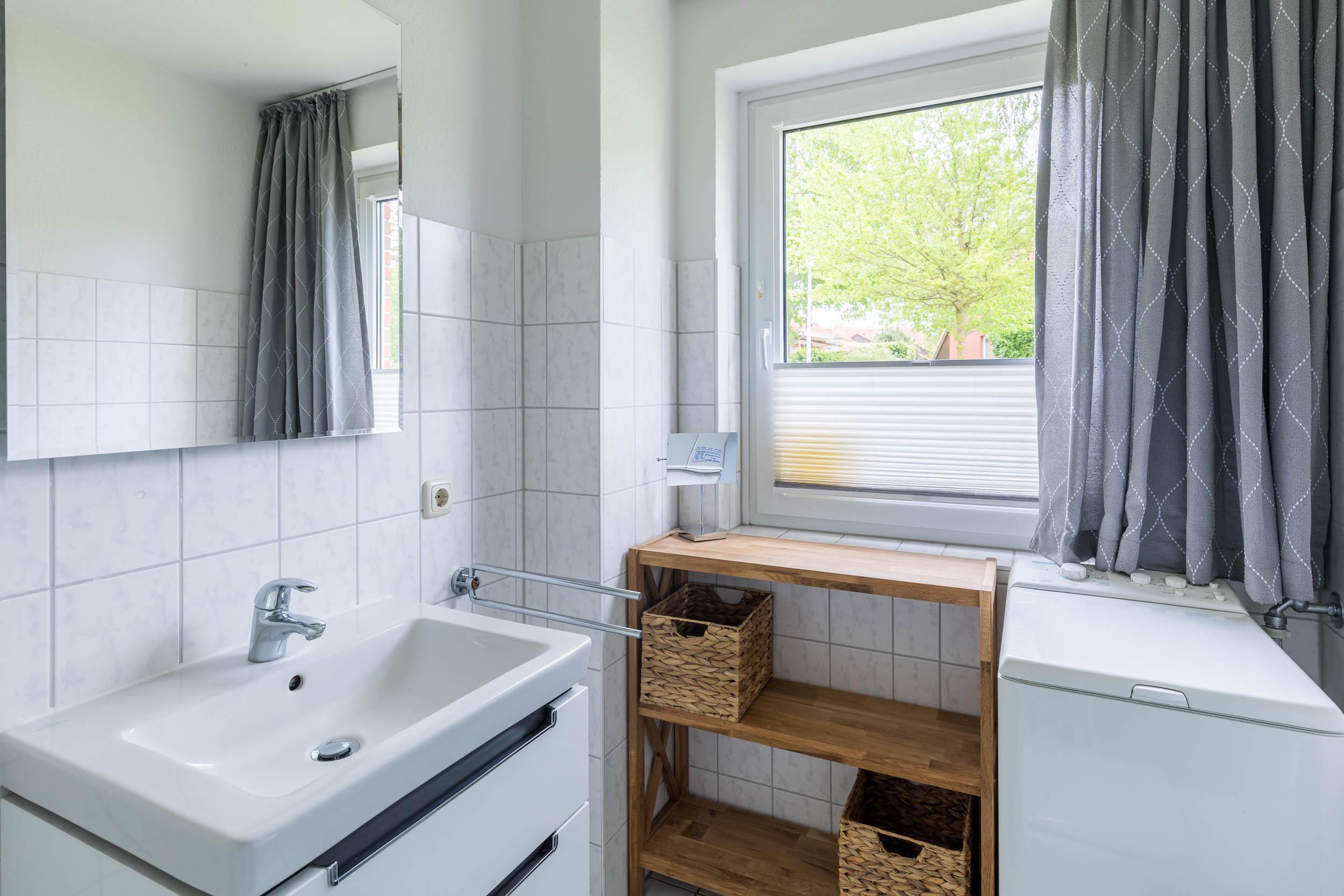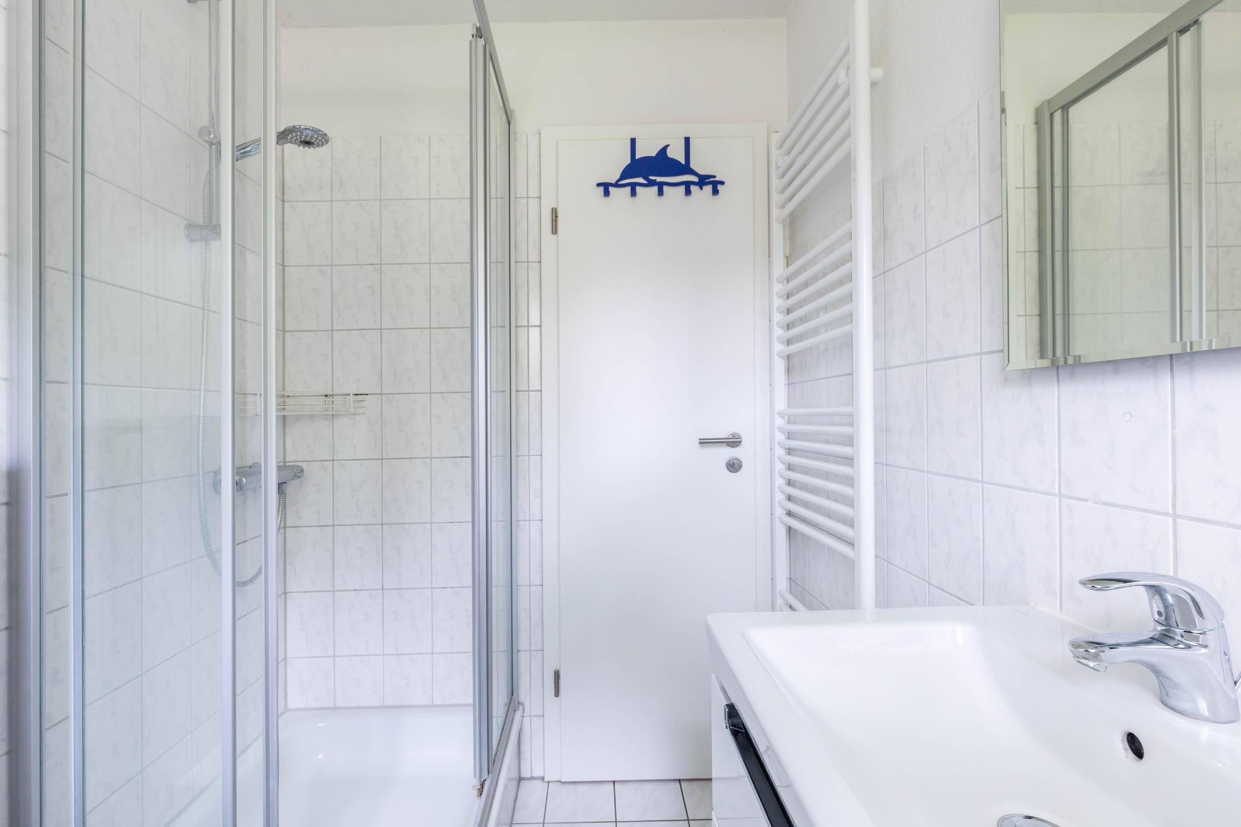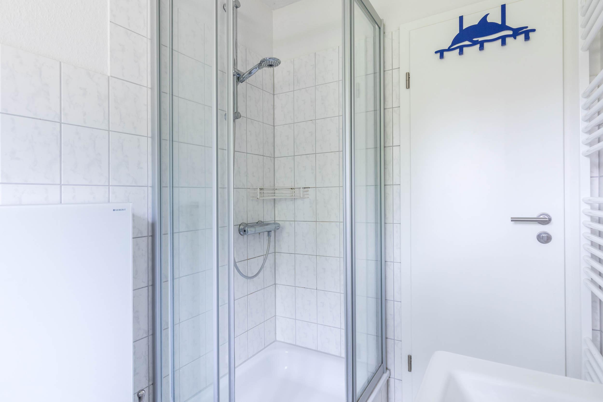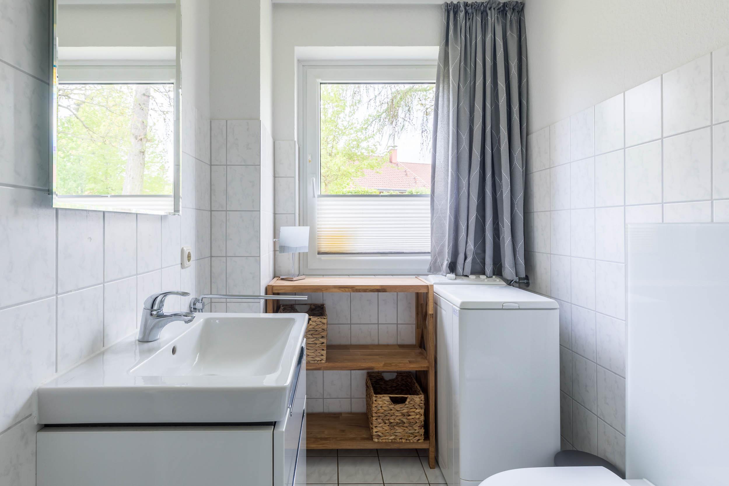 Ein freundliches Badezimmer mit Dusche und WC auf selbiger Etage vervollständigt die Ausstattung. Eine Waschmaschine ist ebenfalls vorhanden. Eine große Handtuchheizung sorgt zusätzlich für wohlige Wärme. Das Fenster spendet angenehmes Tageslicht und hilft beim Lüften nach dem Duschen.