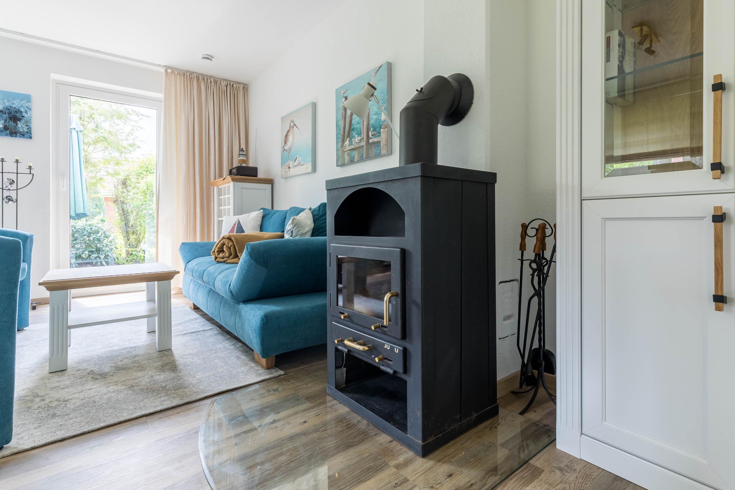 Der komfortabel ausgestattete Wohnbereich mit einem Kamin im Erdgeschoss und einer gemütlichen Essecke ist mit dem modern ausgestatteten Küchenbereich verbunden. Flatscreen-TV (Sat) und Musikanlage sorgen hier für Unterhaltung.