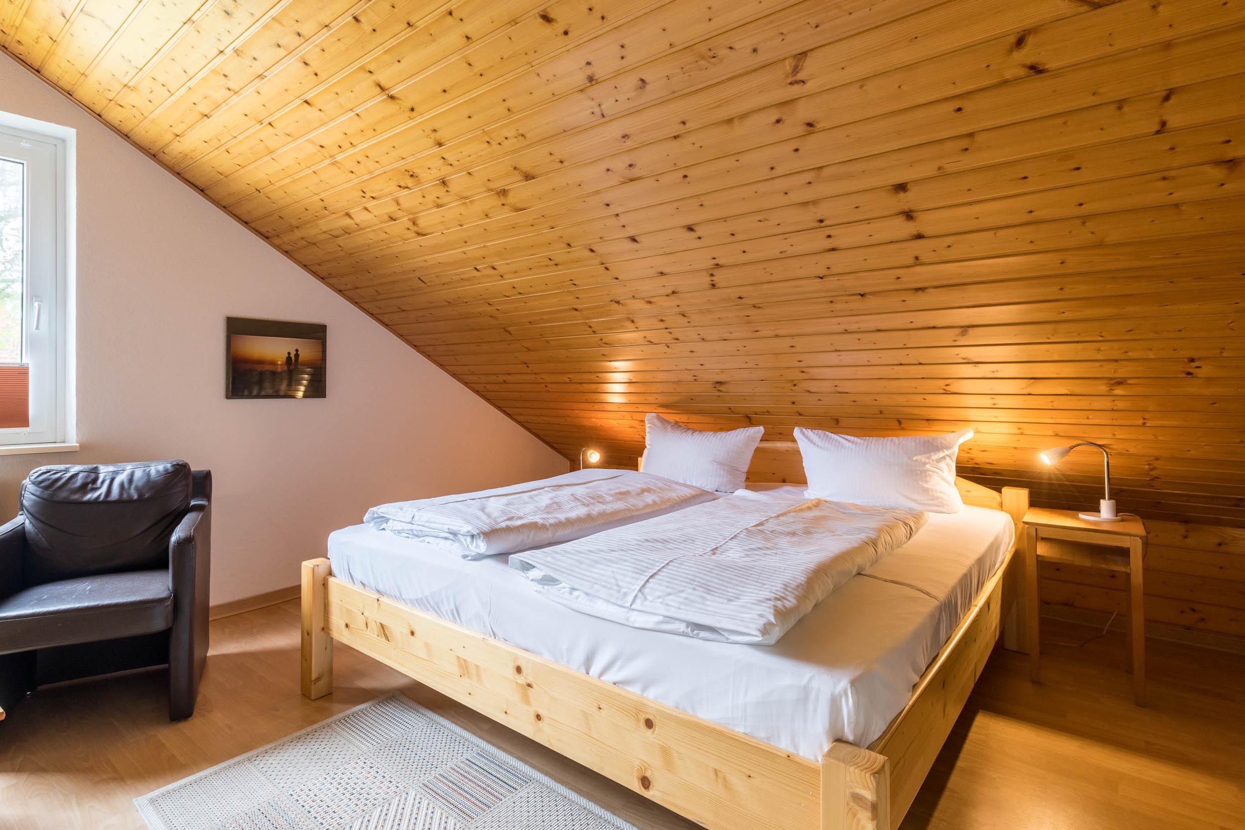 Auf dieser zweiten Ebene, im Dachgeschoss, finden Sie das Schlafzimmer mit einem Doppelbett und einem großen Kleiderschrank. In diesem Raum kann auch problemlos das Reisebettchen aufgebaut werden. Eine kleine Urlaubslektüre finden Sie in dem Eck-Regal.