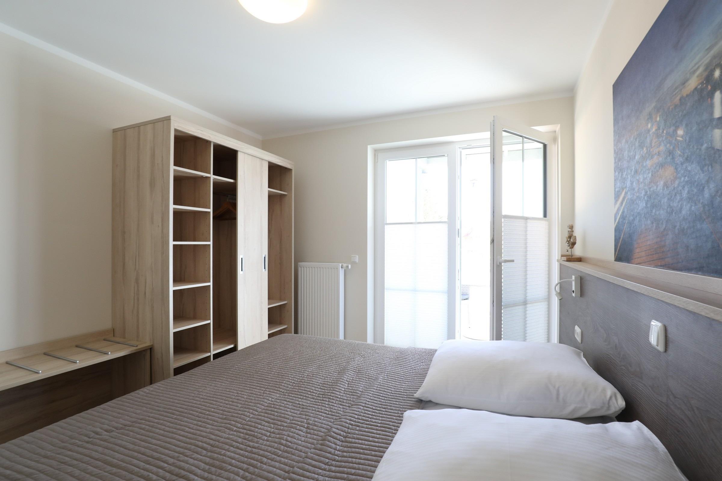 Im Schlafzimmer befindet sich ein Doppelbett und ein geräumiger Kleiderschrank.