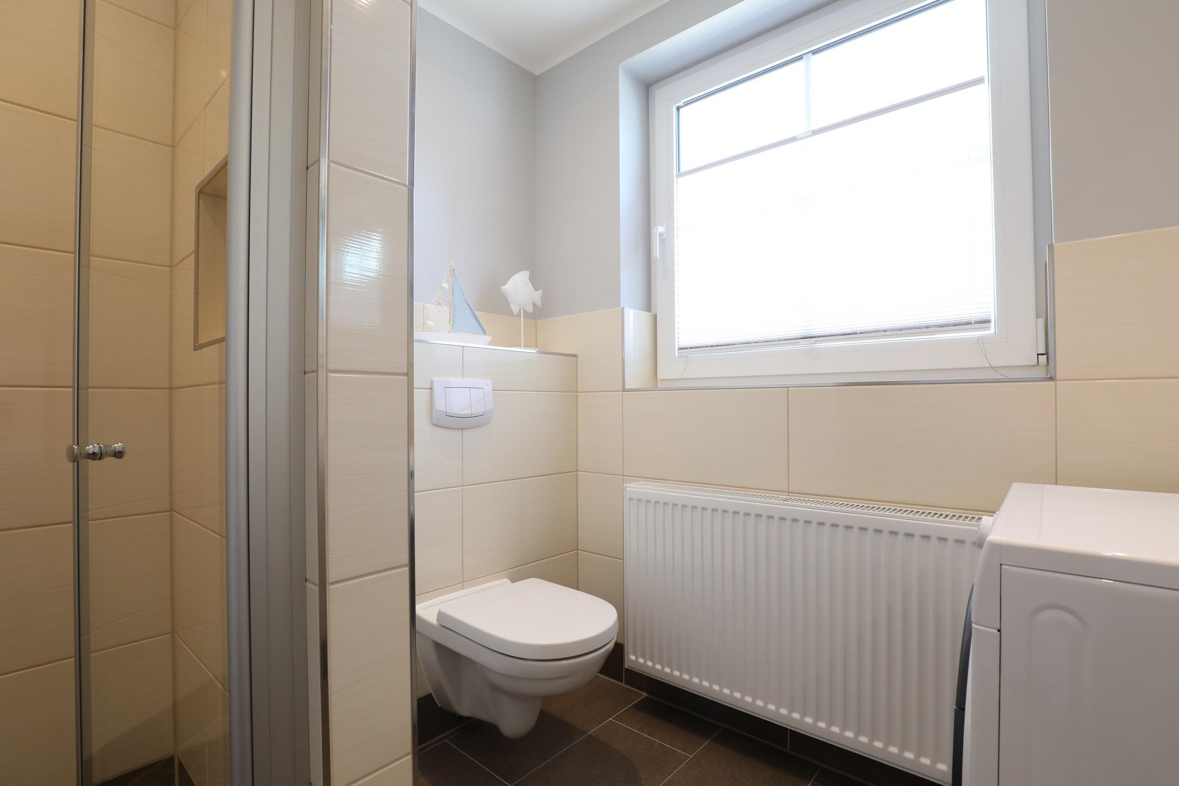 Ein großes Bad mit Tageslicht bietet eine barrierefreie Dusche, Waschbecken, WC und auch eine Waschmaschine.