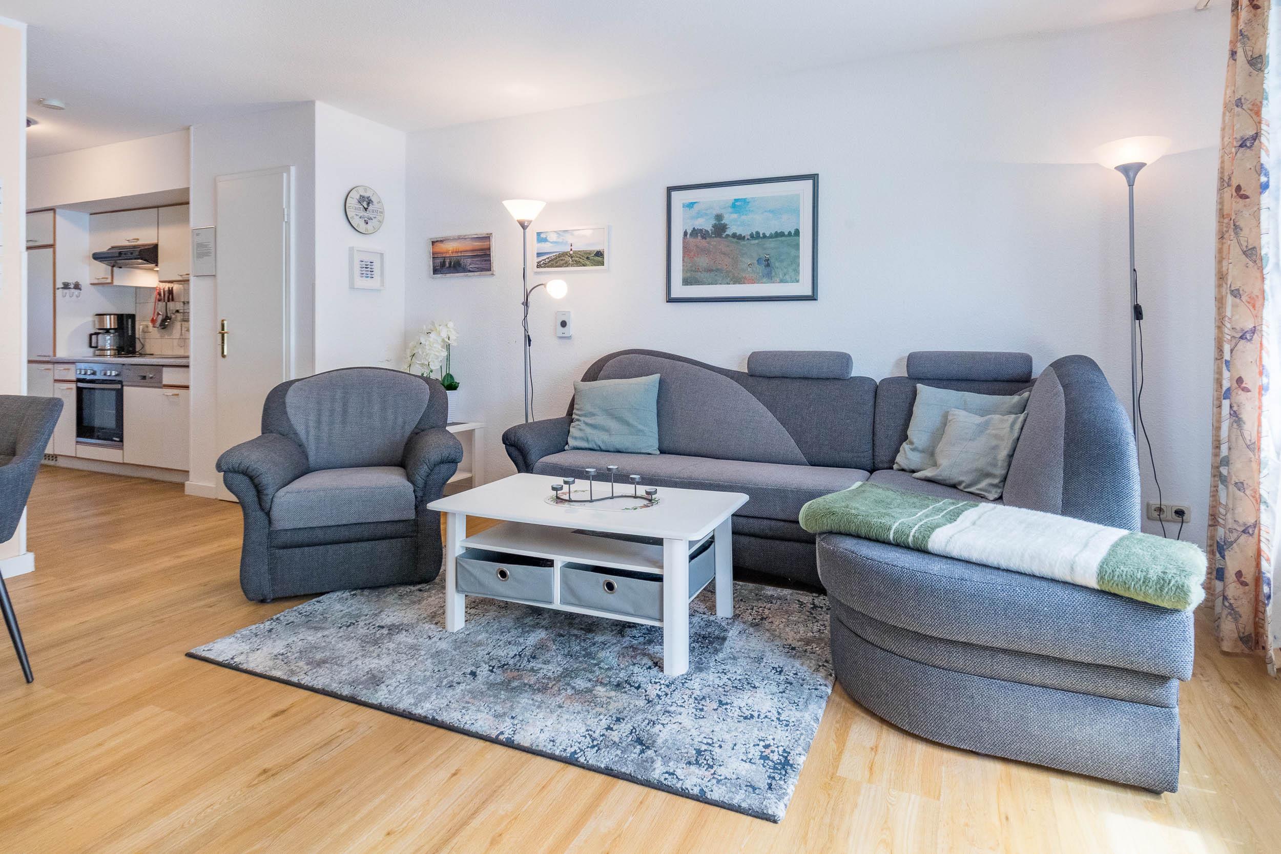 Im Wohnbereich finden Sie eine gemütliche Couch mit SAT-TV und einer kleinen Musikanlage.