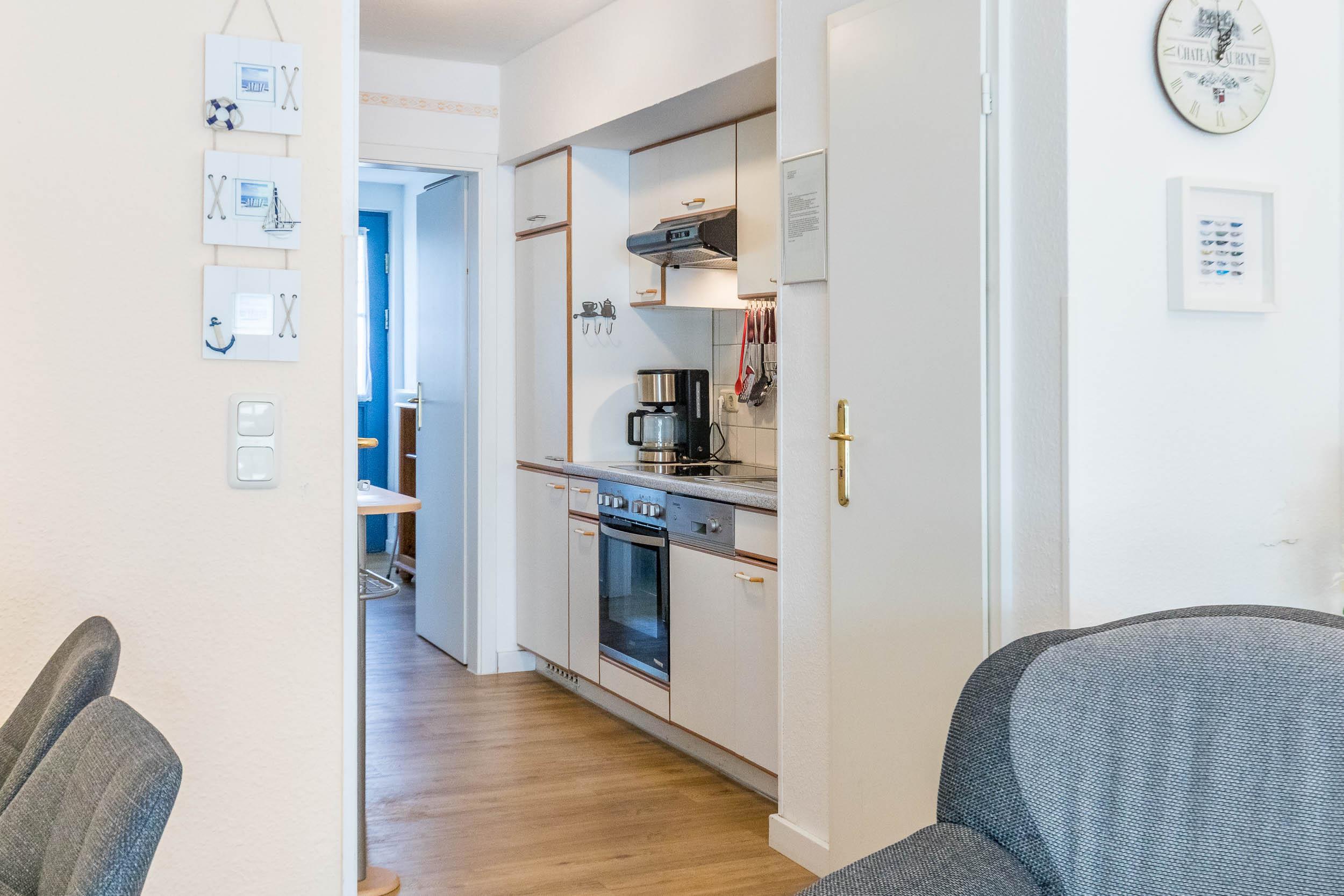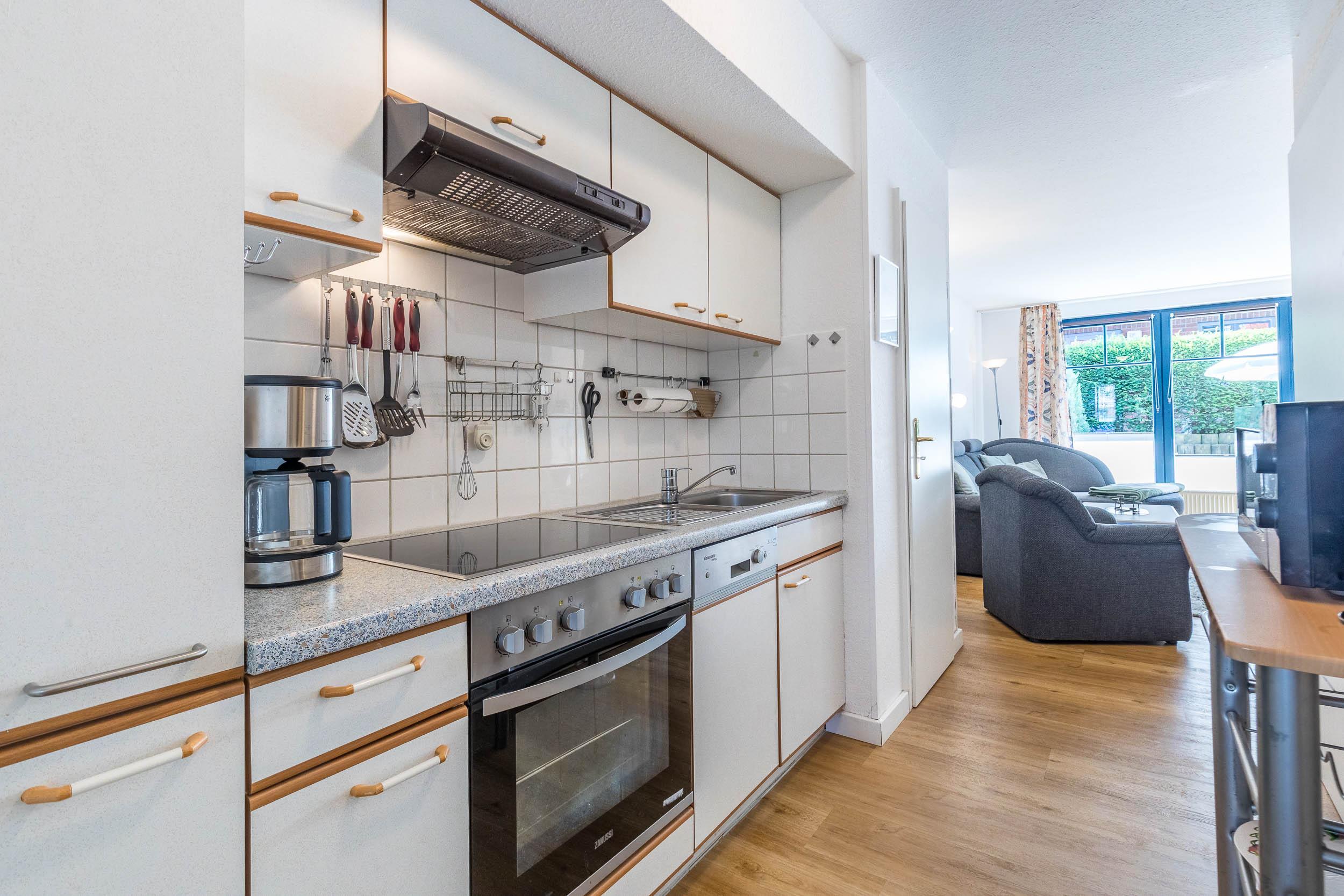 Die Ferienwohnung verfügt weiterhin über eine offene Küchenzeile. Diese ist u.a. mit einem Cerankochfeld, einem Backofen sowie einem Minibackofen ausgestattet. Ihre zubereiteten Mahlzeiten können Sie bequem an der separaten Essecke im Wohnzimmer einnehmen.