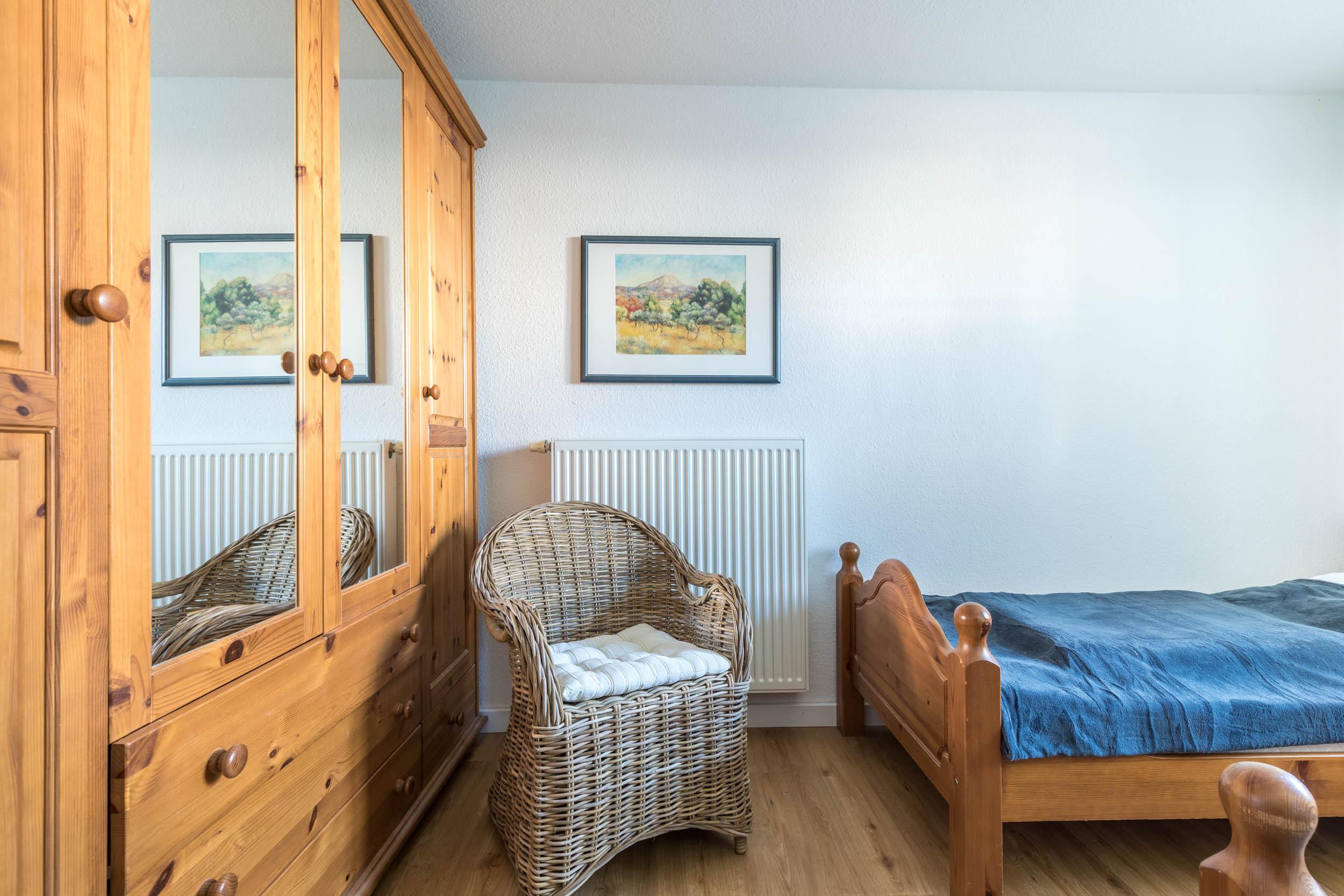 Das Schlafzimmer bietet zwei bequeme Einzelbetten und einen großzügigen Kleiderschrank.