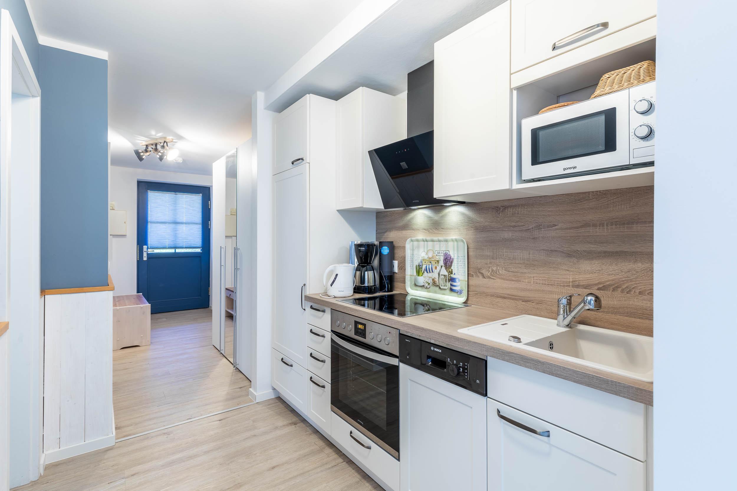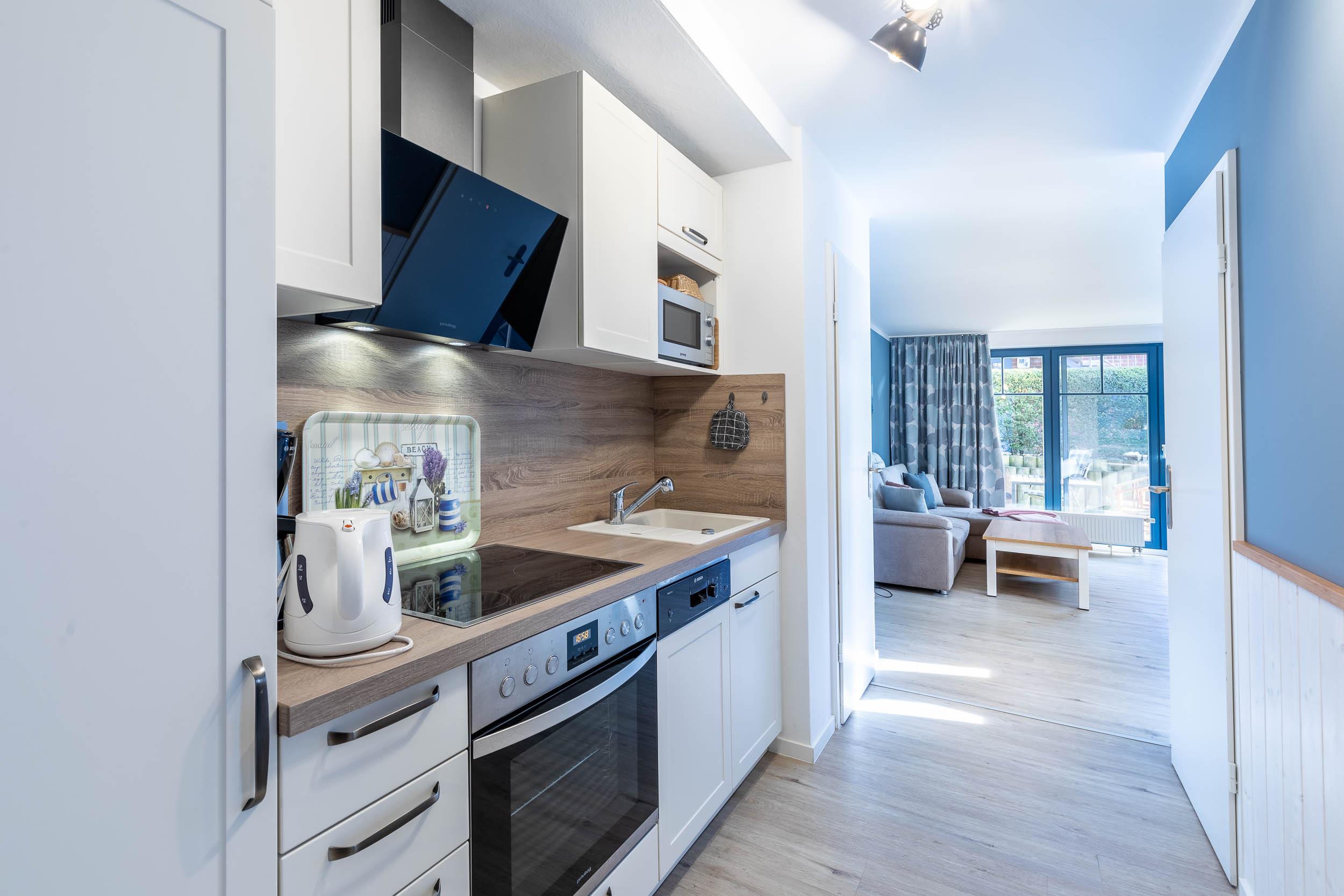 Die moderne offene Küchenzeile ist geschickt integriert und bietet eine umfassende Ausstattung für Ihre sorgenfreie Selbstversorgung.