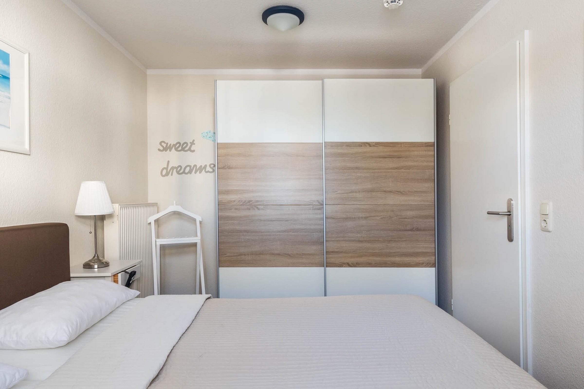 Im Schlafzimmer finden unsere Gäste ein modernes Boxspringbett (180 x 200 cm) und einen geräumigen Kleiderschrank vor. Am Schlafzimmerfenster befindet sich ein dunkles Plissee.