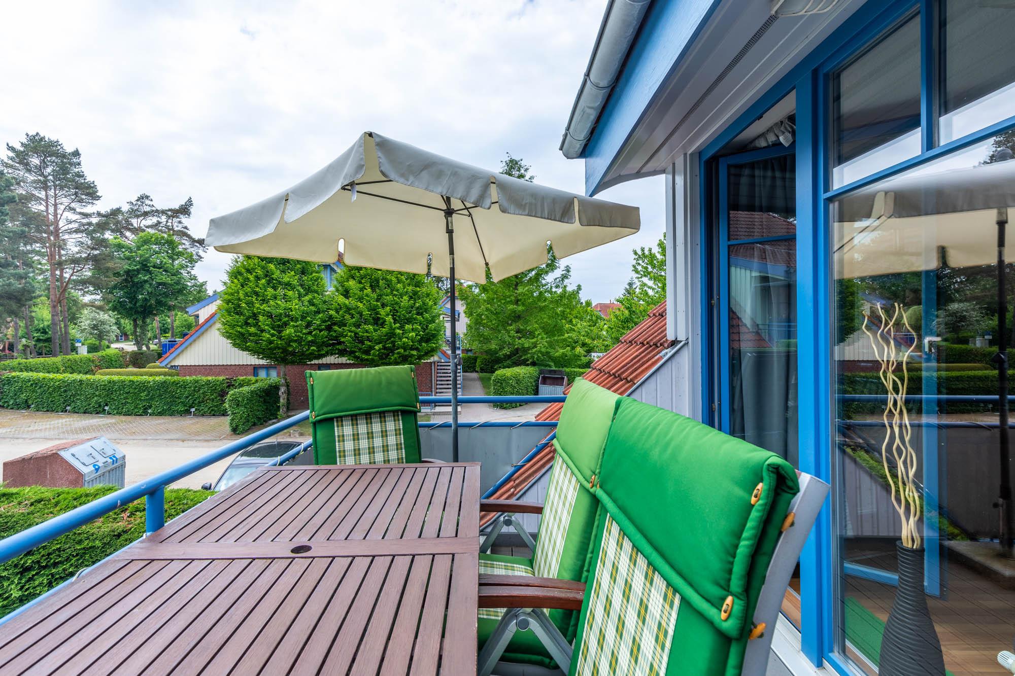 Im Wohnbereich in der ersten Wohnebene laden bequeme Möbel und Flatscreen-TV zu entspannenden Stunden ein. Der direkte Zugang zum Balkon mit Gartenmöbeln bietet herrliches Ostseefeeling.
