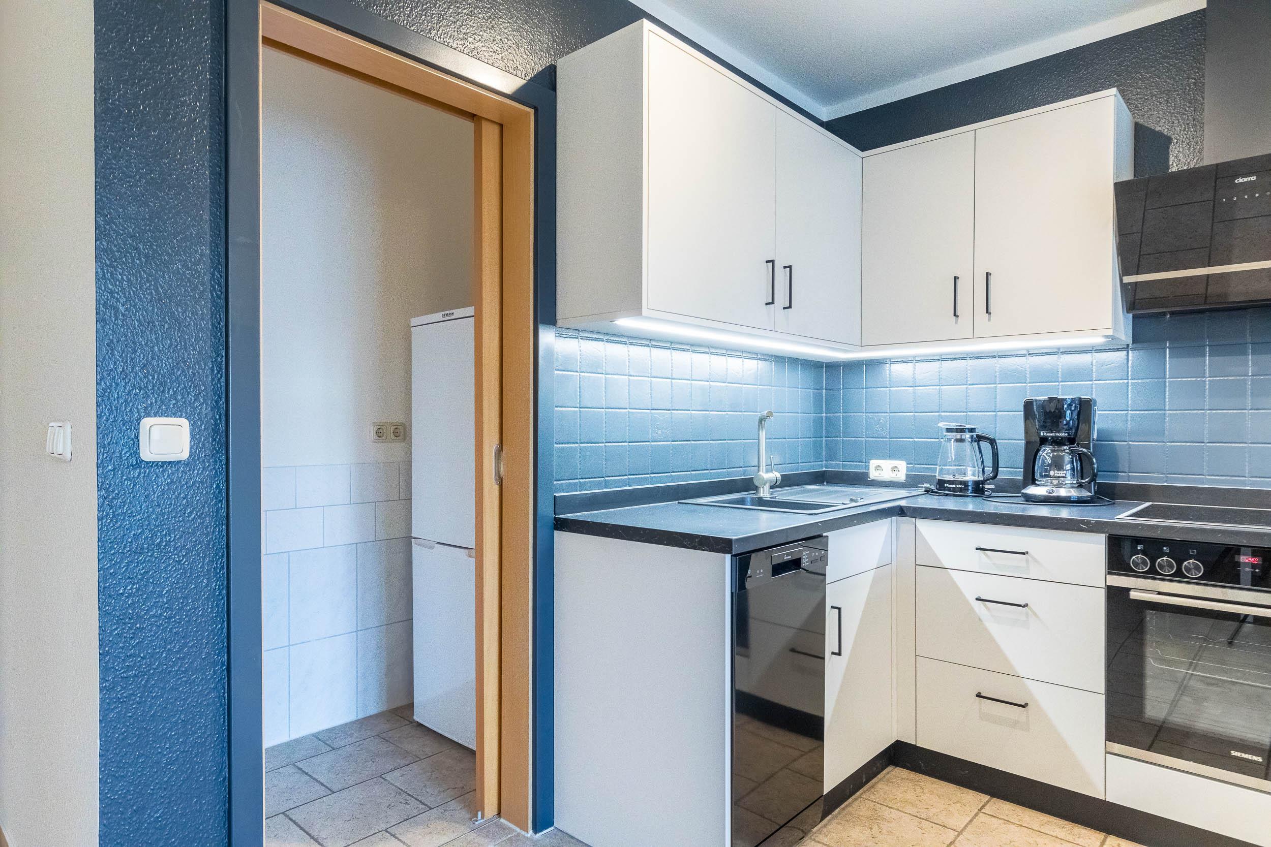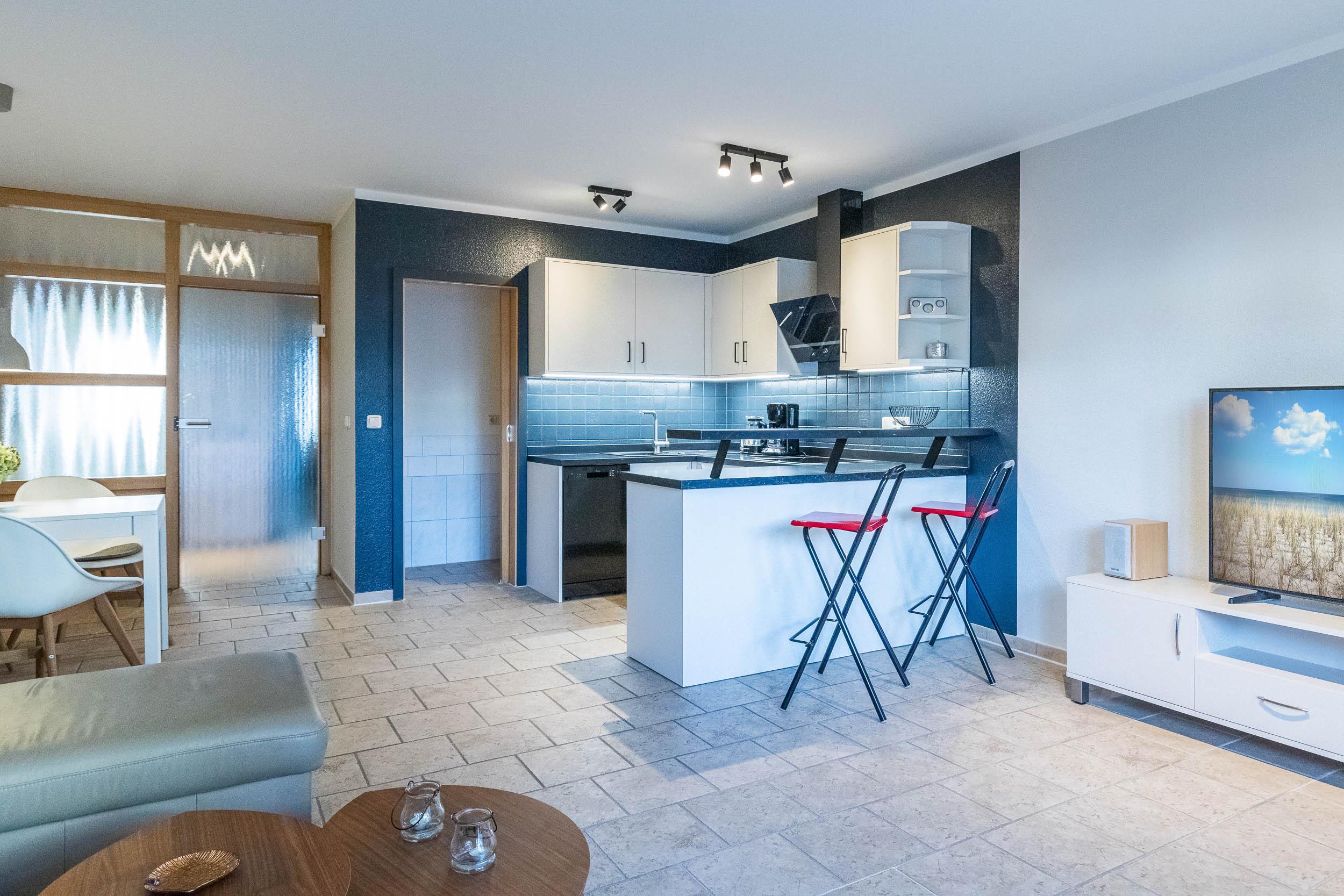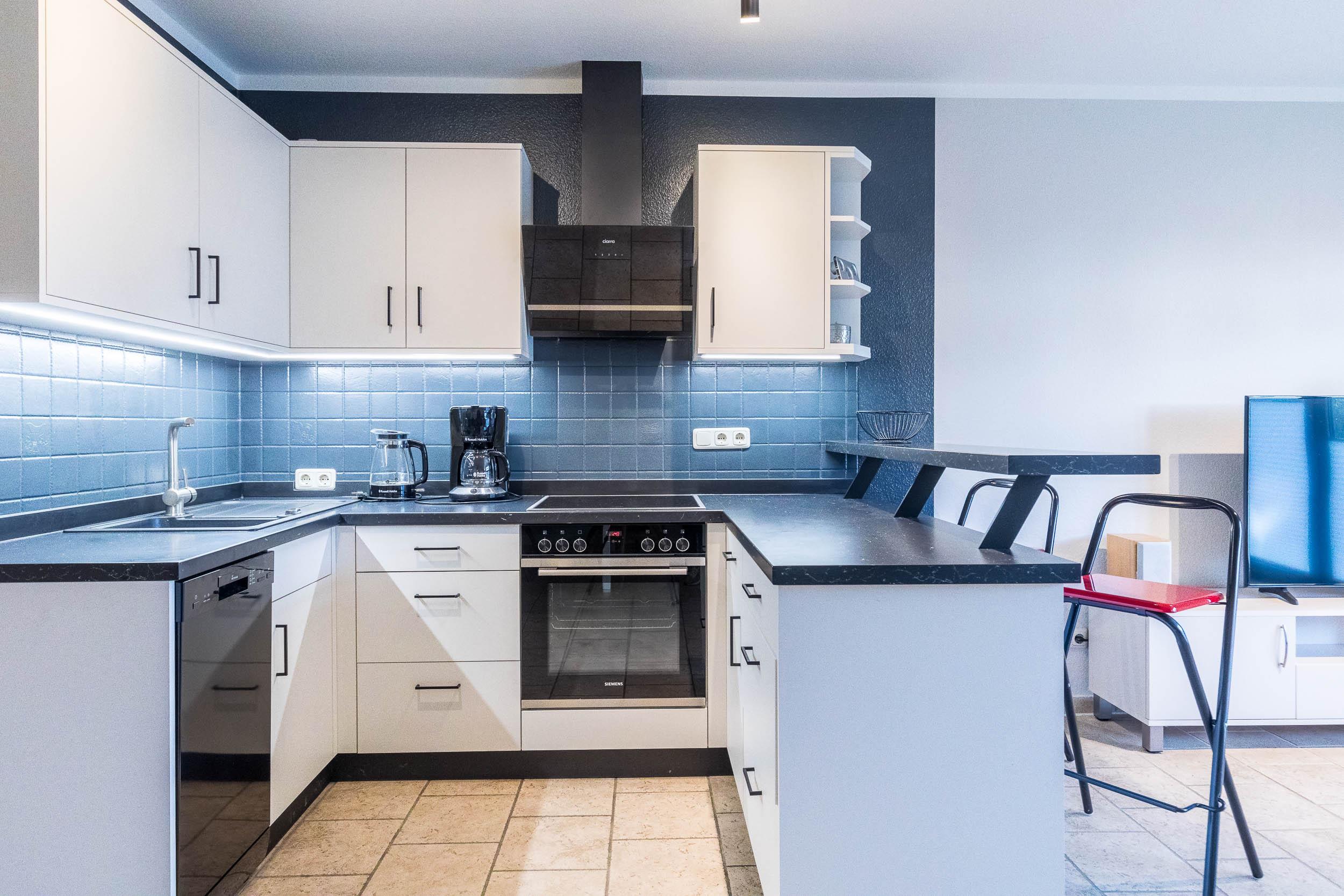 Der Tresen mit zwei Stühlen trennt optisch den Wohn- und Küchenbereich. Die Küchenzeile bietet eine gute Ausstattung, um sich rund um die Uhr selbst verpflegen zu können.