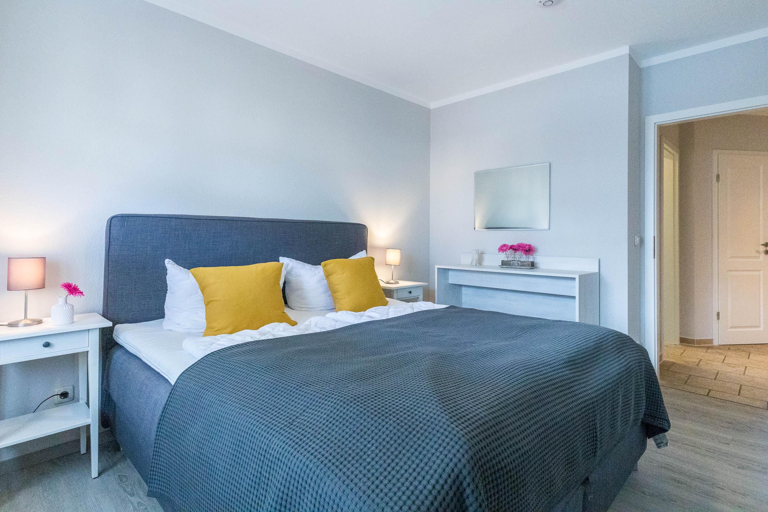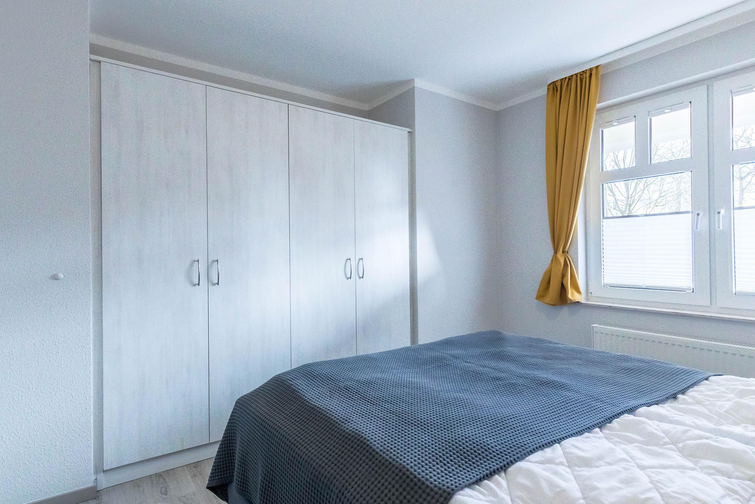 Ein Schlafzimmer mit Boxspringbett (180x200) und Kleiderschrank sorgt für wohlige Nachtruhe.