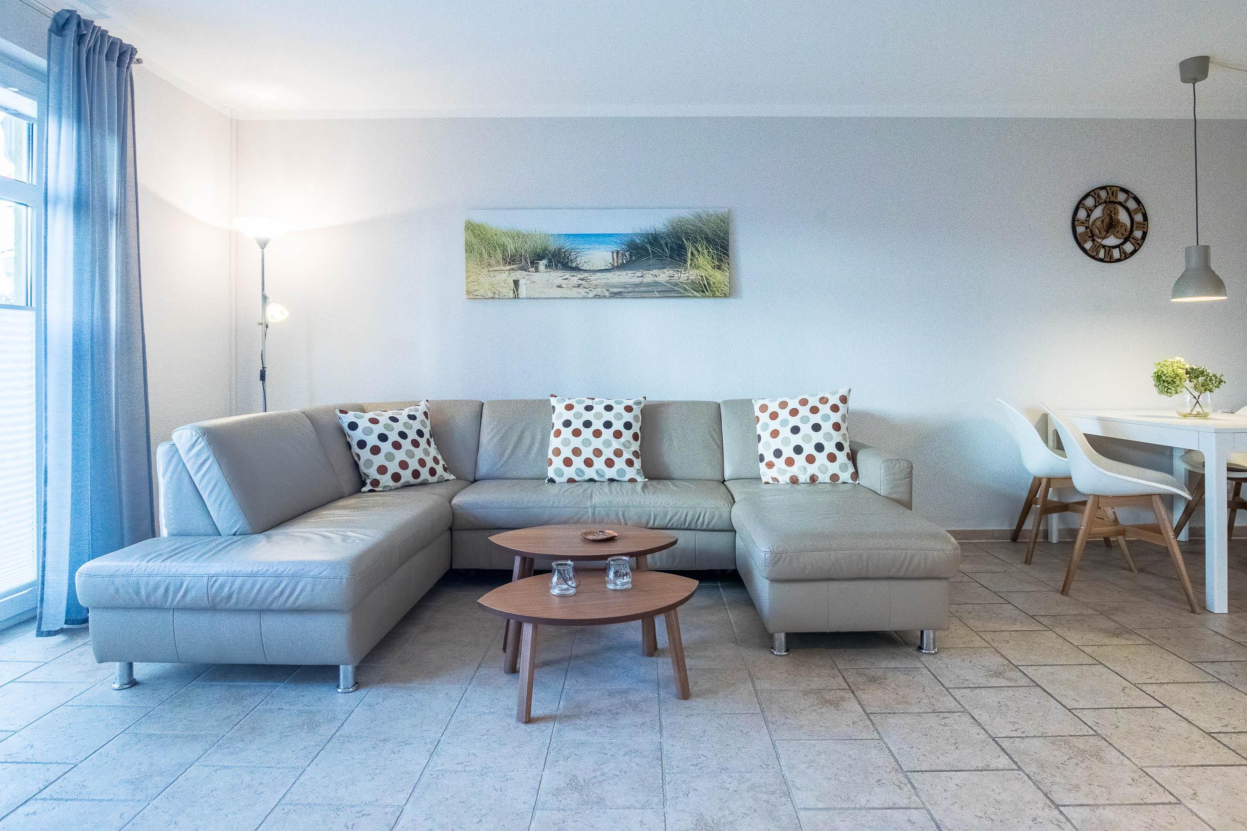 Zum Wohnbereich der behaglichen Unterkunft gehören neben der großzügigen Sofalandschaft auch eine separate Essecke und eine hochwertig ausgestattete offene Küchenzeile. Ein großer Flatscreen-TV und eine Stereoanlage sorgen für die Multimediaunterhaltung während des Urlaubs. Die Schlafcouch im Wohnzimmer bietet eine zusätzliche Schlafmöglichkeit für 2 Gäste (Liegefläche ausgeklappt 120x240cm). Auch ein Reisebettchen könnte hier bei Bedarf noch aufgestellt werden.