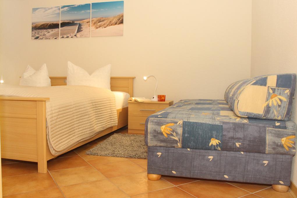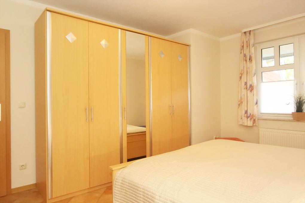 Das Schlafzimmer verfügt sowohl über ein Doppelbett als auch über eine Couchliege als weitere Schlafoption. In dem großen Kleiderschrank können Sie gern Ihre Urlaubsgarderobe ablegen.