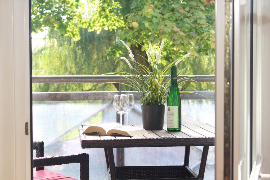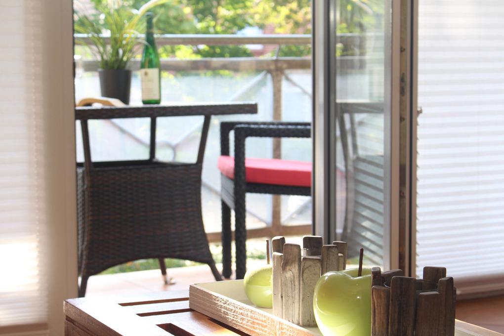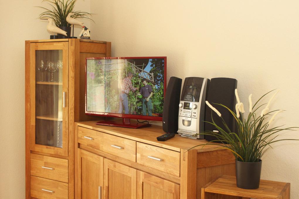 An das mit einem Satelliten-TV, einer Stereoanlage und einer Schlafcouch ausgestattete Wohnzimmer schließt sich ein schöner Südbalkon mit Gartenmöbeln an.