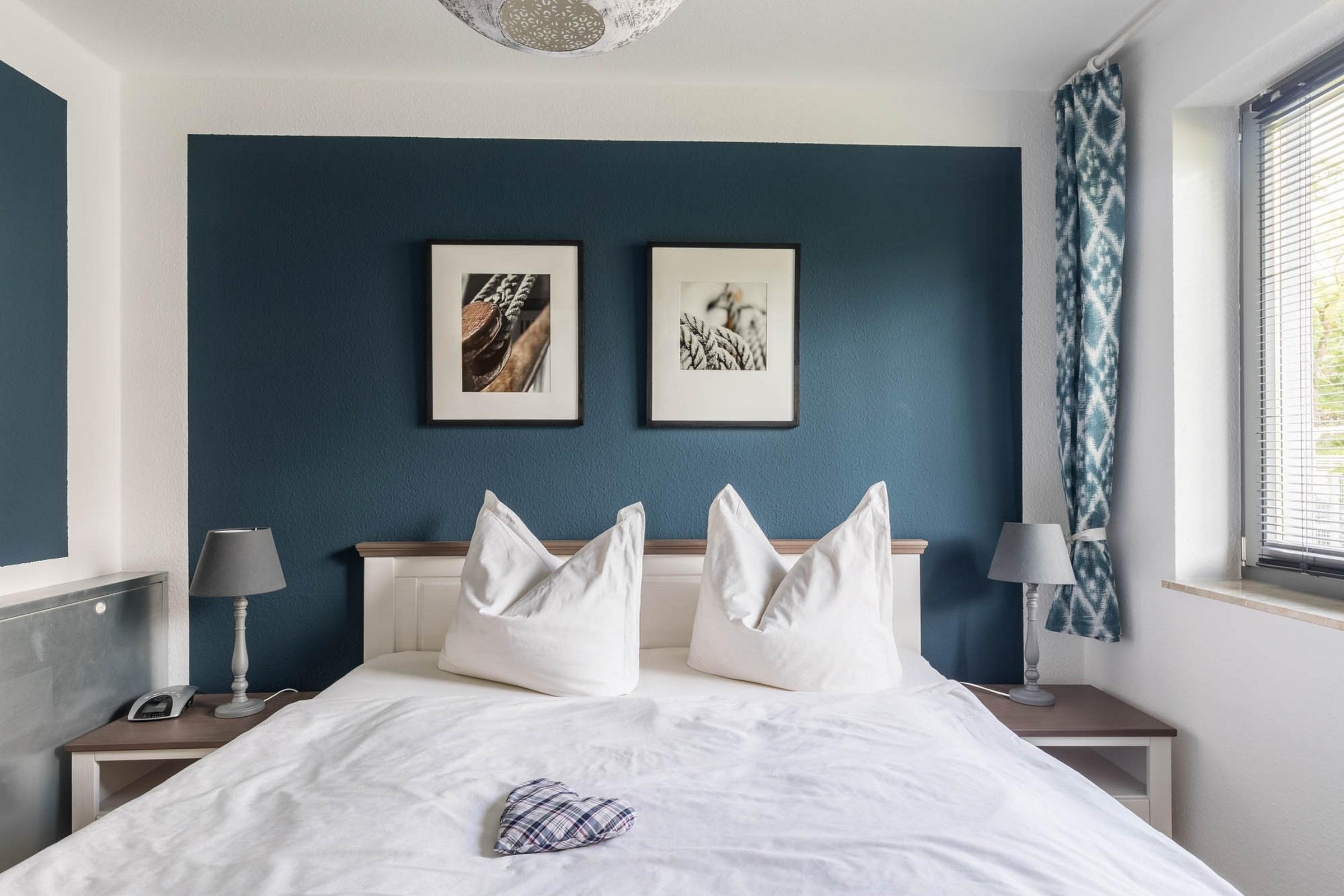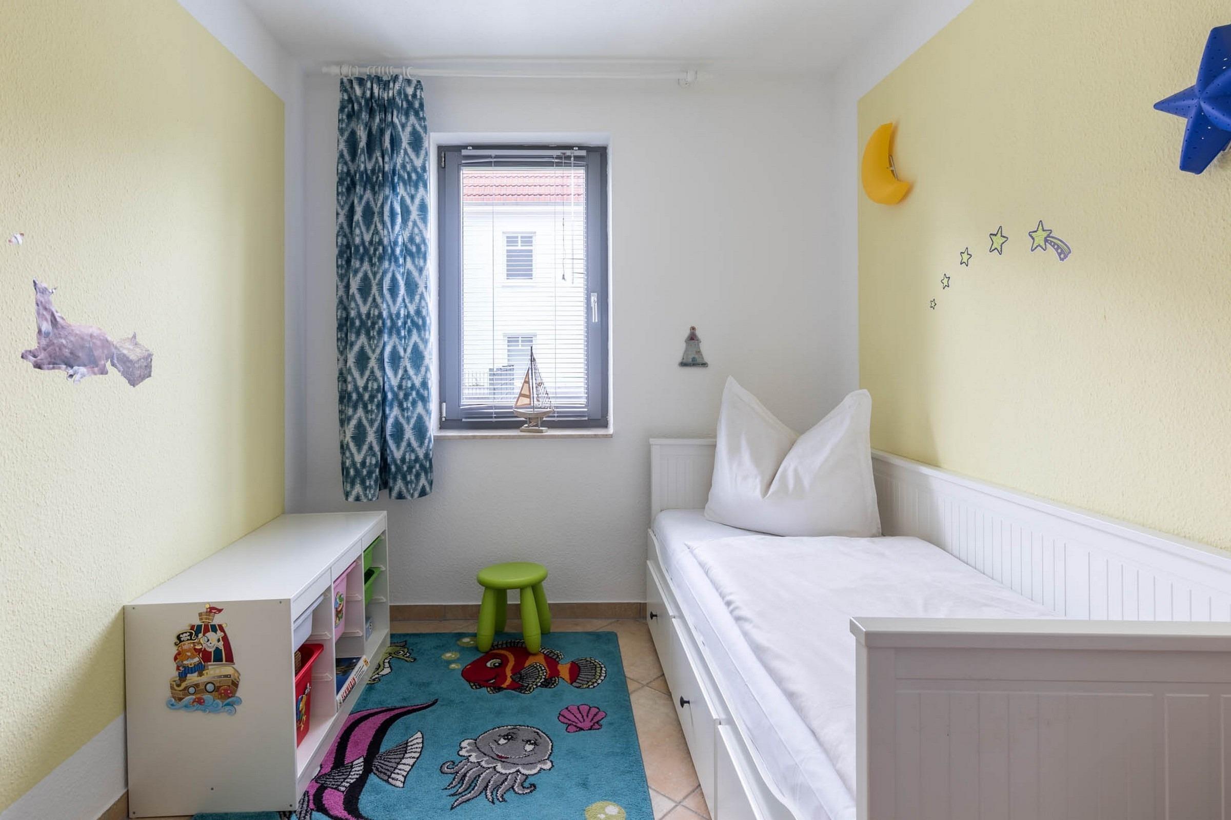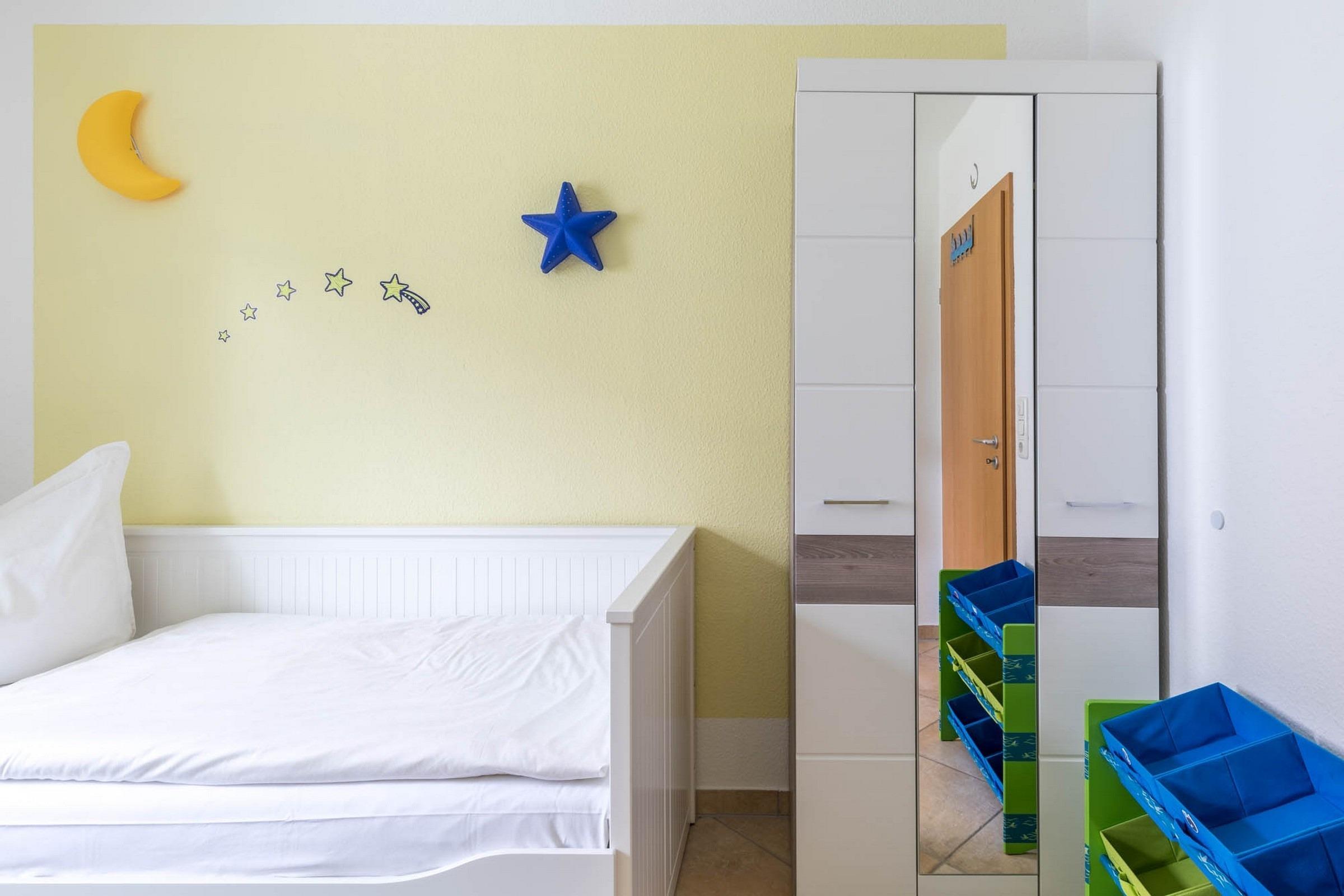 Die Wohnung verfügt über zwei separate Schlafzimmer: In dem größeren Schlafzimmer befindet sich ein Doppelbett (180 x 200cm, getrennte Matratzen) und ein großer Kleiderschrank, im zweiten Schlafzimmer befindet sich ein Einzelbett (80 x 200cm), welches man bei Bedarf zu einem Doppelbett (160 x 200cm) ausziehen kann und ebenfalls ein Kleiderschrank sowie Regal und Kommode.