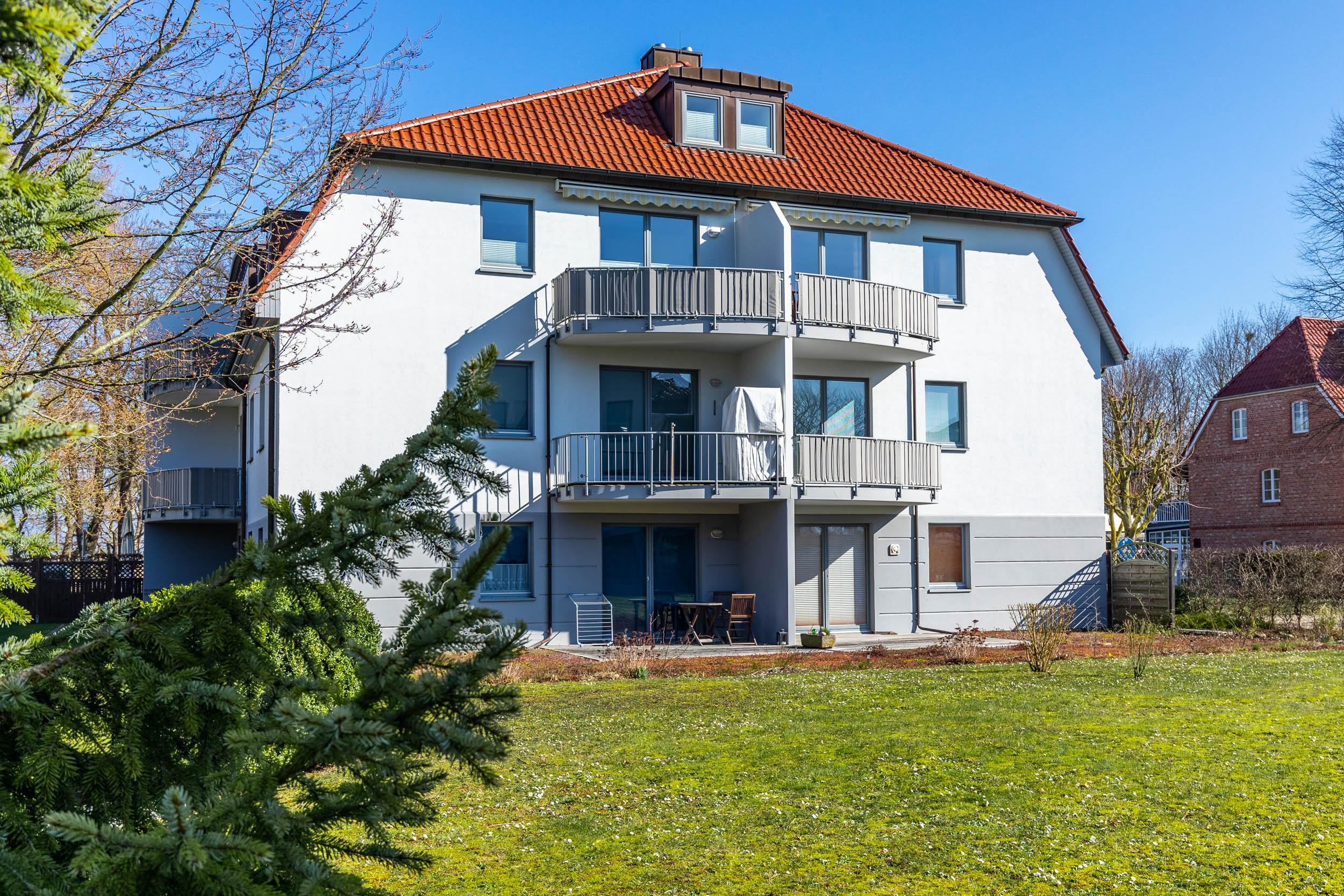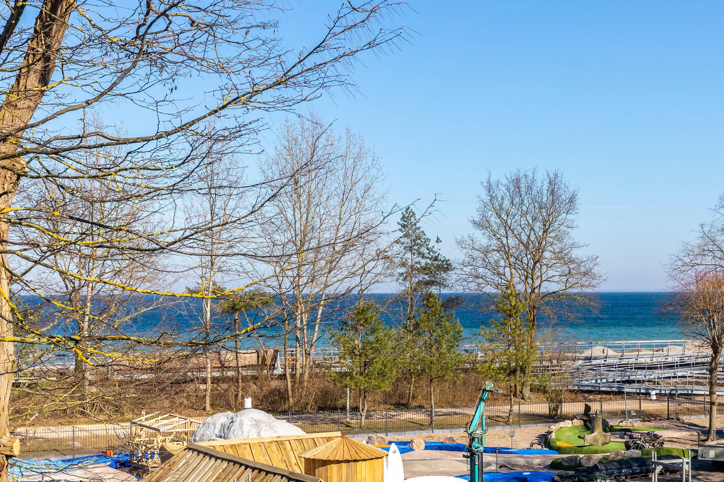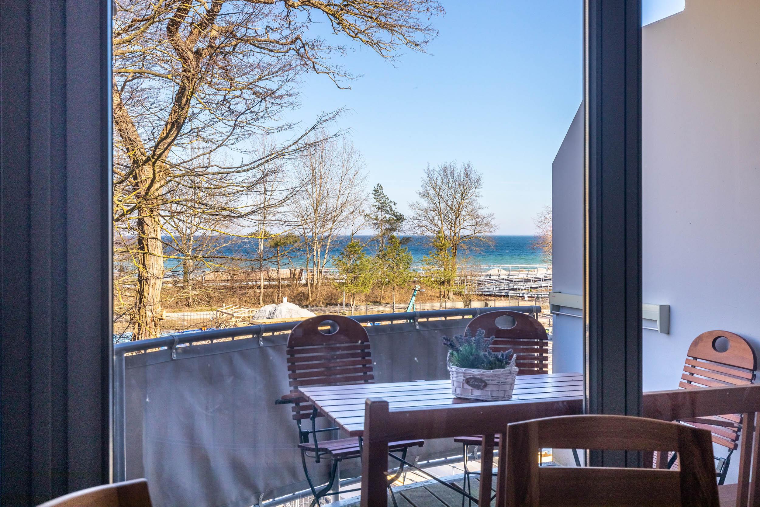 Im Wohnbereich, welches sich in der ersten Wohnebene befindet, sorgen bequeme Ledermöbel für Wohnkomfort, der vorhandene Flatscreen-TV sorgt für die Multimediaunterhaltung. Von hier aus gelangen Sie auf den möblierten Nordost-Balkon mit tollem Ostseeblick (im Frühjahr/ Sommer etwas eingeschränkter durch ein paar Bäume).