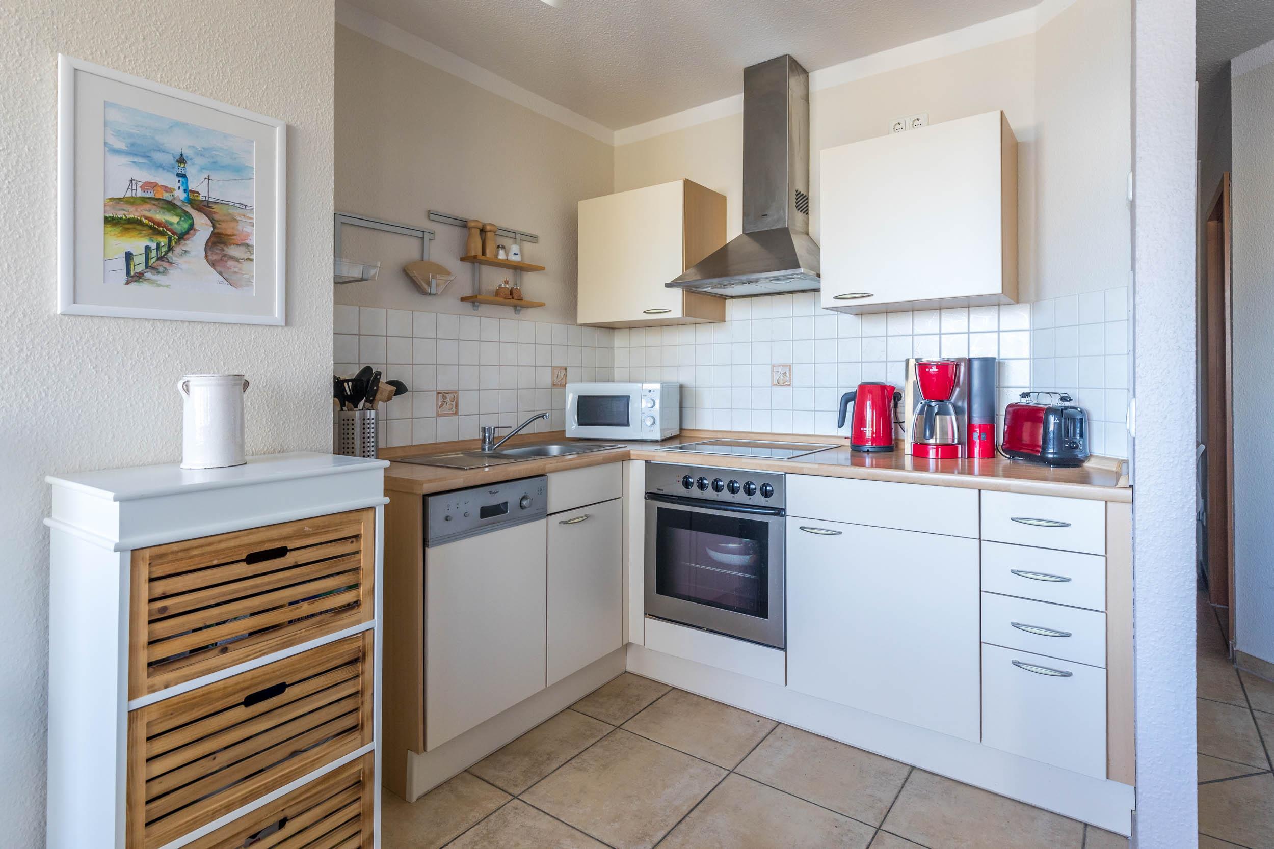 In der offenen Wohnküche finden Sie u.a. einen Backofen mit Cerankochfeld, einen Geschirrspüler, Mikrowelle, einen Kühlschrank mit Gefrierfach, einen Wasserkocher, einen Toaster sowie eine Kaffeemaschine. Der Esstisch mit passenden Stühlen sorgt für Wohlfühlatmosphäre.