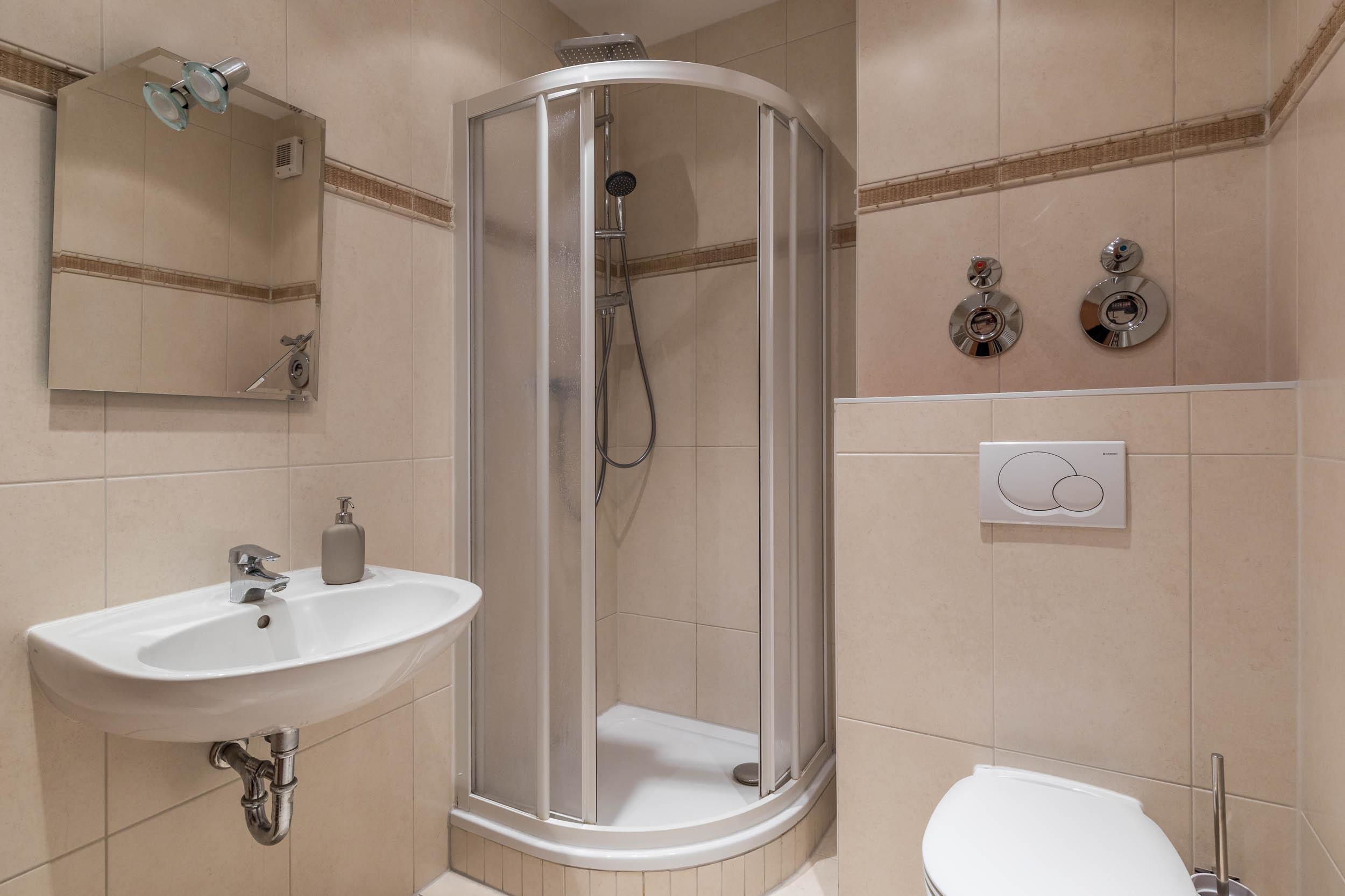Auch das hell geflieste Badezimmer liegt in der ersten Etage. Hier finden Sie eine Dusche und das WC vor. Wärmen Sie Ihre Duschtücher gern an der elektrischen Handtuchheizung.