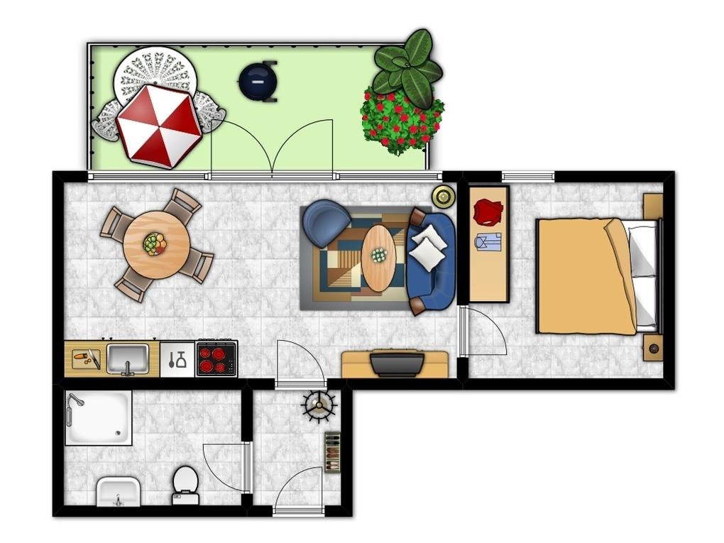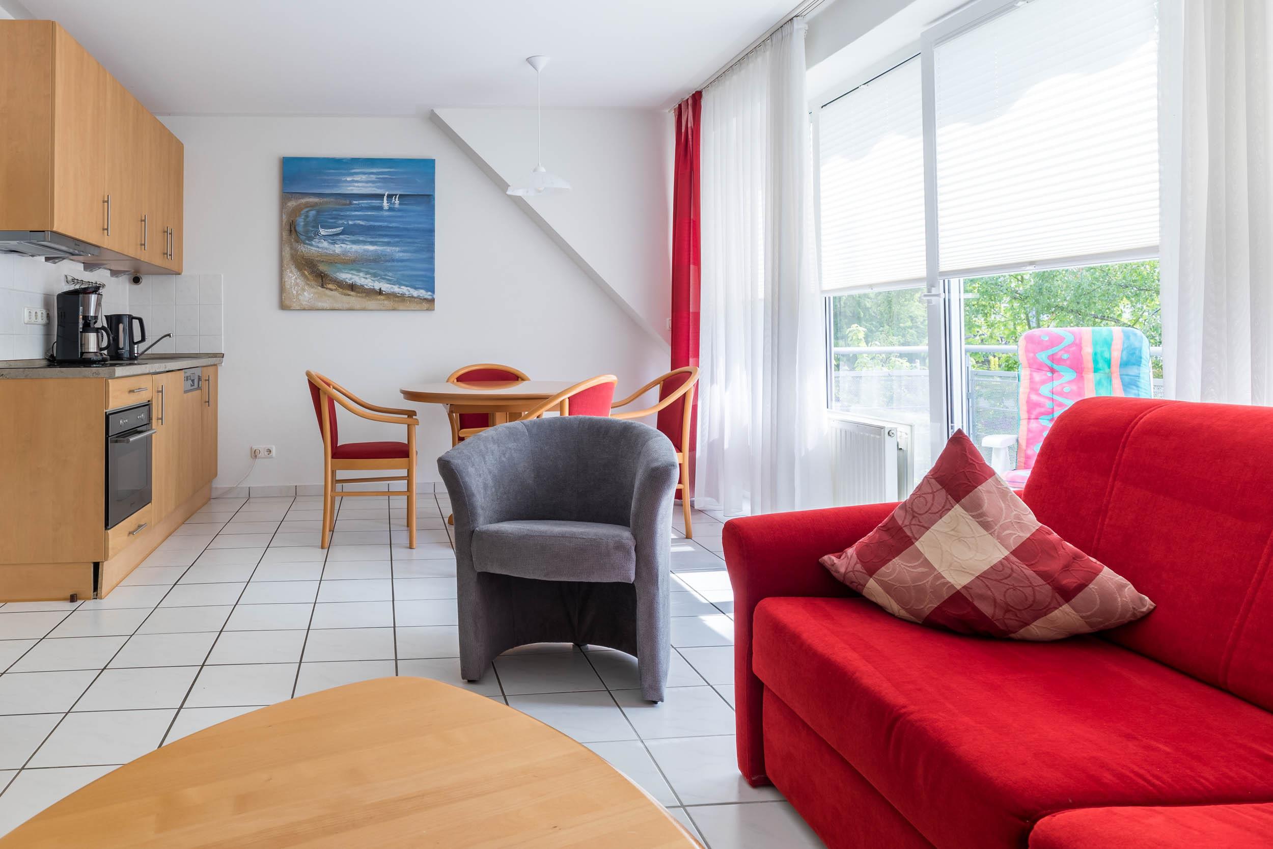 Die gemütliche Wohnung verfügt über einen offenen Wohn- und Essbereich mit integrierter Küchenzeile. Für Sicht- und Sonnenschutz sorgen Plissees. Flatscreen-TV, Radio und DVD-Player sorgen hier für mediale Unterhaltung. Das Sofa im Wohnbereich kann sonst bei Bedarf auch ausgezogen werden (Liegefläche ausgezogen 150x180cm).