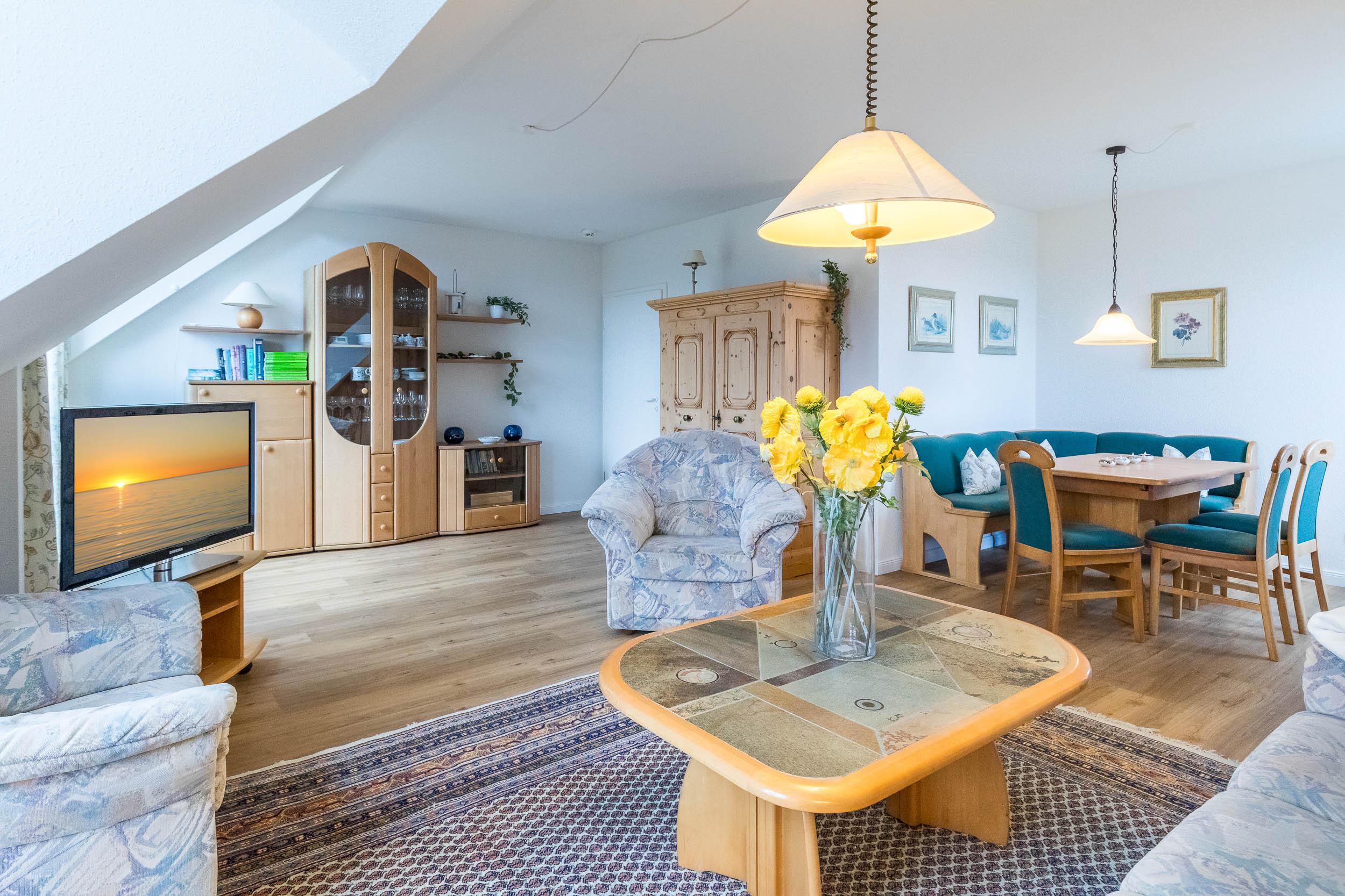 Das Wohnzimmer ist mit einem bequemen Sofa sowie drei passenden Sesseln eingerichtet. Ein TV sorgt hier für gute Multimediaunterhaltung. Die angrenzende Essecke bietet Platz für alle Gäste.
