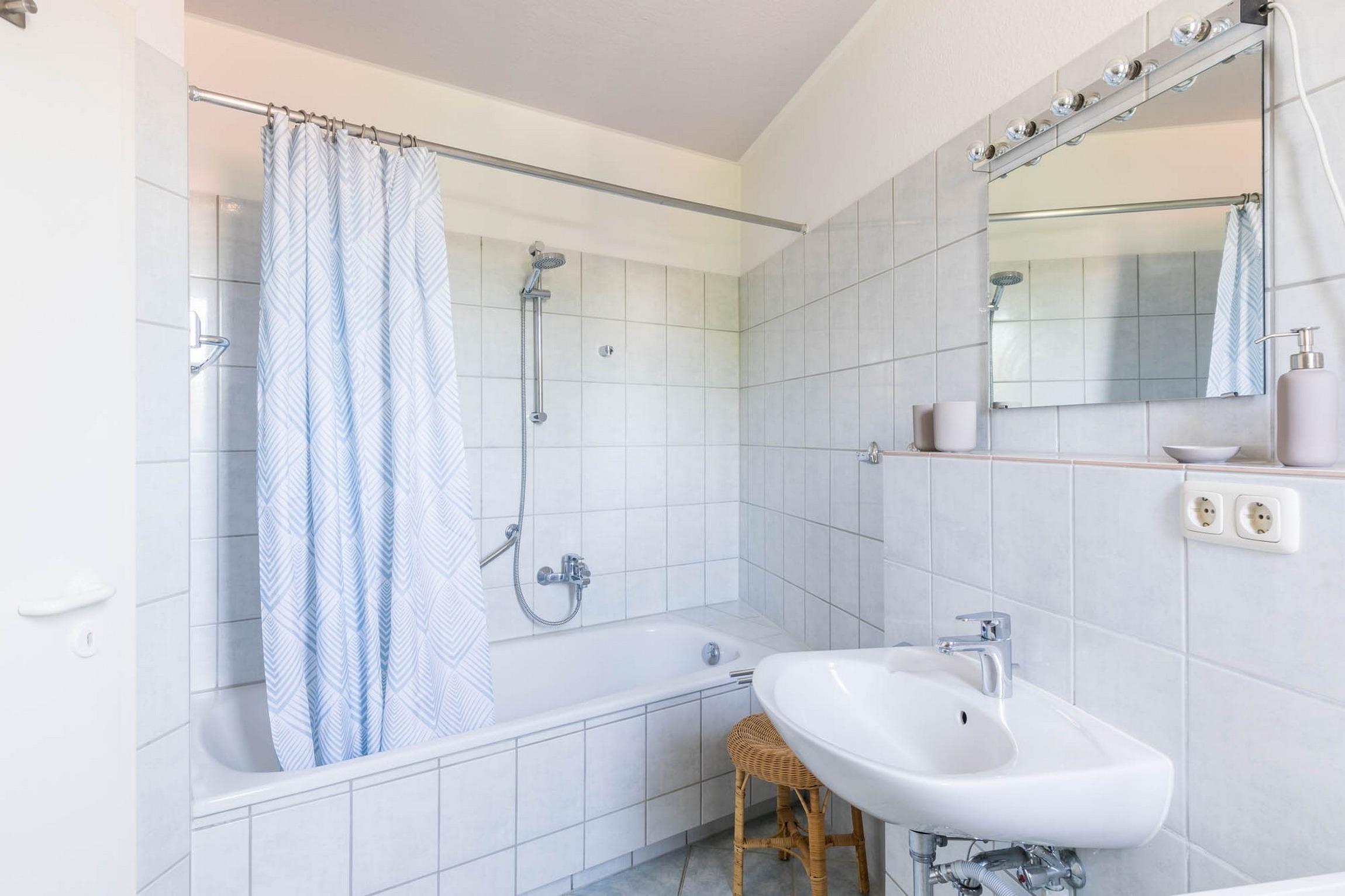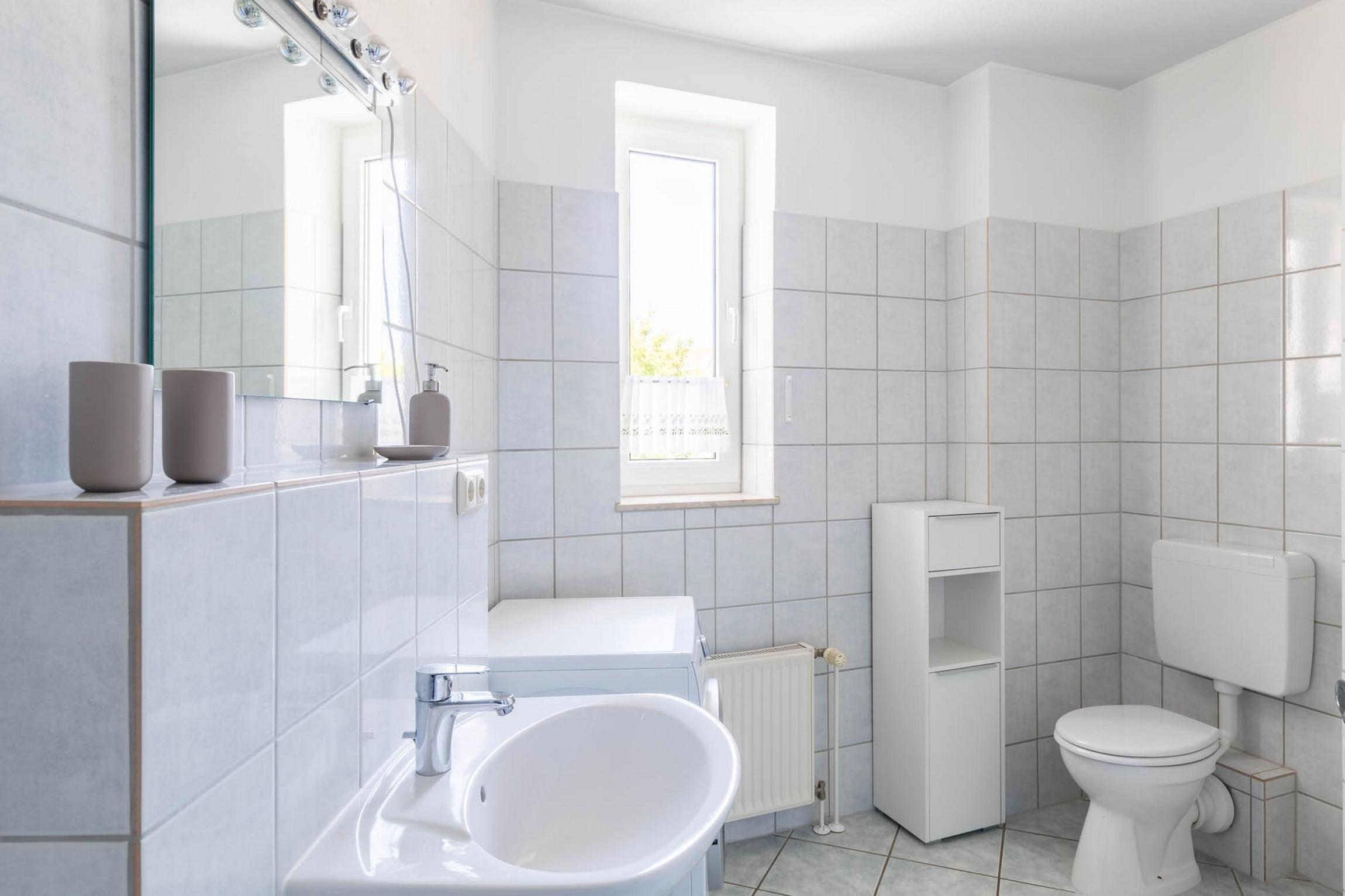 Im zweiten Bad, welches sich im 1. Obergeschoss befindet, gibt es neben einer Badewanne mit Duschvorhang und diversen Haltegriffen auch ein WC und eine Waschmaschine. Ein Fön gehört ebenfalls zur Komplettausstattung. Das Fenster im Bad spendet viel Tageslicht und erleichtert das Lüften nach dem Baden oder Duschen.