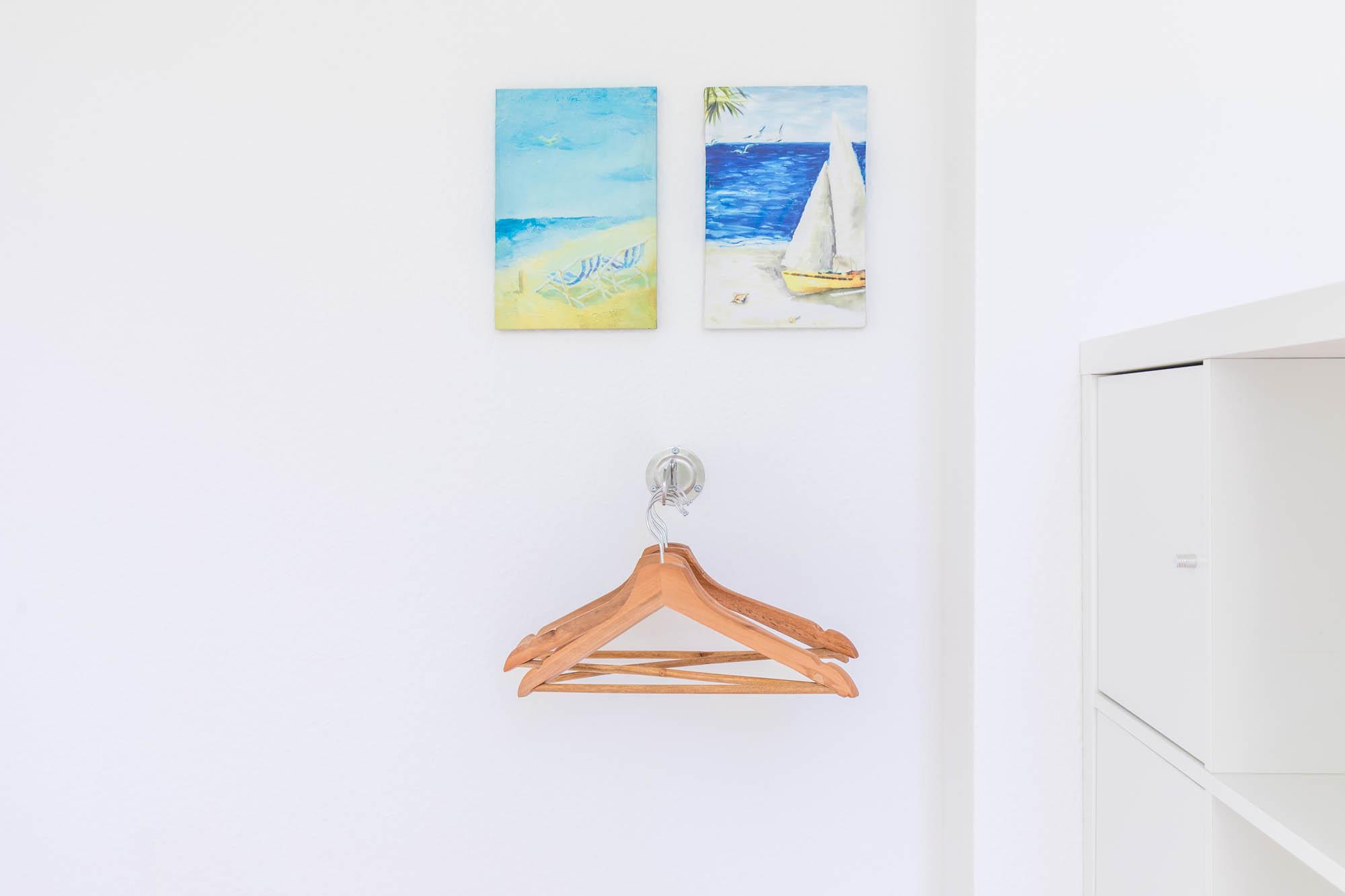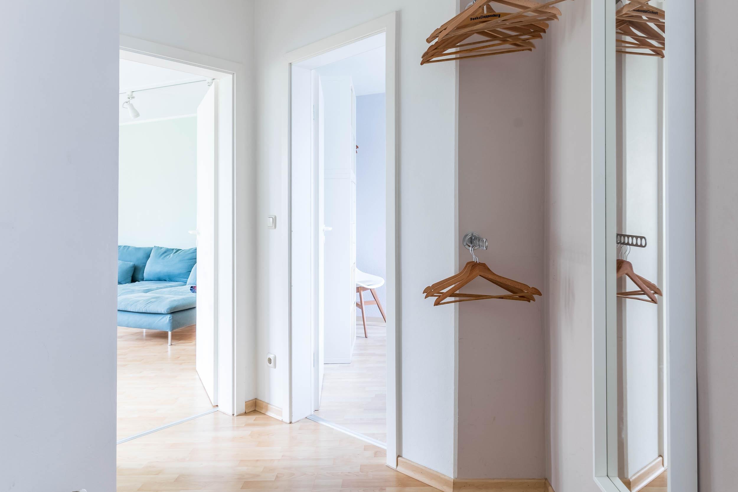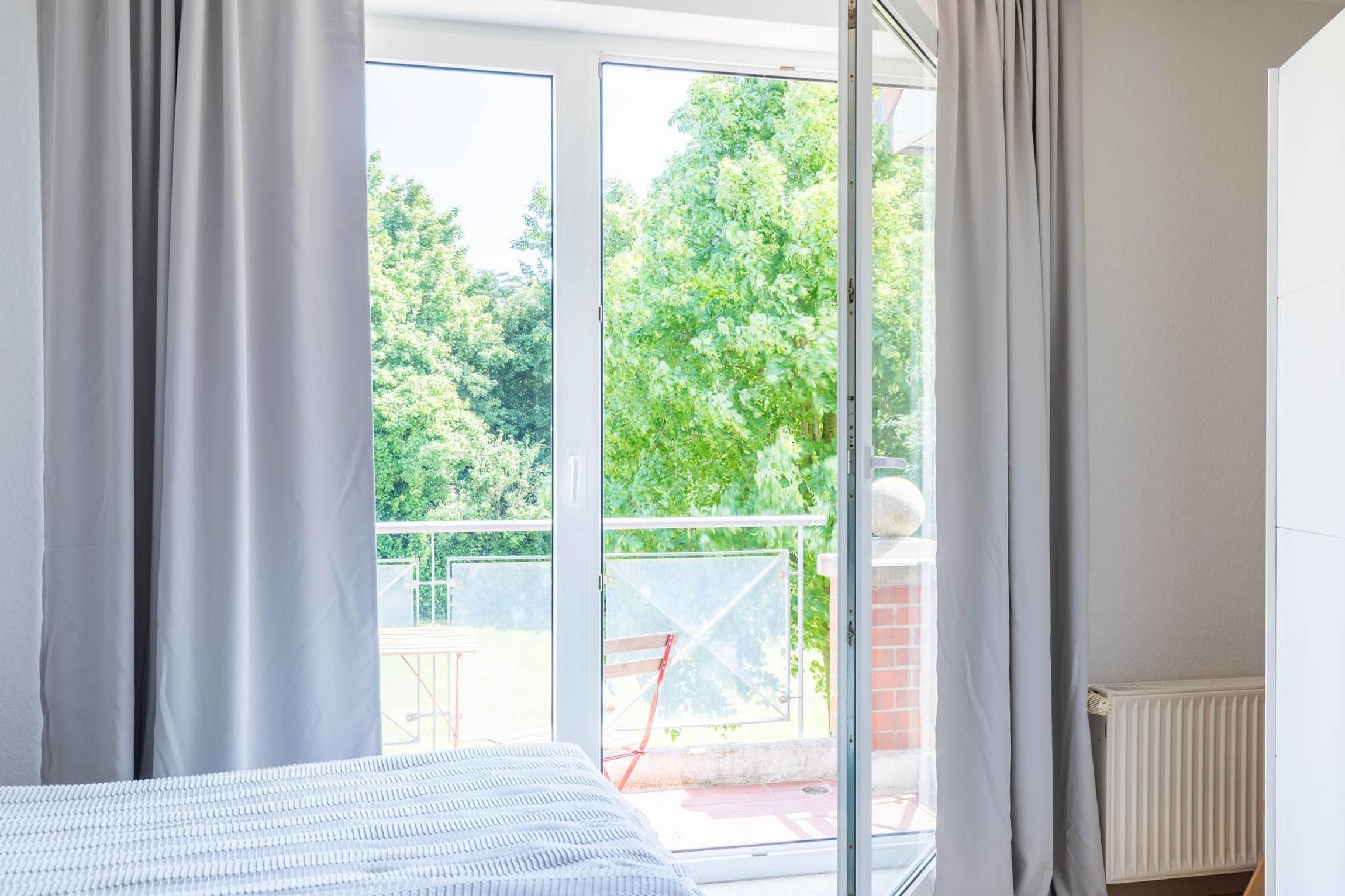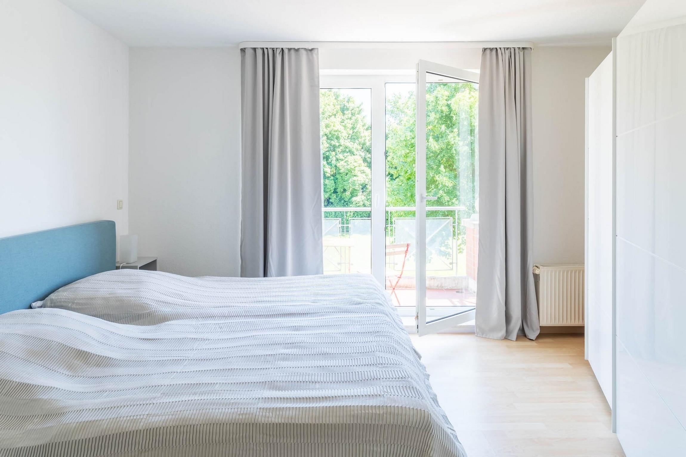 Ebenso finden Sie auf dieser Etage die beiden weiteren Schlafzimmer. Das größte Schlafzimmer ist mit einem Doppelbett (180x200) und einem Kleiderschrank möbliert. Im anderen Schlafzimmer steht ein Kojenbett (Einzelbett mit ausziehbarem zweiten Bett) bereit. Ein kleiner Balkon mit Blicks ins Grüne gehört hier ebenfalls zur Ausstattung.