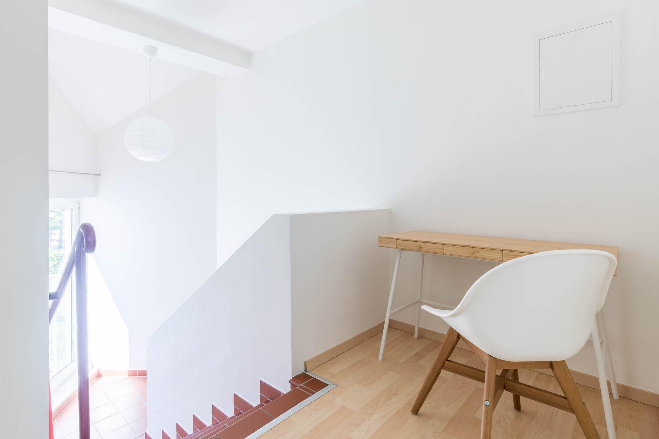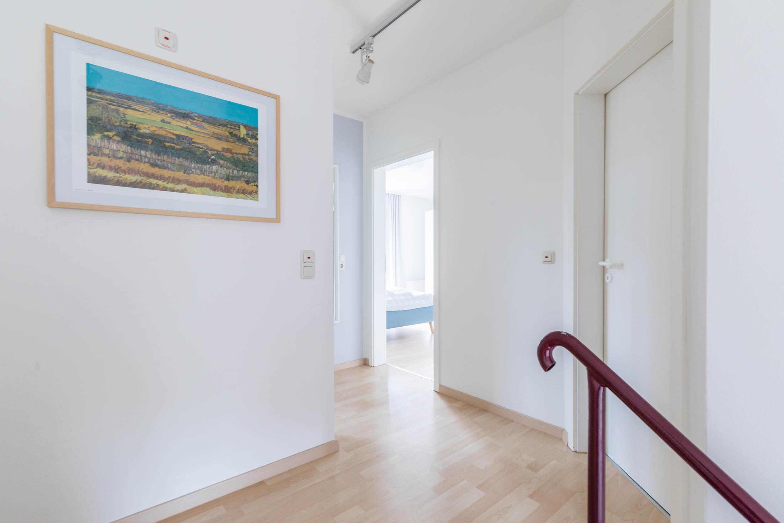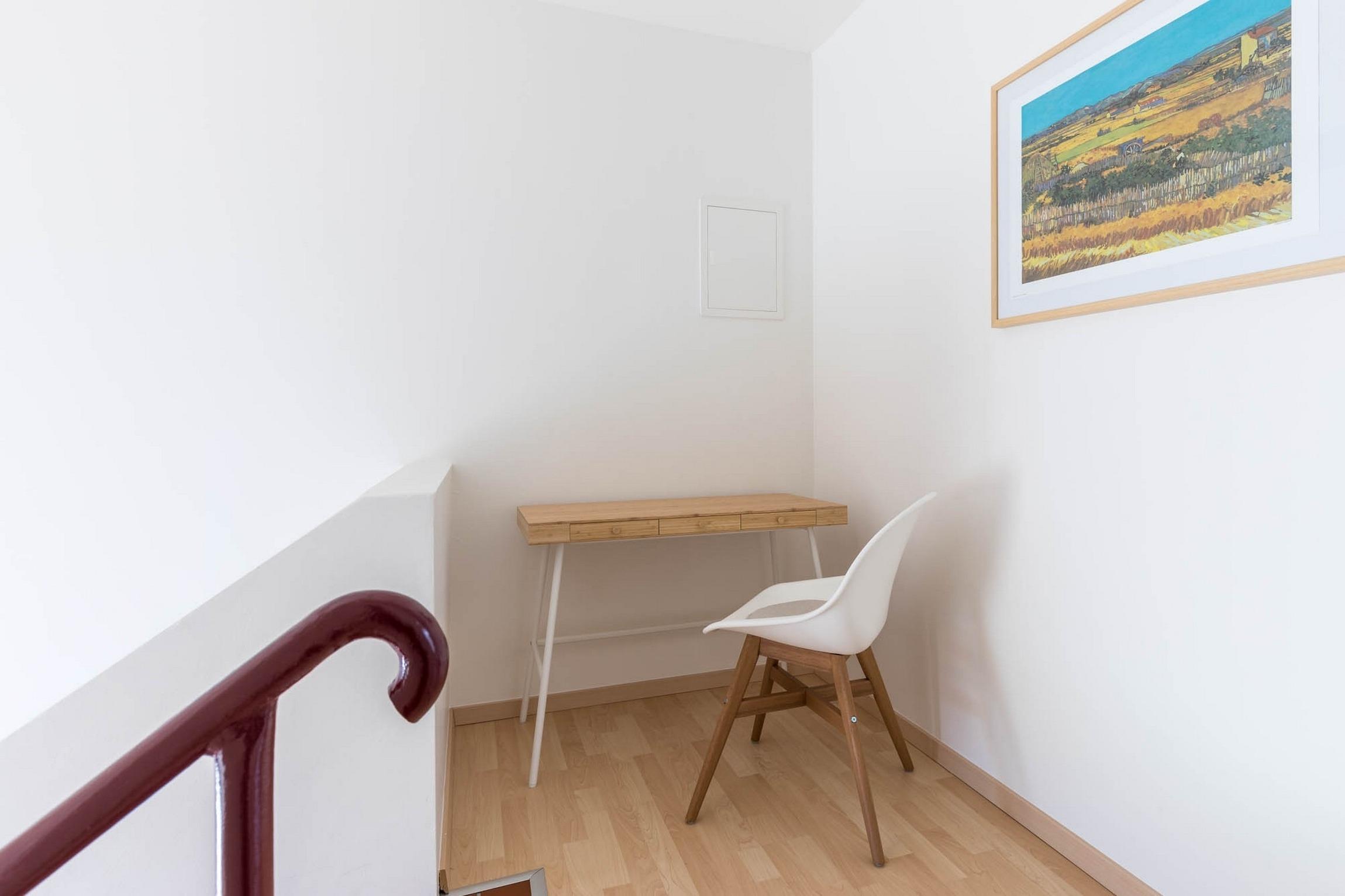 Vom Flur aus führt eine Treppe ins 1. Obergeschoss. Am oberen Ende begrüßt Sie in der kleinen Galerie ein Schreibtisch. Hier können Sie entspannt schreiben, malen, am PC arbeiten usw.