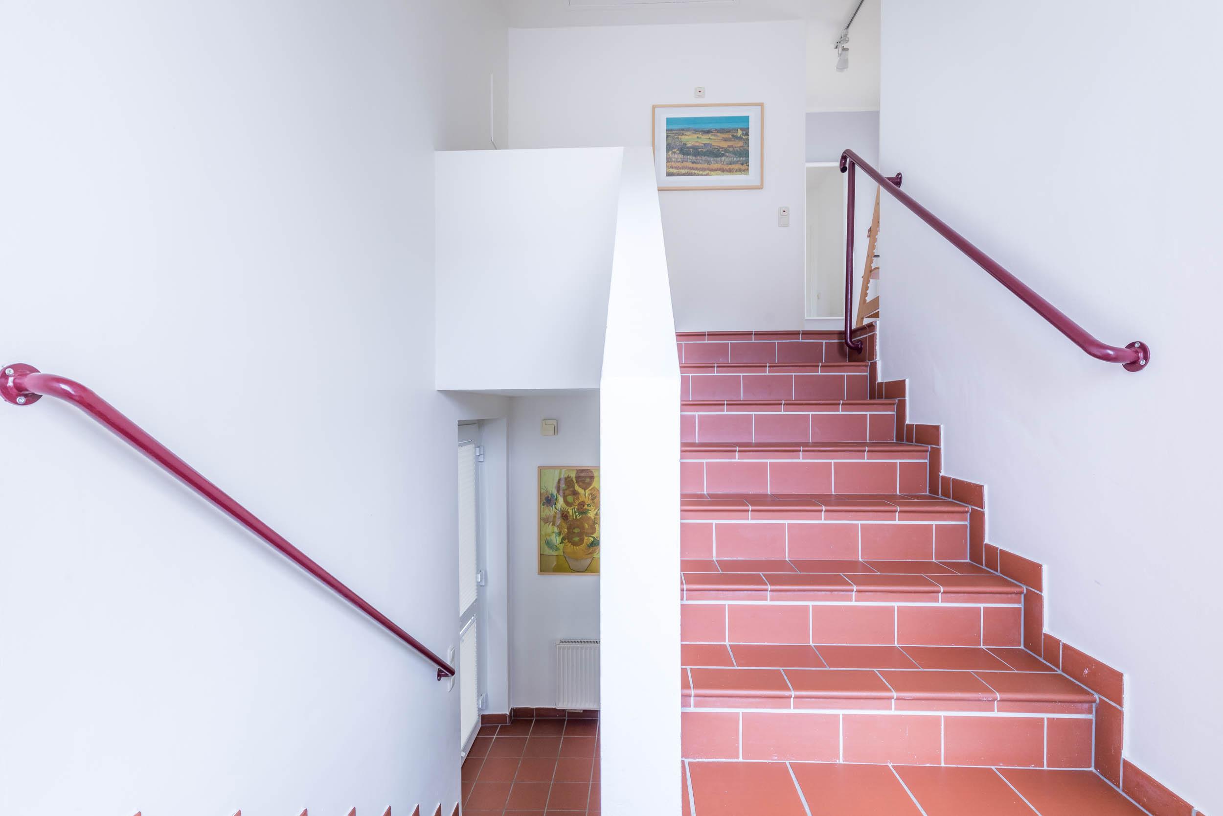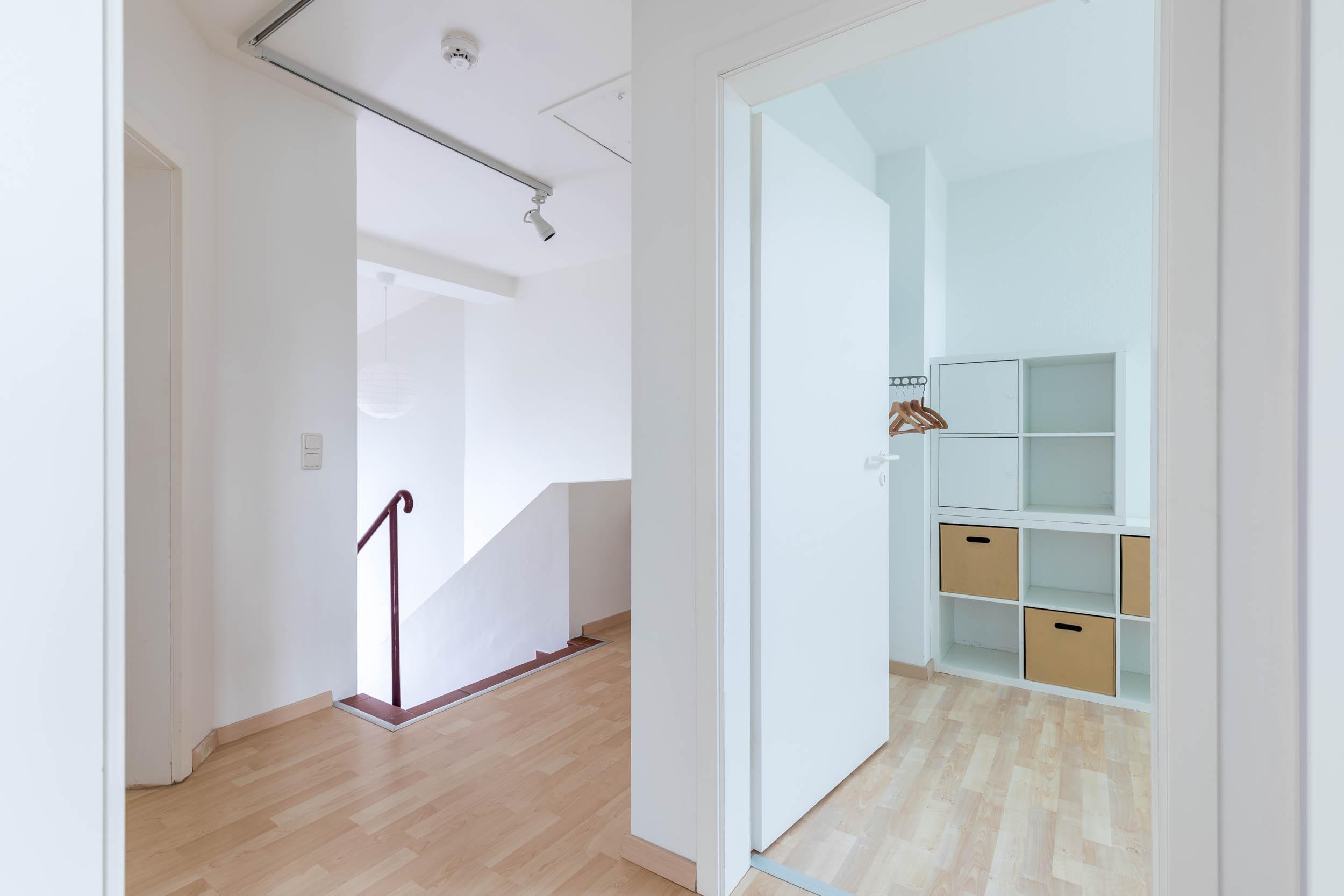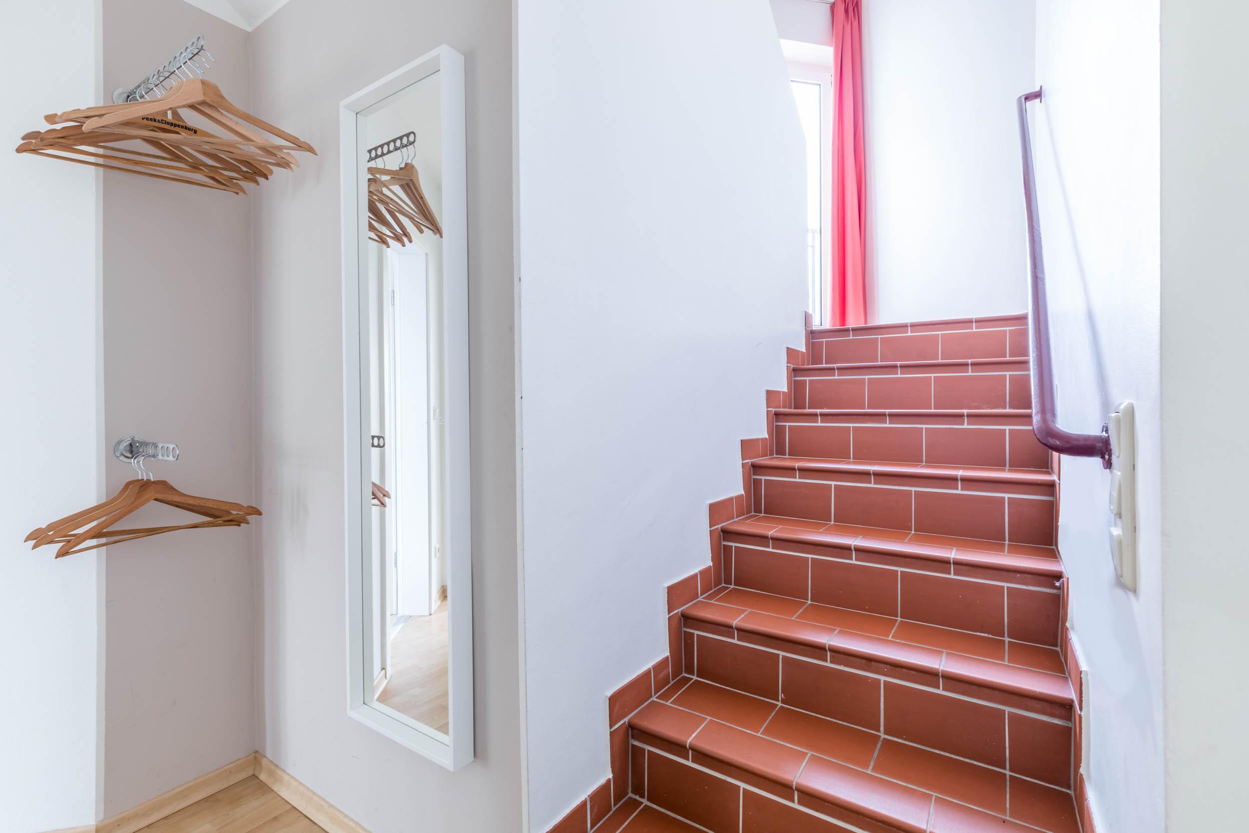 Vom Flur aus führt eine Treppe ins 1. Obergeschoss. Am oberen Ende begrüßt Sie in der kleinen Galerie ein Schreibtisch. Hier können Sie entspannt schreiben, malen, am PC arbeiten usw.