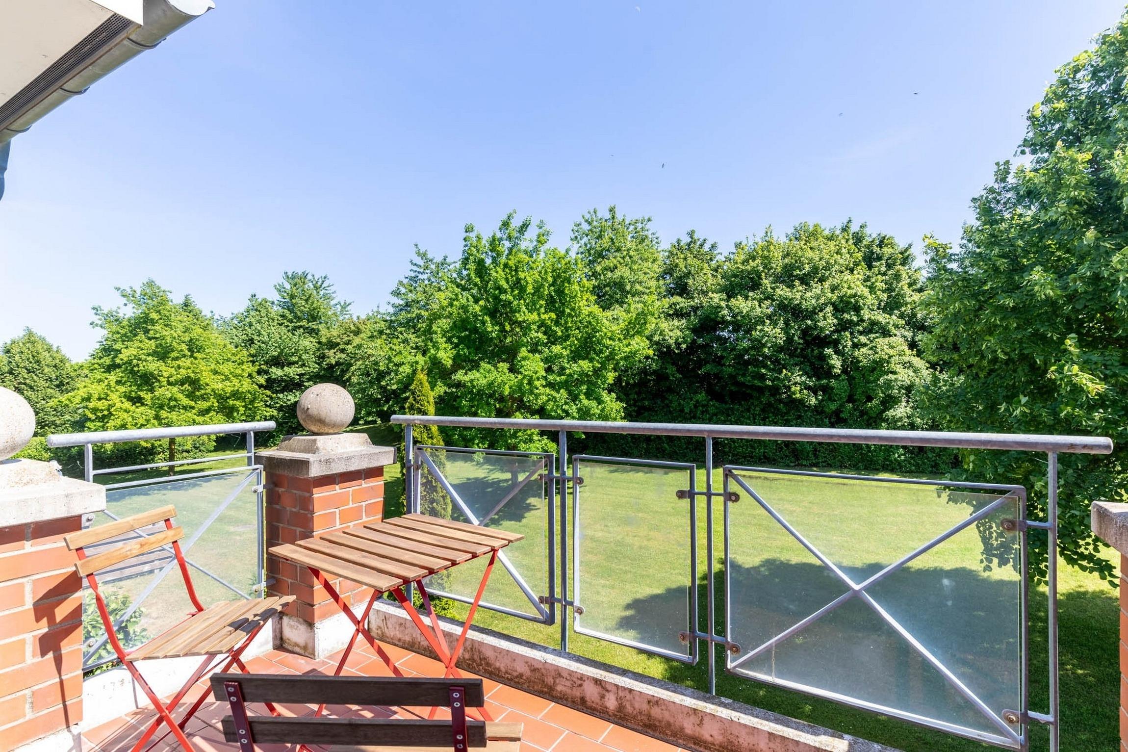Vom Wohnzimmer aus können Sie auch die möblierte Südost-Terrasse mit herrlichem Blick ins Grüne.