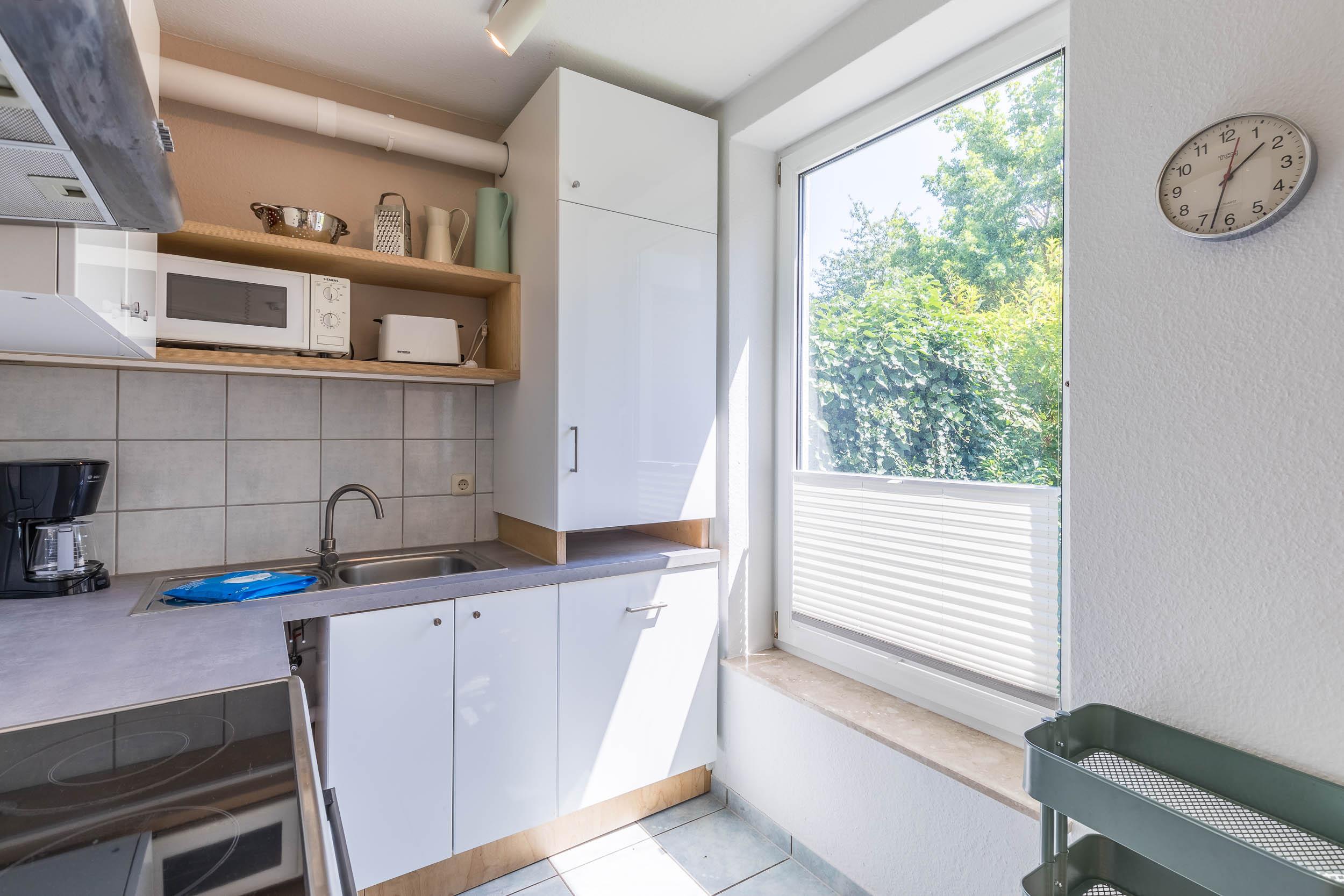Die offene Küche bietet mit Geschirrspüler, Herd/ Backofen, Kühlschrank mit Gefrierfach ausreichend Geschirr und vieles mehr eine umfangreiche Ausstattung. An der separaten Essecke finden alle Gäste Platz zum gemeinsamen Speisen (4 Stühle befinden sich am Tisch, 2 weitere sind in den Zimmern verteilt).