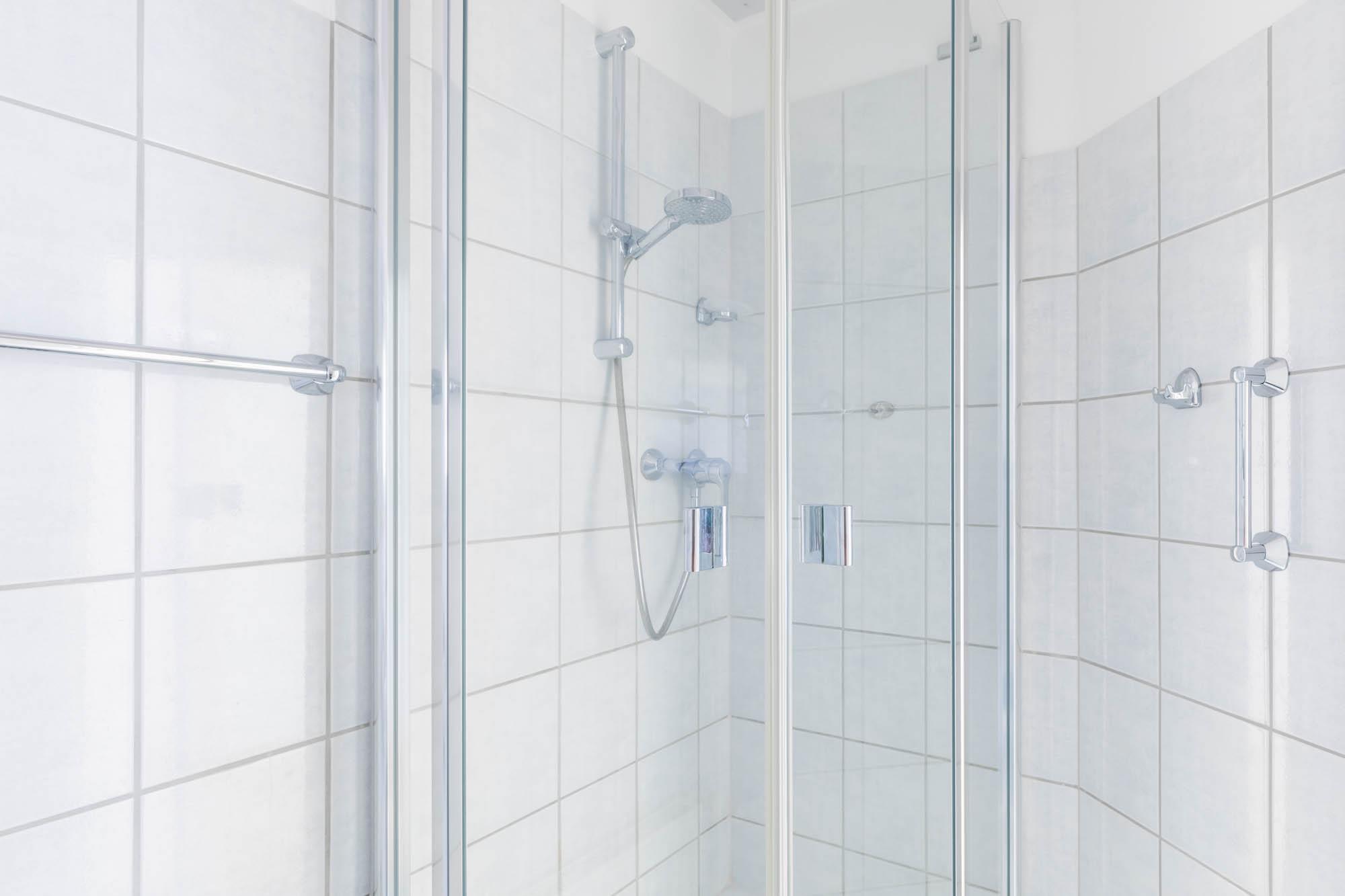 Weiterhin gibt es im Erdgeschoss ein Schlafzimmer mit Doppelbett (140x200m) sowie ein innen liegendes Duschbad mit WC. Ein Duschhocker steht hier bereit und kann bei Bedarf gern genutzt werden.