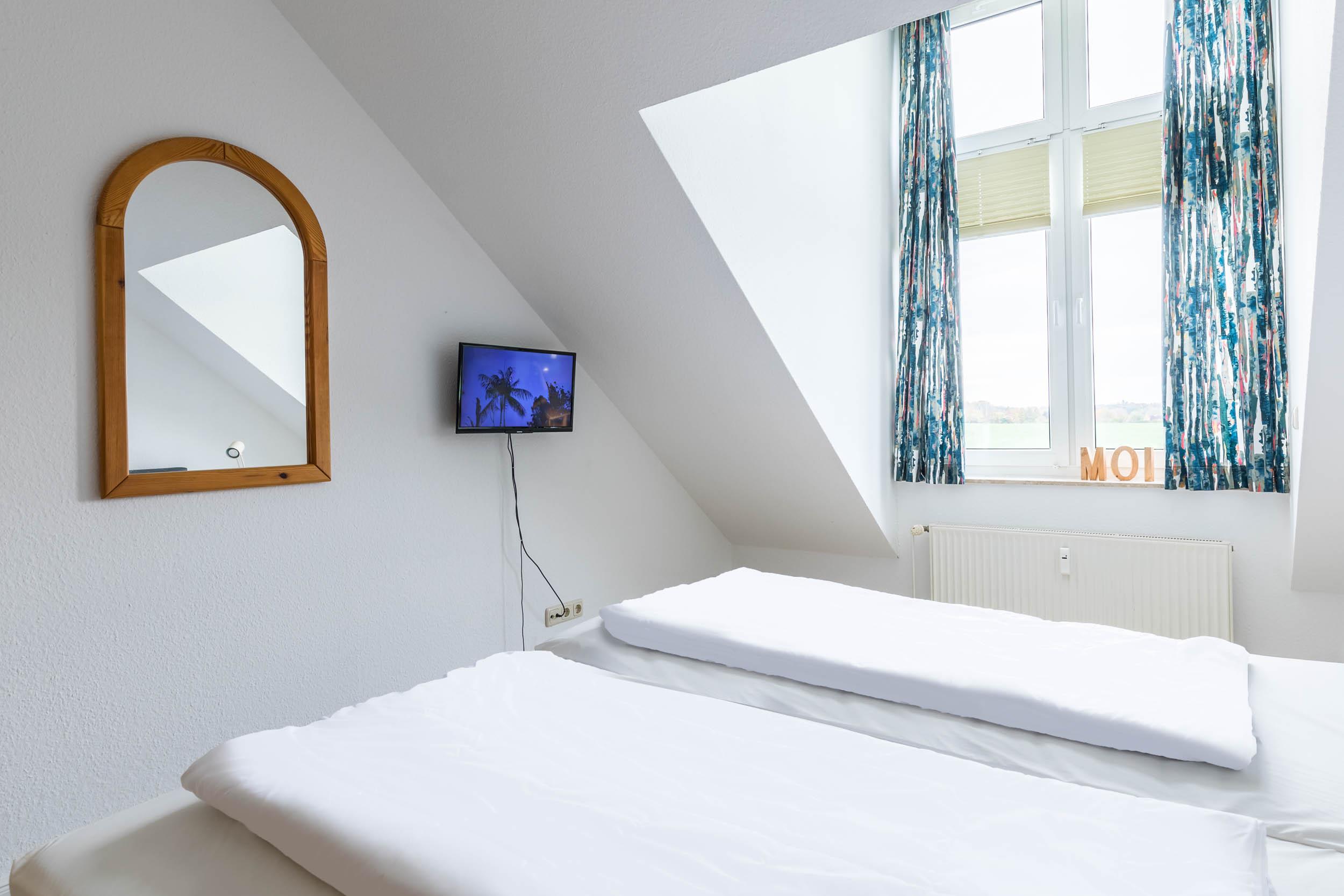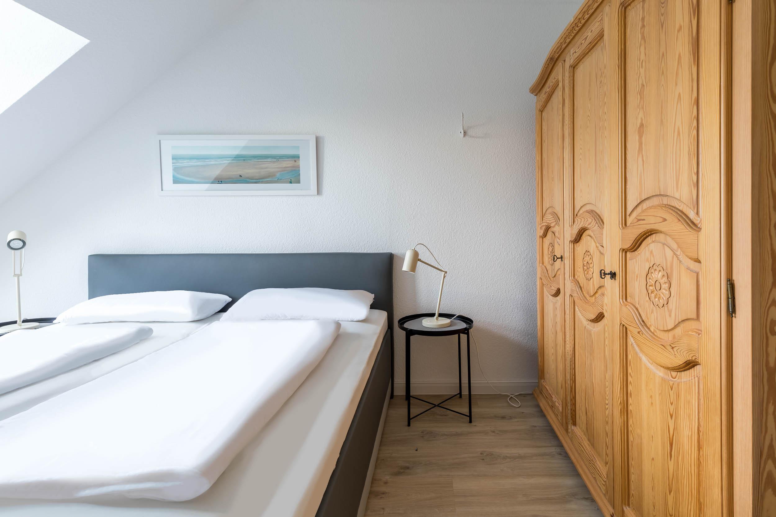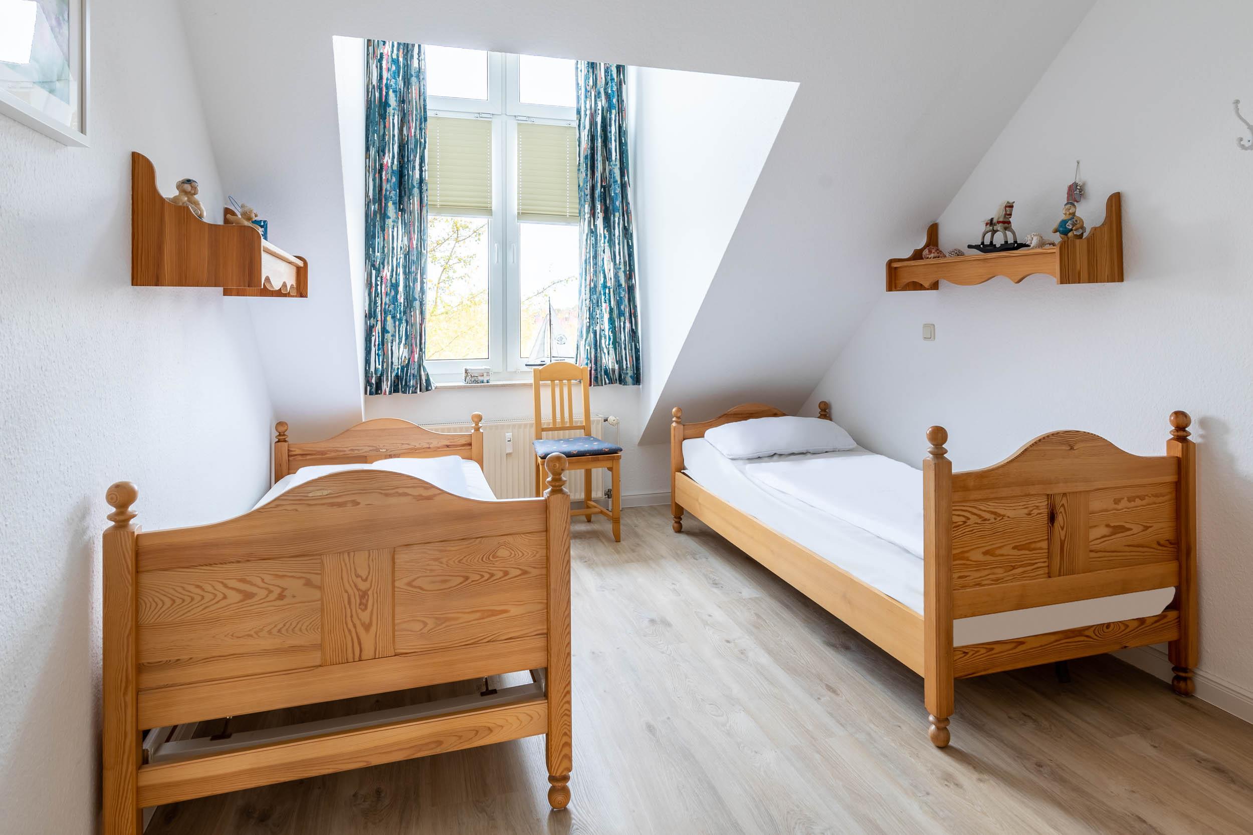Das Schlafzimmern ist mit einem bequemen Doppelbett (180x200cm), SAT-TV und einem Kleiderschrank für Ihre Urlaubsgarderobe eingerichtet. Im Gäste-/ Kinderzimmer finden Sie zwei Einzelbetten (je 90x200cm) und eine kleine Kommode.