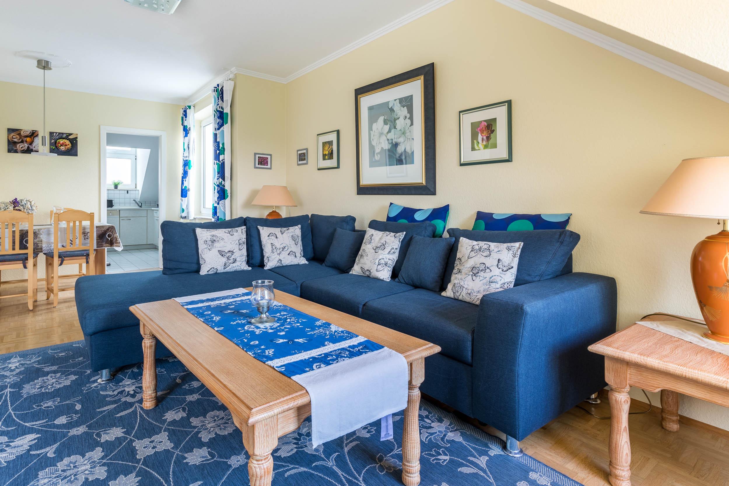 Sie verfügt über einen kombinierten Wohn-/Essbereich mit Zugang zum möblierten Südwest-Balkon. Eine große Sofaecke lädt zum geselligen Miteinander ein. Das Sofa im Wohnbereich kann bei Bedarf ausgezogen werden und so entsteht ein weiterer Schlafplatz (Liegefläche ausgeklappt 130x200cm). Für Ihre Unterhaltung sorgt der TV im Wohnbereich. Entspannen Sie bei einem gemütlichen Fernsehabend und beim Surfen über den hauseigenen WLAN Zugang.