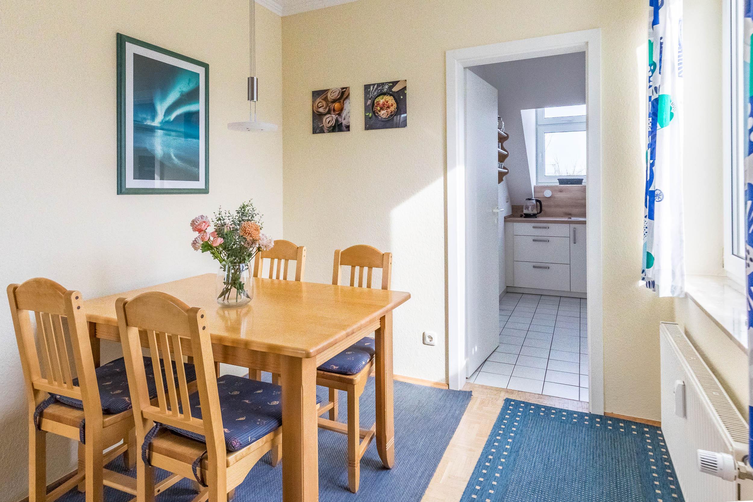 Genießen Sie am Esstisch ein leckeres, in der komfortabel ausgestatteten separaten Küche zubereitetes Mahl.