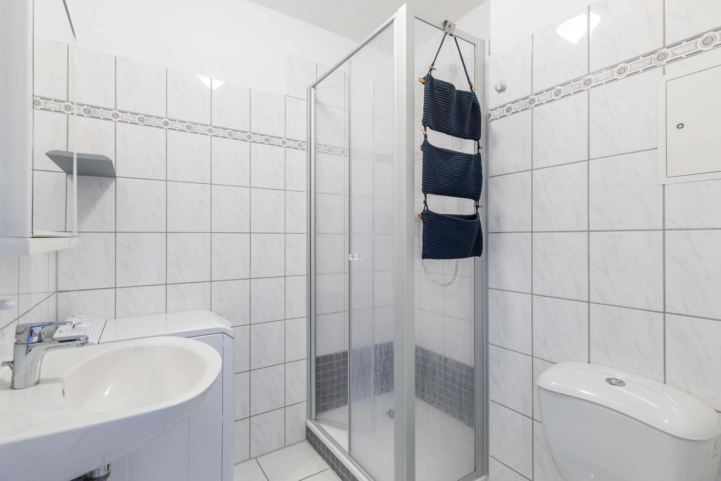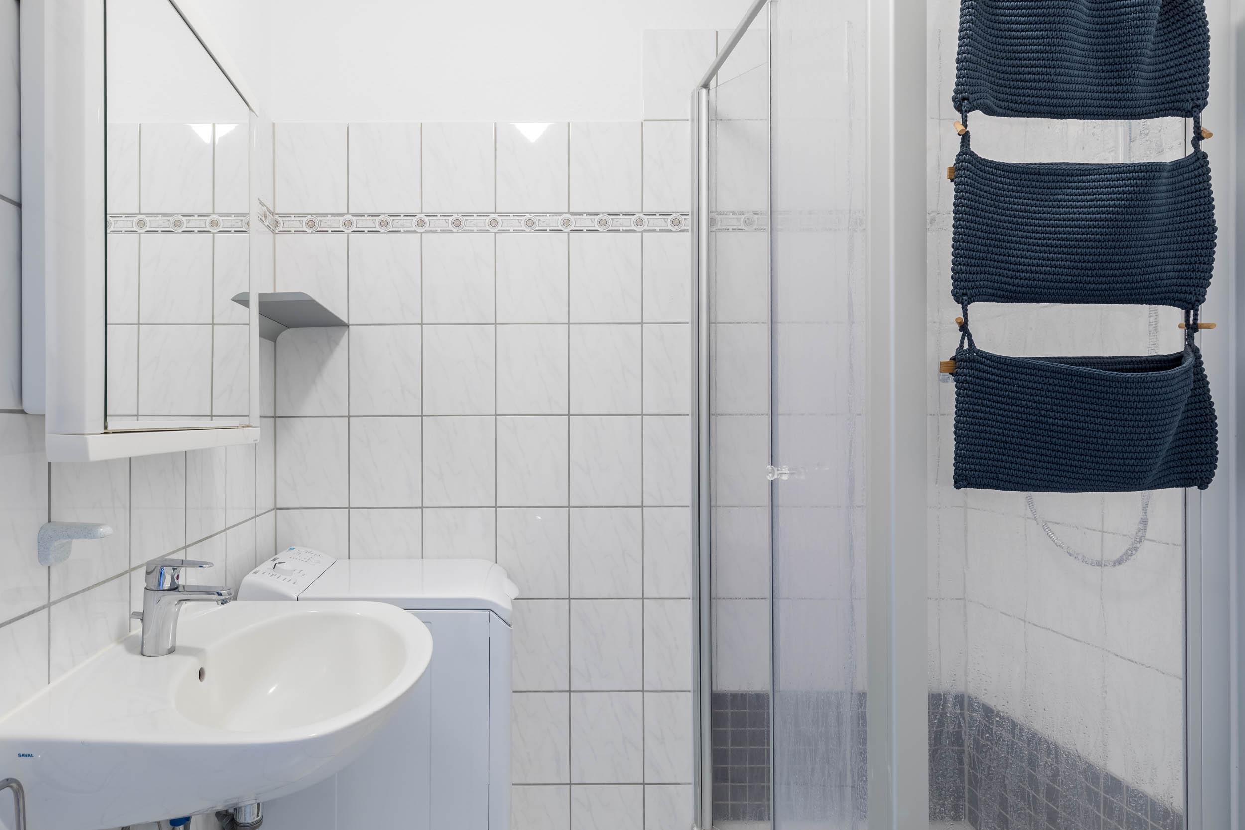Das hell geflieste Bad bietet Dusche, Föhn und WC. Weiterhin ist hier eine gebührenfreie Waschmaschine vorhanden.