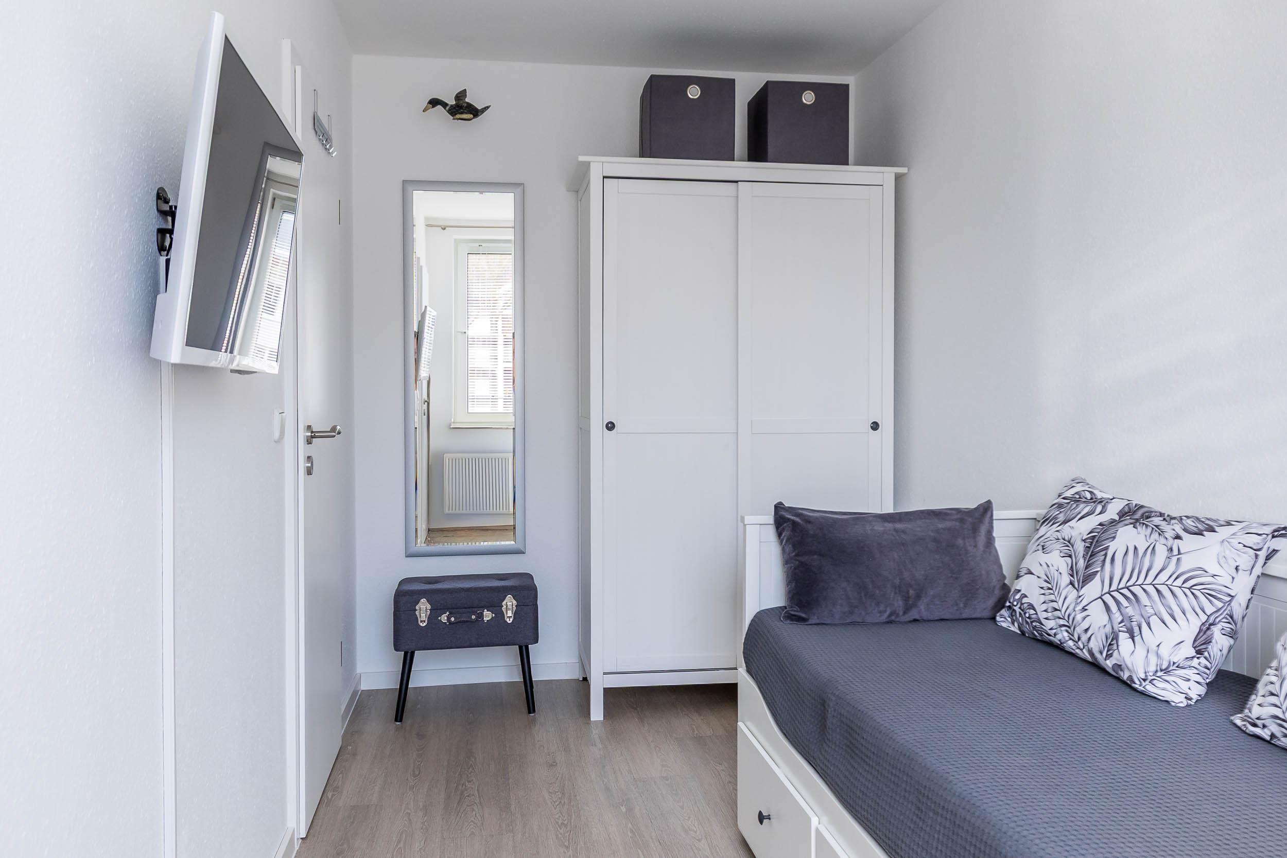Es gibt zwei separate Schlafzimmer. Das größere Schlafzimmer ist mit einem Doppelbett (180x200m) und einem Kleiderschrank für Ihre Garderobe bestückt. Das Gäste-/ Kinderzimmer bietet ein Einzelbett (80x200m) und einen Kleiderschrank. Das Bett lässt sich bei Bedarf ausziehen und so entsteht ein weiter Schlafplatz. Der zusätzliche TV ist ein weiteres Plus hier.