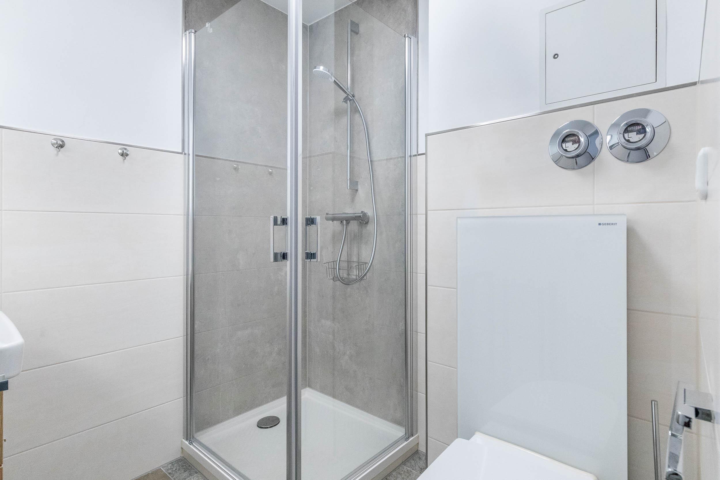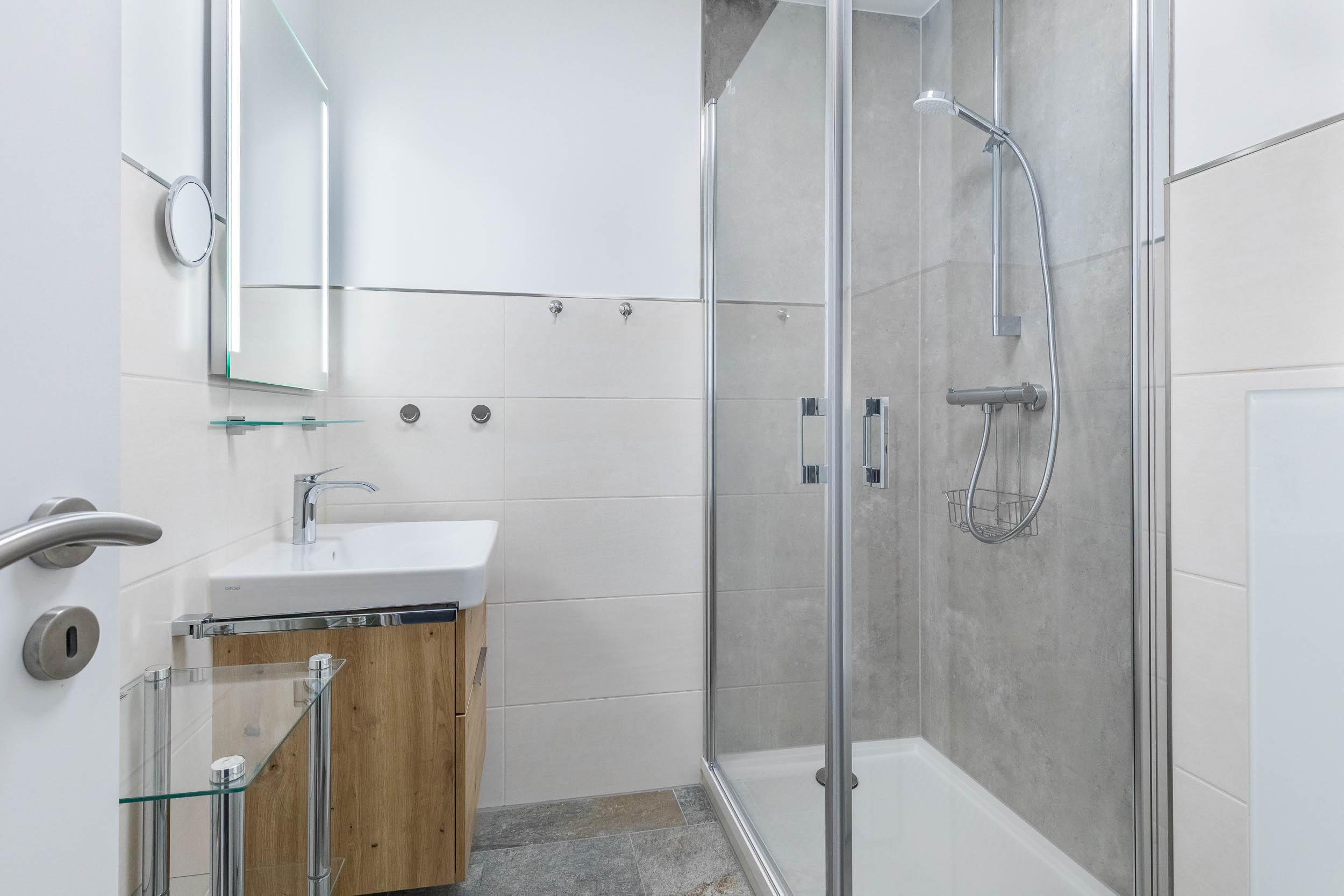 Im hell gefliesten Bad befinden sich eine Dusche, Waschbecken und WC.