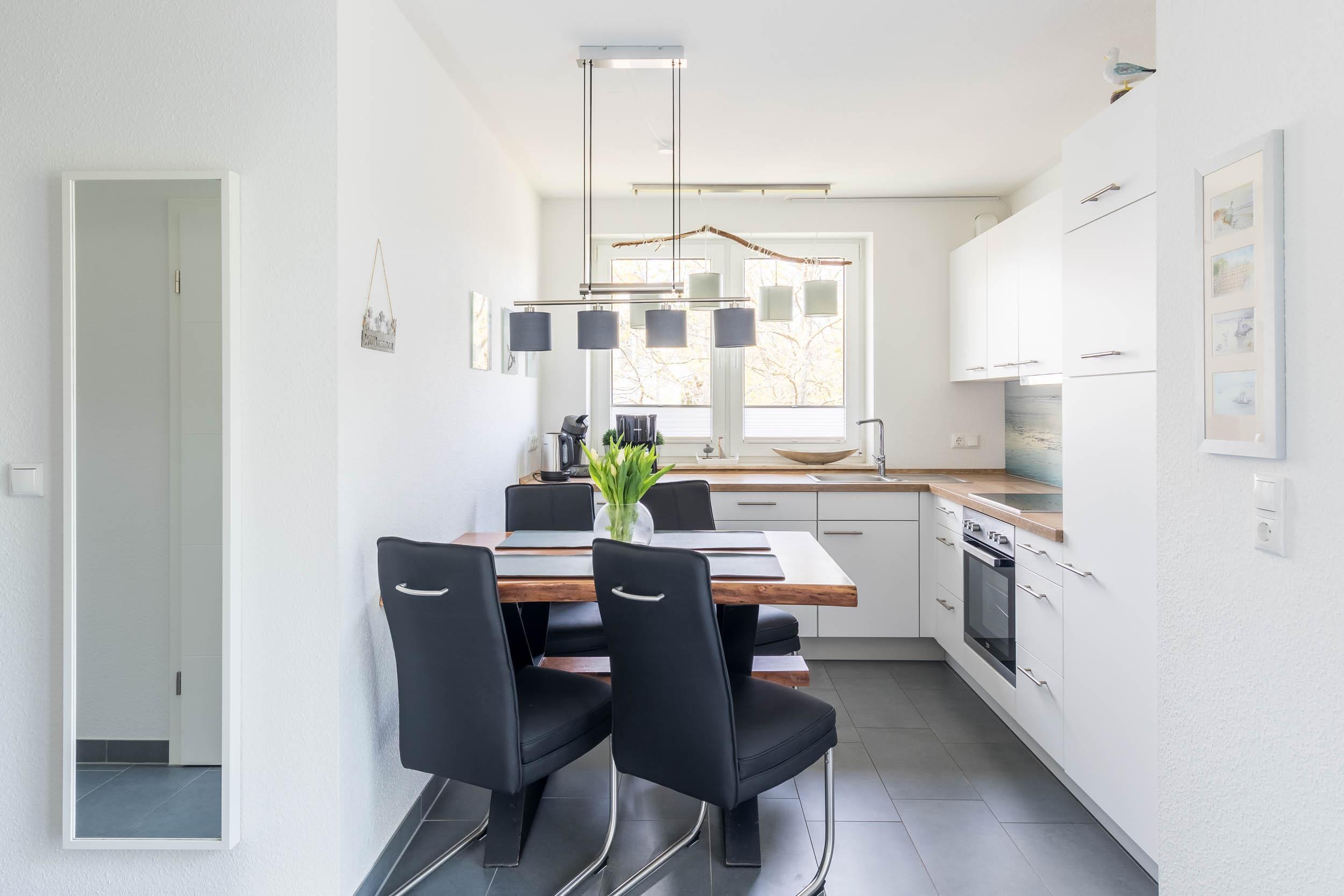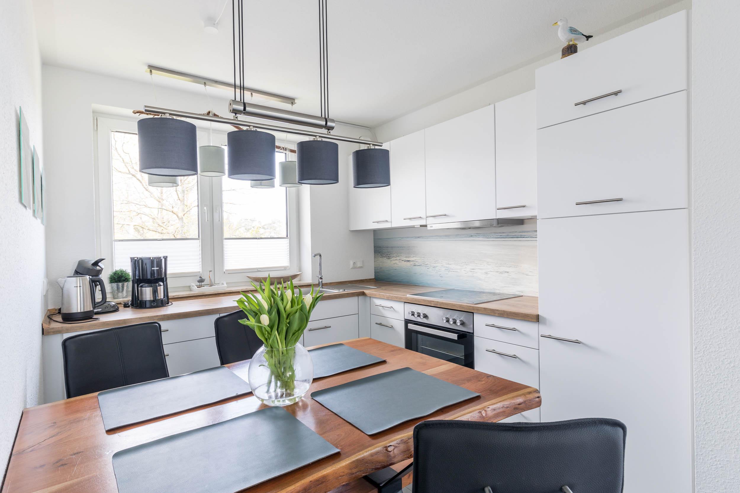 Die offene Einbauküche bietet eine Vollausstattung, so sind hier u.a. Herd, Backofen, Kühlschrank mit Gefrierfach, Geschirrspüler, Mikrowelle uvm. Ein passender Esstisch rundes das Paket ab.