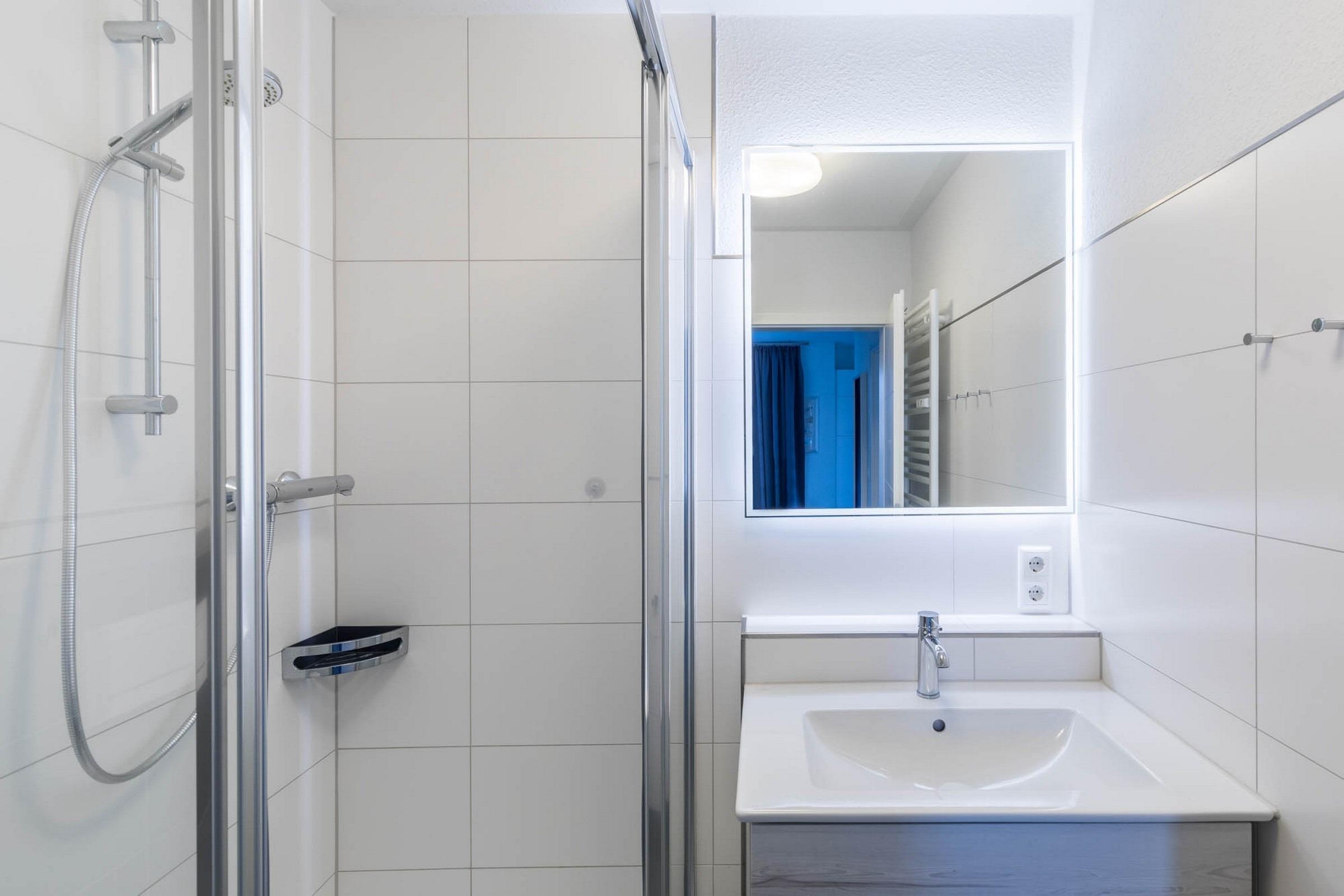 Im hell gefliesten Bad befinden sich eine Dusche, Waschbecken und WC.