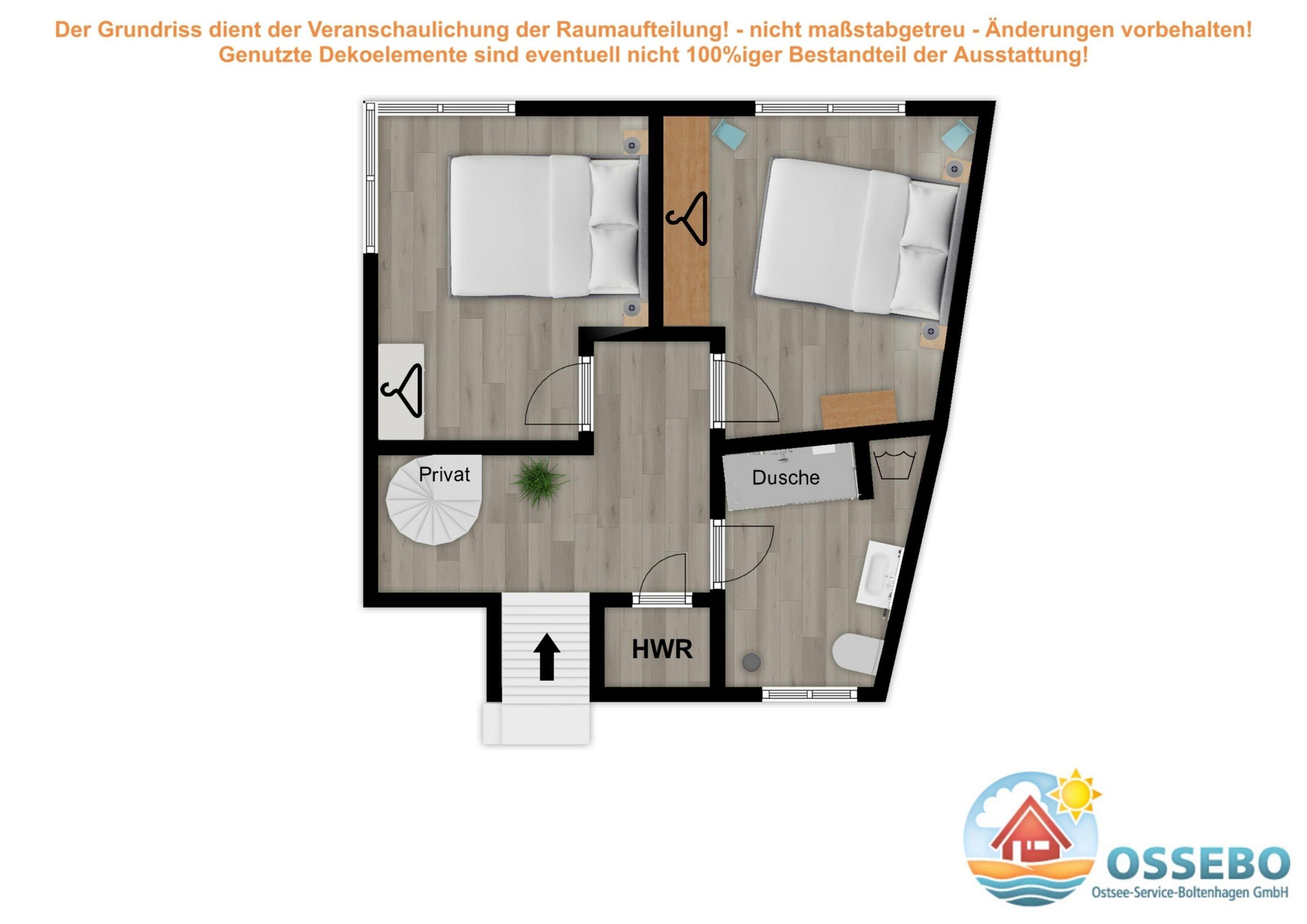 Weiterhin gibt es im Erdgeschoss ein Schlafzimmer mit einem Schlafsofa (160 x 200) und Kleiderschrank sowie ein Gäste WC.