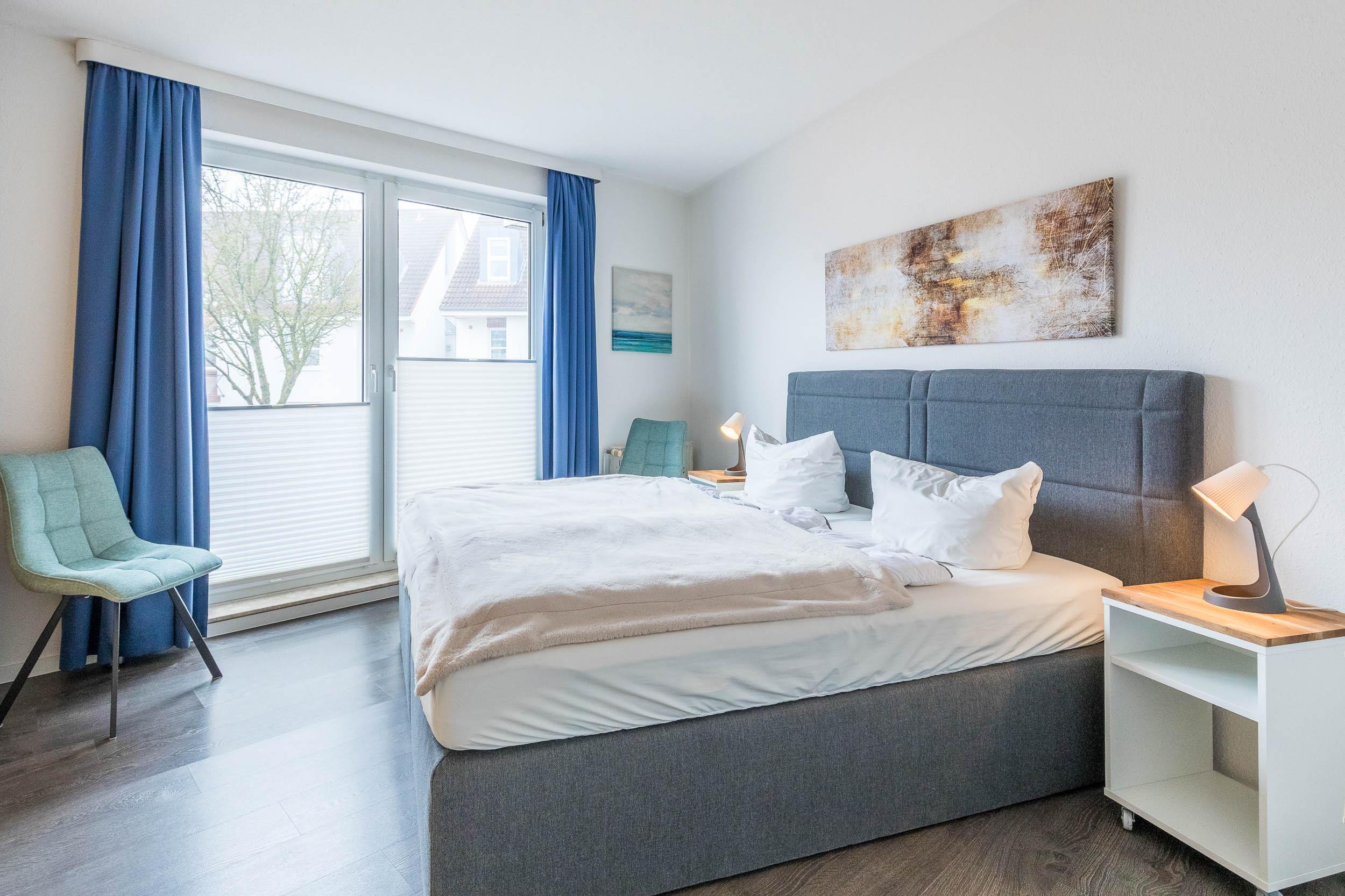 Hier befinden sich zwei weitere Schlafzimmer. Das größere Schlafzimmer ist mit einem Doppelbett (180x200), einem Kleiderschrank und einer Kommode ausgestattet. Von hier aus haben Sie Zugang zum sonnigen, möblierten Balkon. Im zweiten Schlafzimmer befindet sich ein Doppelbett (180x200) und ein Kleiderschrank.