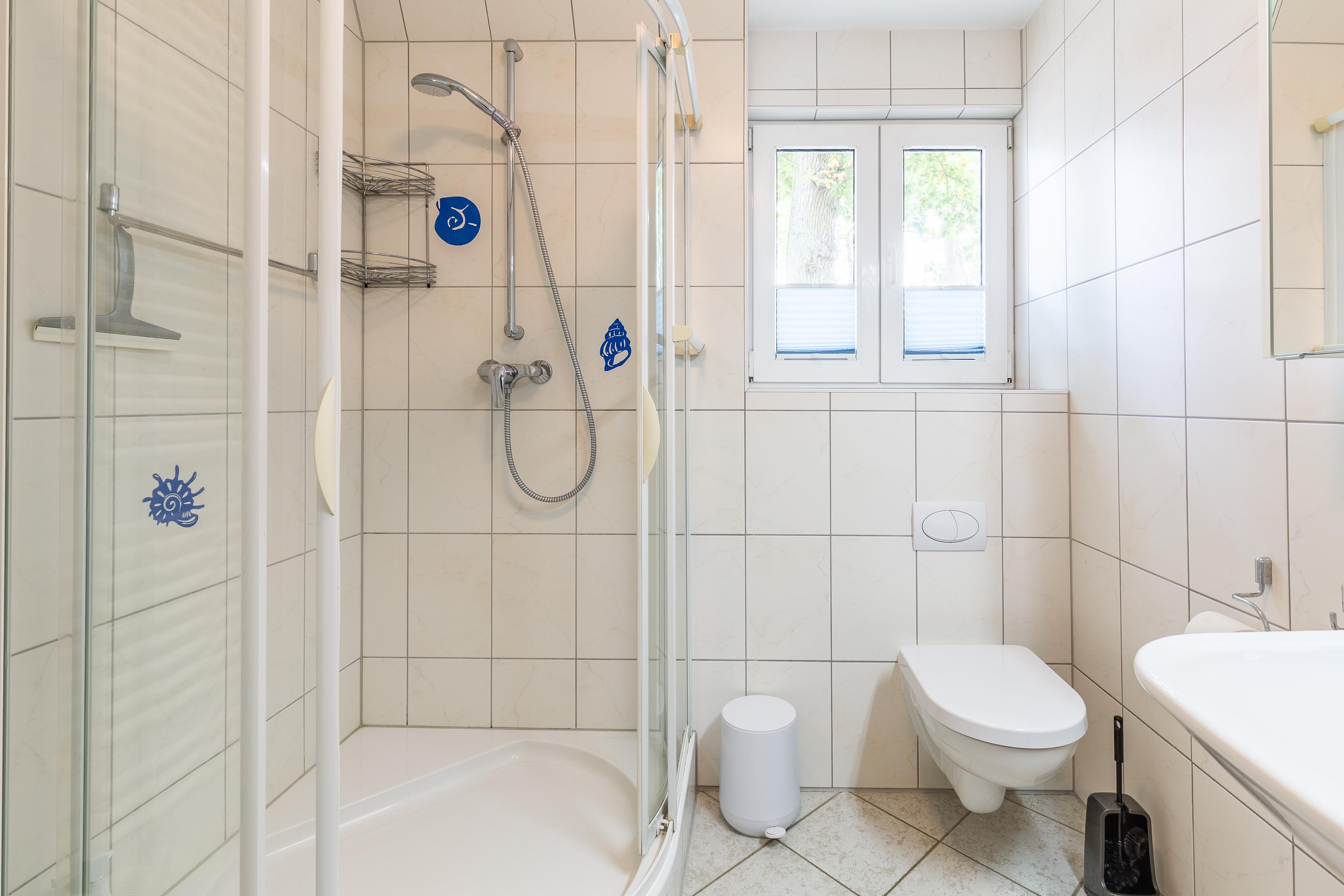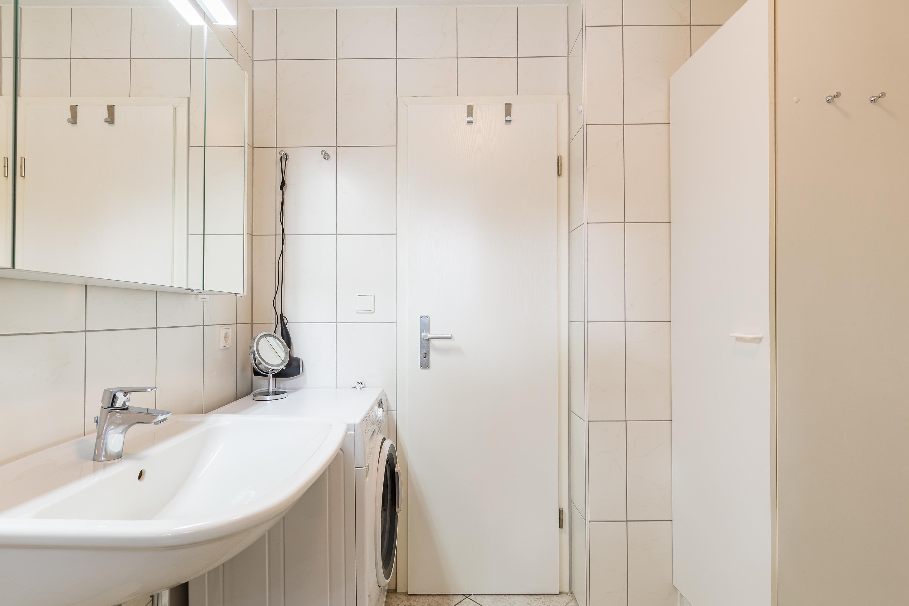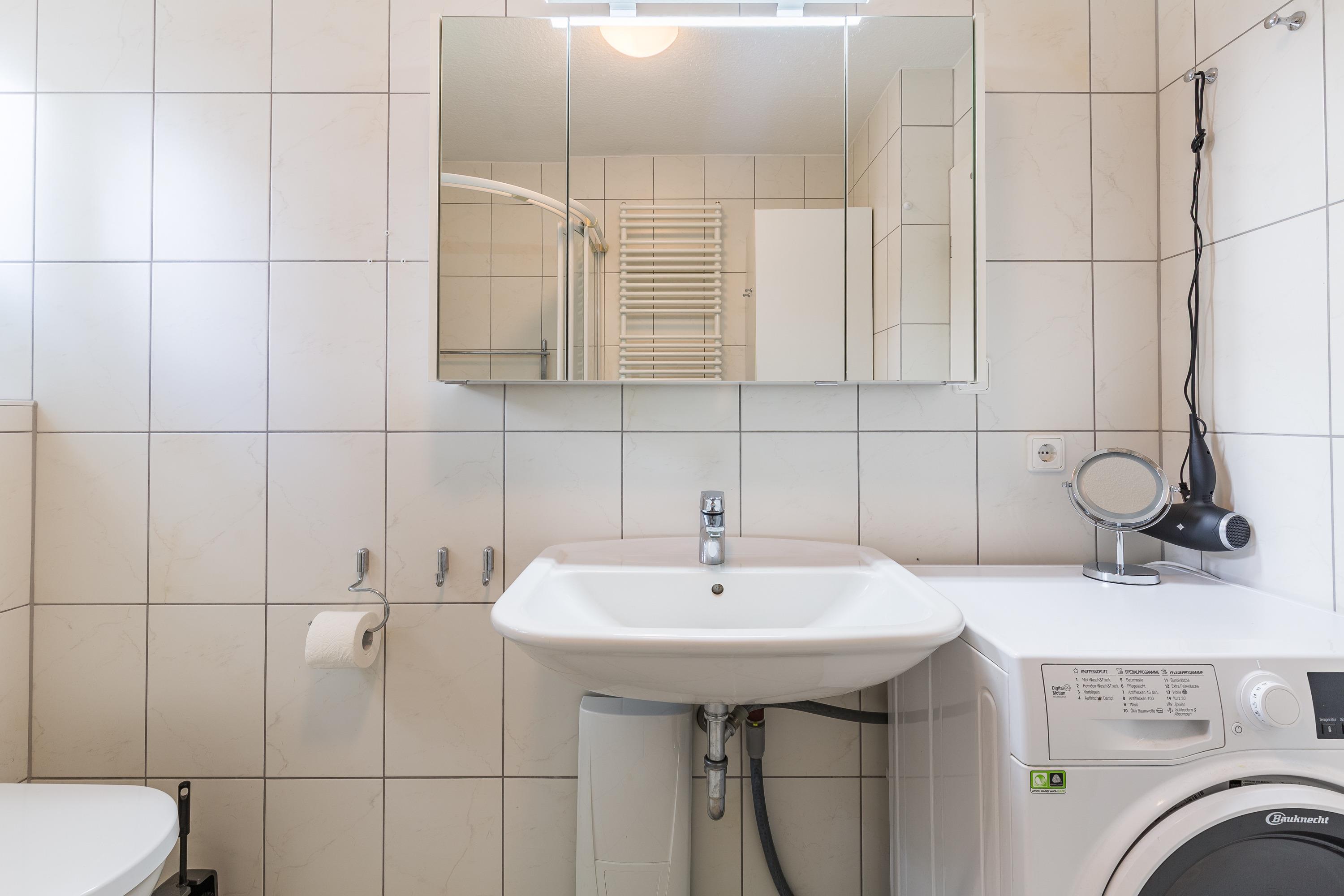 Das helle Badezimmer ist mit Dusche, WC, Waschbecken und einem Kombigerät Waschmaschine/Trockner ausgestattet.